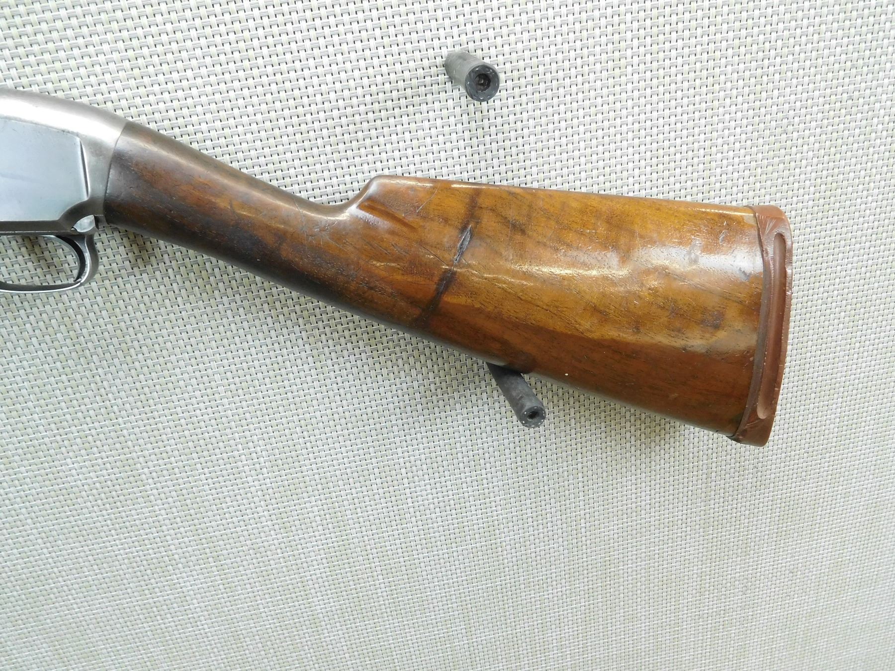 MANUFACTURED IN 1946, FIXED FULL CHOKE, BORE IS VERY GOOD, BEAD FRONT SIGHT, BARREL SHOWS SOME PITTING, REPLACED RUBBER BUTT PAD, LARGE KNOT THAT APPEARS TO LOOK LIKE A CRACK IN THE STOCK, SHOWS EXTENSIVE HANDLING MARKS , SERIAL # 115848 , ACTION: PUMP ACTION SHOTGUN , BARREL LENGTH: 30" , CONDITION: 5/10 , STOCK # 7554 , CLASS: CANADIAN NON RESTRICTED CLASS