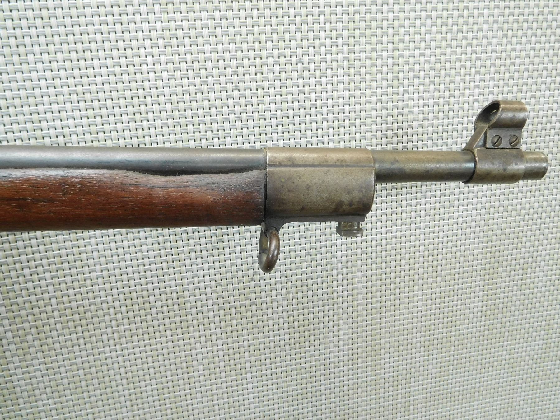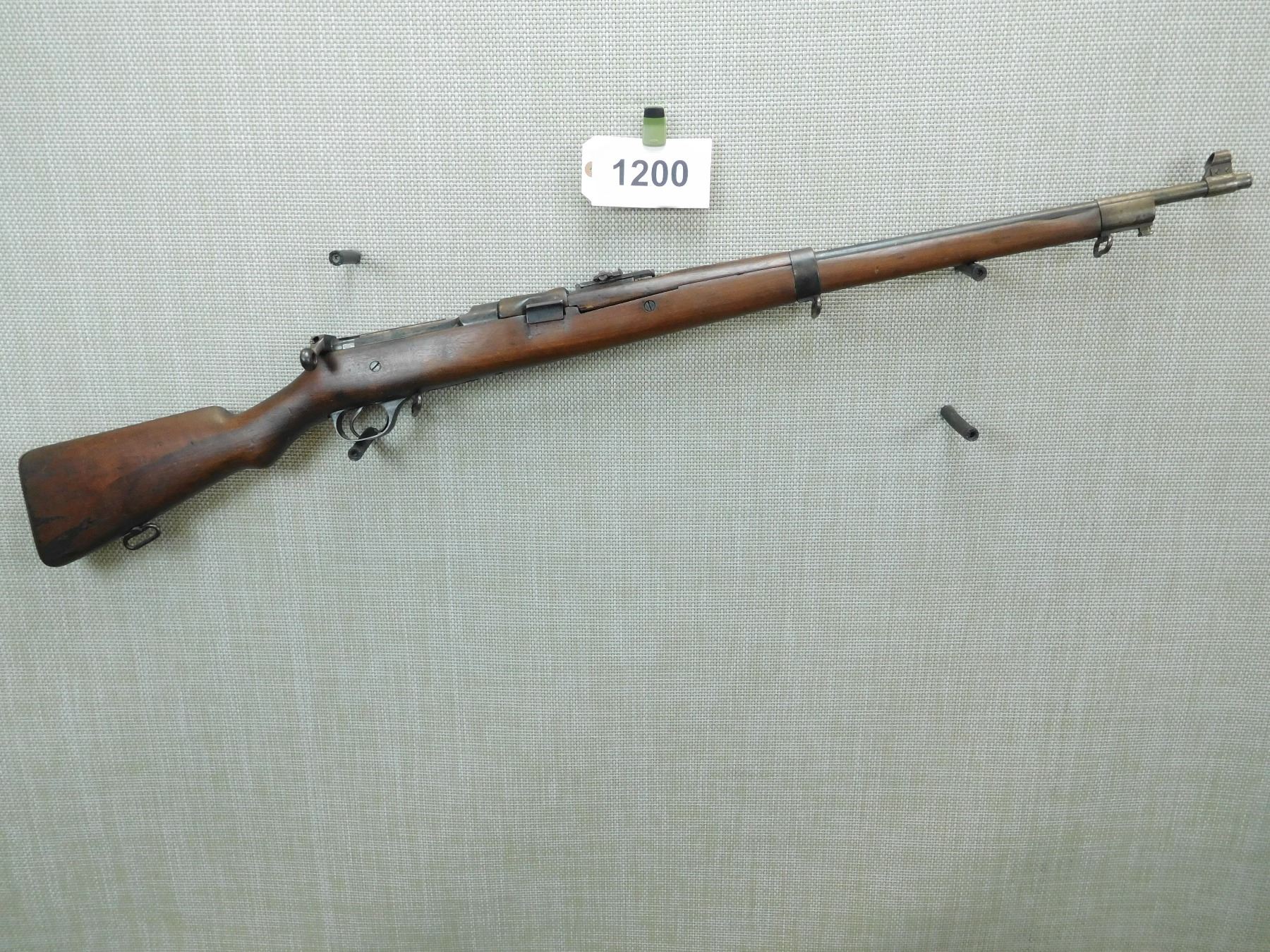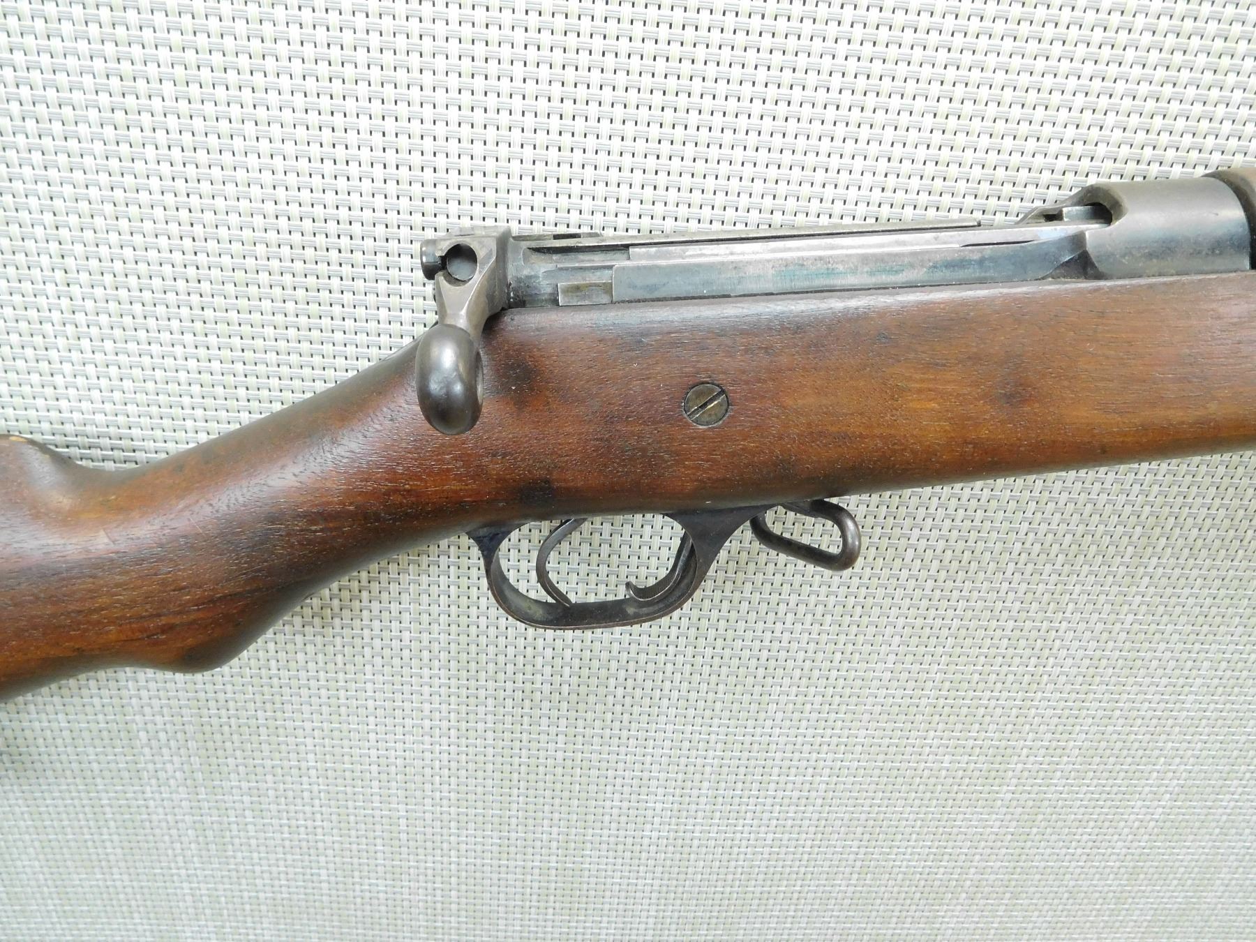 MADE IN 1909, MODEL AND SERIAL # AND YEAR OF MANUFACTURE STILL VISIBLE ON THE STOCK WHICH IS VERY RARE, HOODED FRONT AND ADJUSTABLE REAR SIGHT, SMALL CHIP ON THE FOREND CAP AS WELL AS THE FRONT FOREND, SLING SWIVELS, SHOWS SOME HANDLING MARKS, BORE IS VERY GOOD , SERIAL # 898 , ACTION: BOLT ACTION RIFLE , BARREL LENGTH: 27 1/2" , CONDITION: 7/10 , STOCK # 7556 , CLASS: CANADIAN NON RESTRICTED CLASS