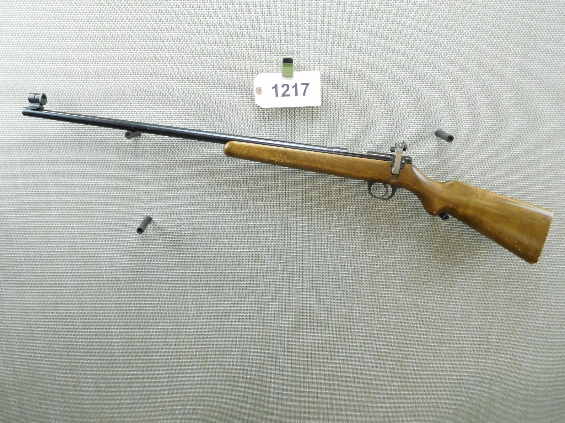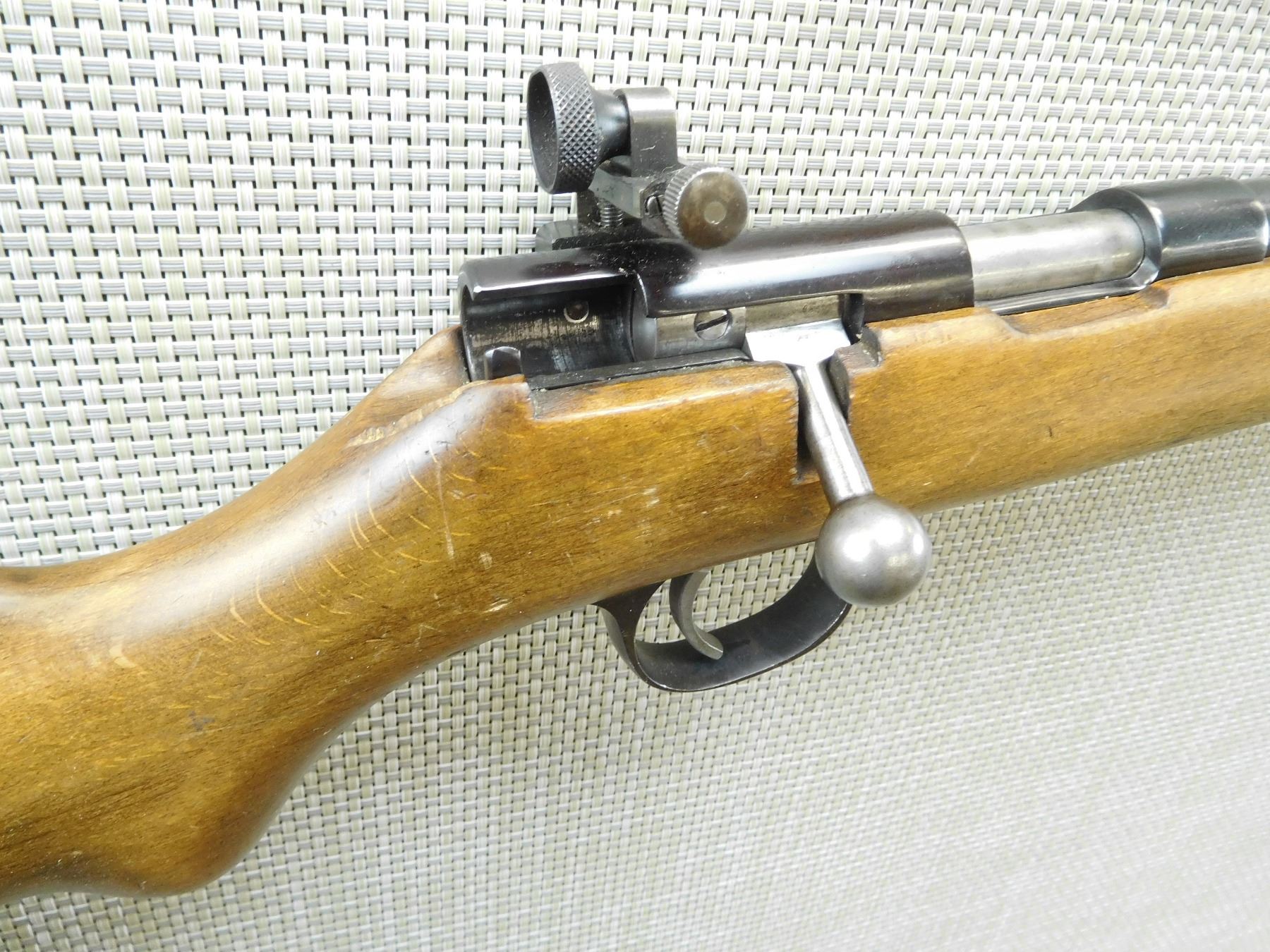 MISMATCHED BOLT MAKES IT ONLY POSSIBLE TO FIRE AFTER THE BOLT HAS BEEN RETURNED BEHIND THE SEAR AND TO DO THIS YOU MUST PULL THE TRIGGER, MISSING INSERT FOR FRONT SIGHT, GOOD BORE, ADJUSTABLE TRIGGER, SHOWS SOME HANDLING MARKS, RETAINS ORIGINAL REAR PEEP SIGHT , SERIAL # 9980 , ACTION: BOLT ACTION RIFLE , BARREL LENGTH: 24" , CONDITION: 5/10 MISMATCHED BOLT MAKE OPERATION NOT EASY , STOCK # 7573 , CLASS: CANADIAN NON RESTRICTED CLASS