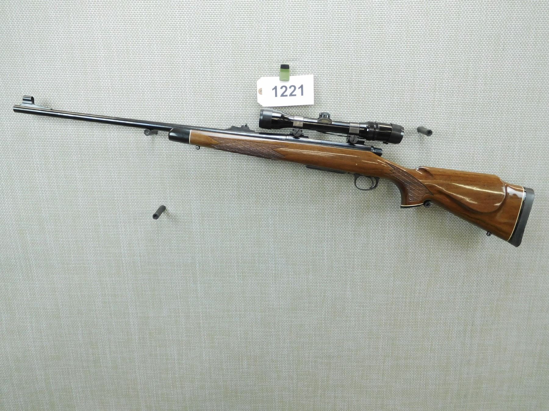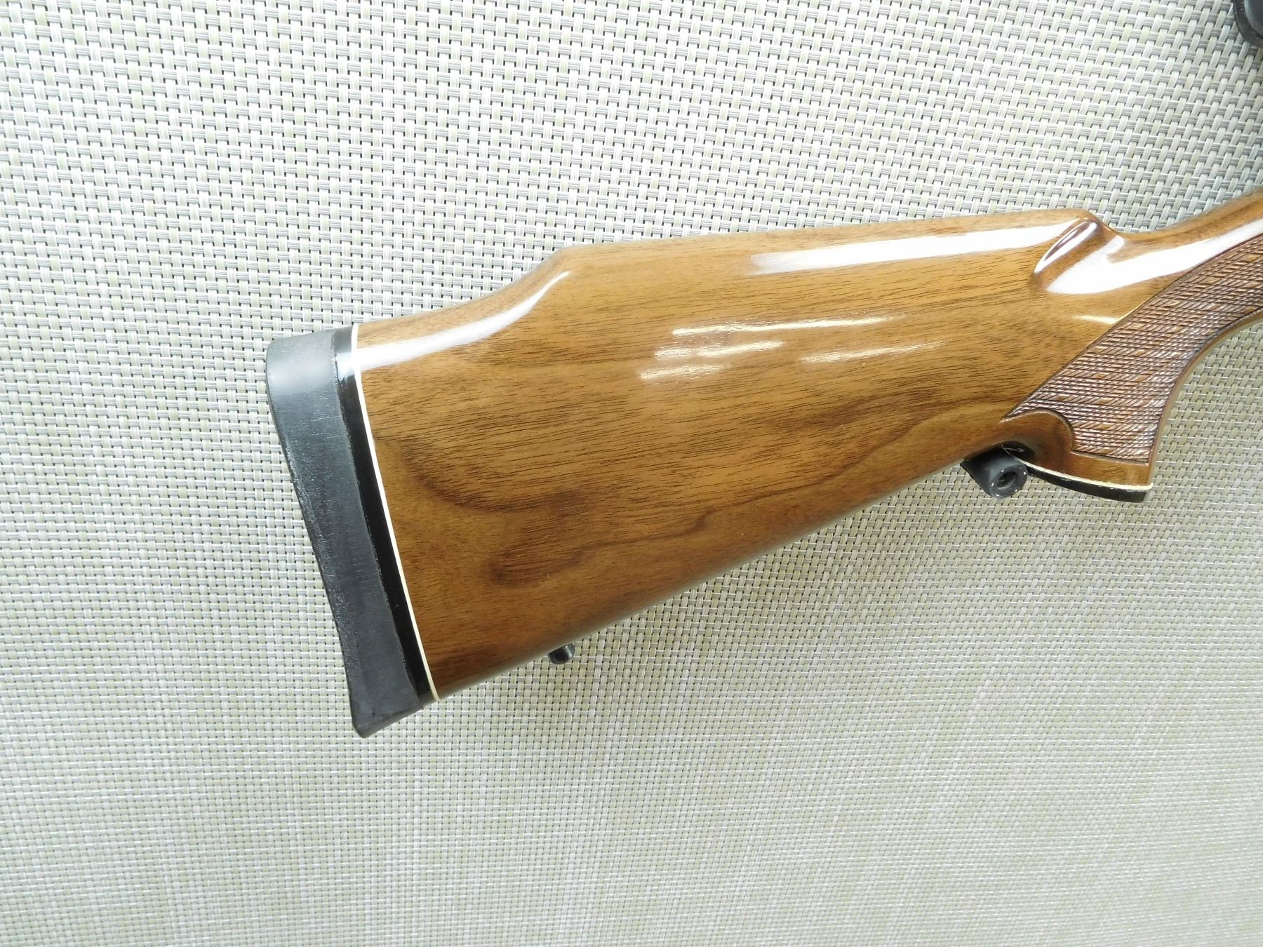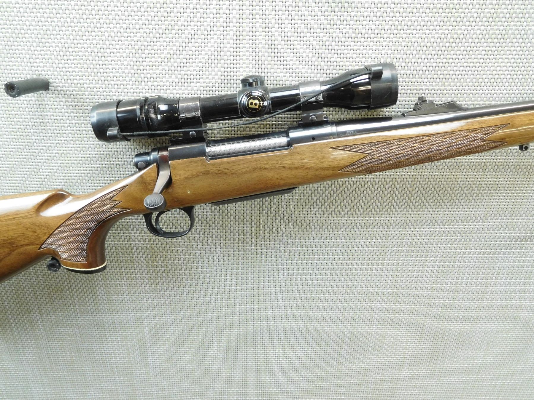 COMES WITH MAGAZINE AND A BUSHNELL 4 - 8 POWER SCOPE, VERY GOOD BORE, HOODED FRONT SIGHT AND RAMP ADJUSTABLE REAR SIGHT, CHECKERED FOREND AND CAPPED PISTOL GRIP BUTT STOCK, RUBBER BUTT PAD WITH WHITE LINE SPACER, SLING SWIVEL STUDS, SHOWS SOME HANDLING MARKS , SERIAL # B6696190 , ACTION: BOLT ACTION RIFLE , BARREL LENGTH: 24" , CONDITION: 9/10 , STOCK # 7577 , CLASS: CANADIAN NON RESTRICTED CLASS
