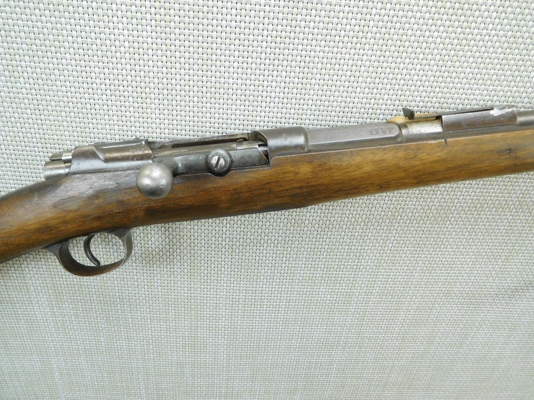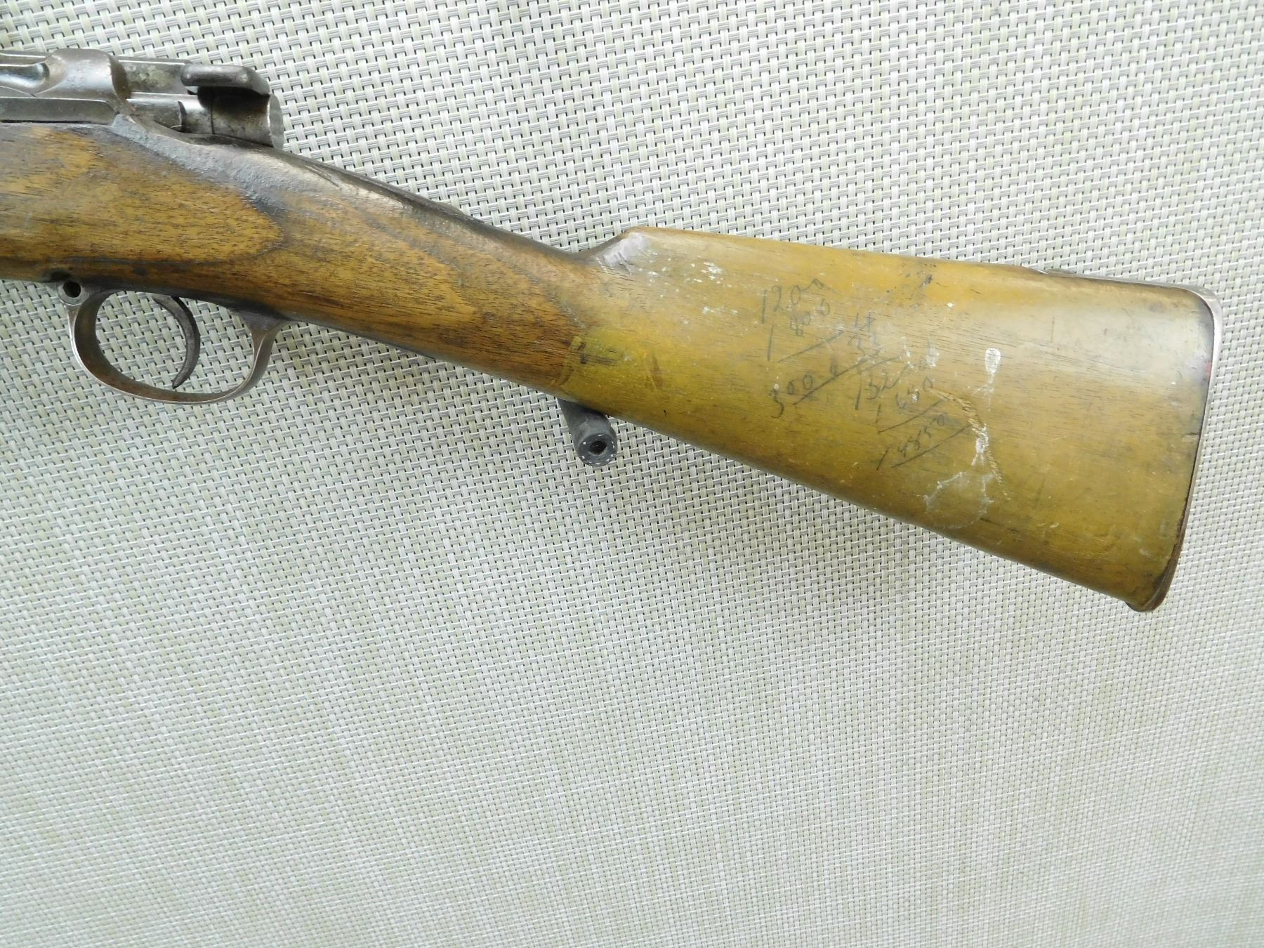 MADE IN 1887, BORE IS DARK, BLADE FRONT AND REPLACED REAR SIGHT, MISSING THE ELEVATOR, SPORTERIZED VERSION OF A MILITARY FIREARM, SLING SWIVELS MISSING THE REAR SLING SWIVEL, MAGAZINE TUBE HAS BEEN REDUCED , SERIAL # 5914A , ACTION: BOLT ACTION RIFLE , BARREL LENGTH: 32" , CONDITION: 4/10 , STOCK # 7593 , CLASS: CANADIAN NON RESTRICTED CLASS