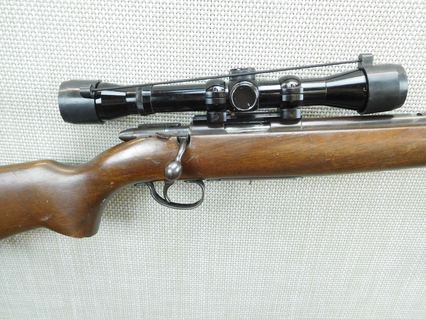 DOES NOT COME WITH A MAGAZINE, GOOD BORE, BLADE FRONT AND ABSENT REAR SIGHT, HAS A TASCO 2.5 SCOPE, PLASTIC BUTT PLATE, SHOWS SOME HANDLING MARKS , SERIAL # N/A , ACTION: BOLT ACTION RIFLE , BARREL LENGTH: 25" , CONDITION: 5/10 , STOCK # 7596 , CLASS: CANADIAN NON RESTRICTED CLASS