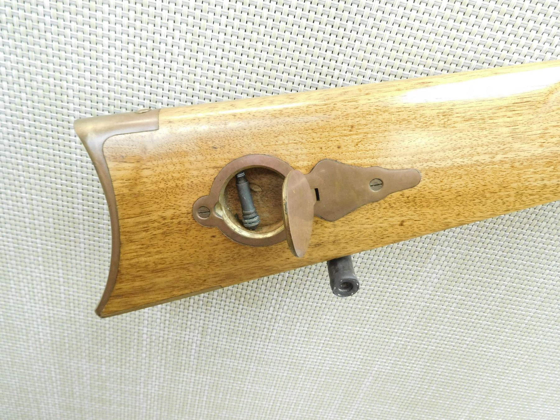 REPLACED RAM ROD, OCTAGONAL BARREL, BRASS BLADE FRONT SIGHT AND ADJUSTABLE REAR SIGHT, BRASS PATCH BOX AND BUTT PLATE, CASE HARDENED SIDE LOCK ACTION, EXTRA JAG IN PATCH BOX, SET TRIGGER , SERIAL # 49863 , ACTION: PERCUSSION RIFLE , BARREL LENGTH: 26" , CONDITION: 7/10 , STOCK # 7598 , CLASS: CANADIAN NON RESTRICTED CLASS