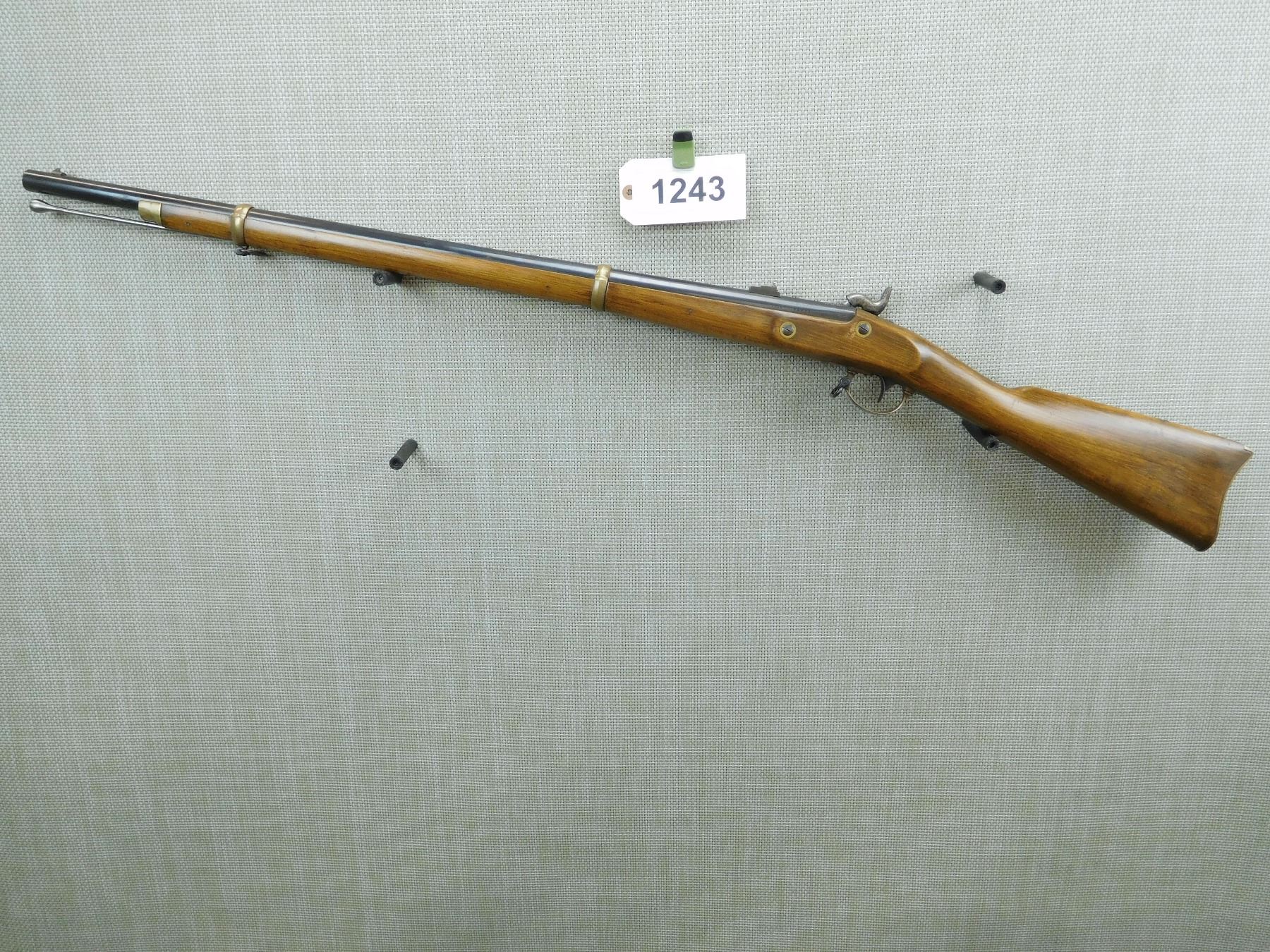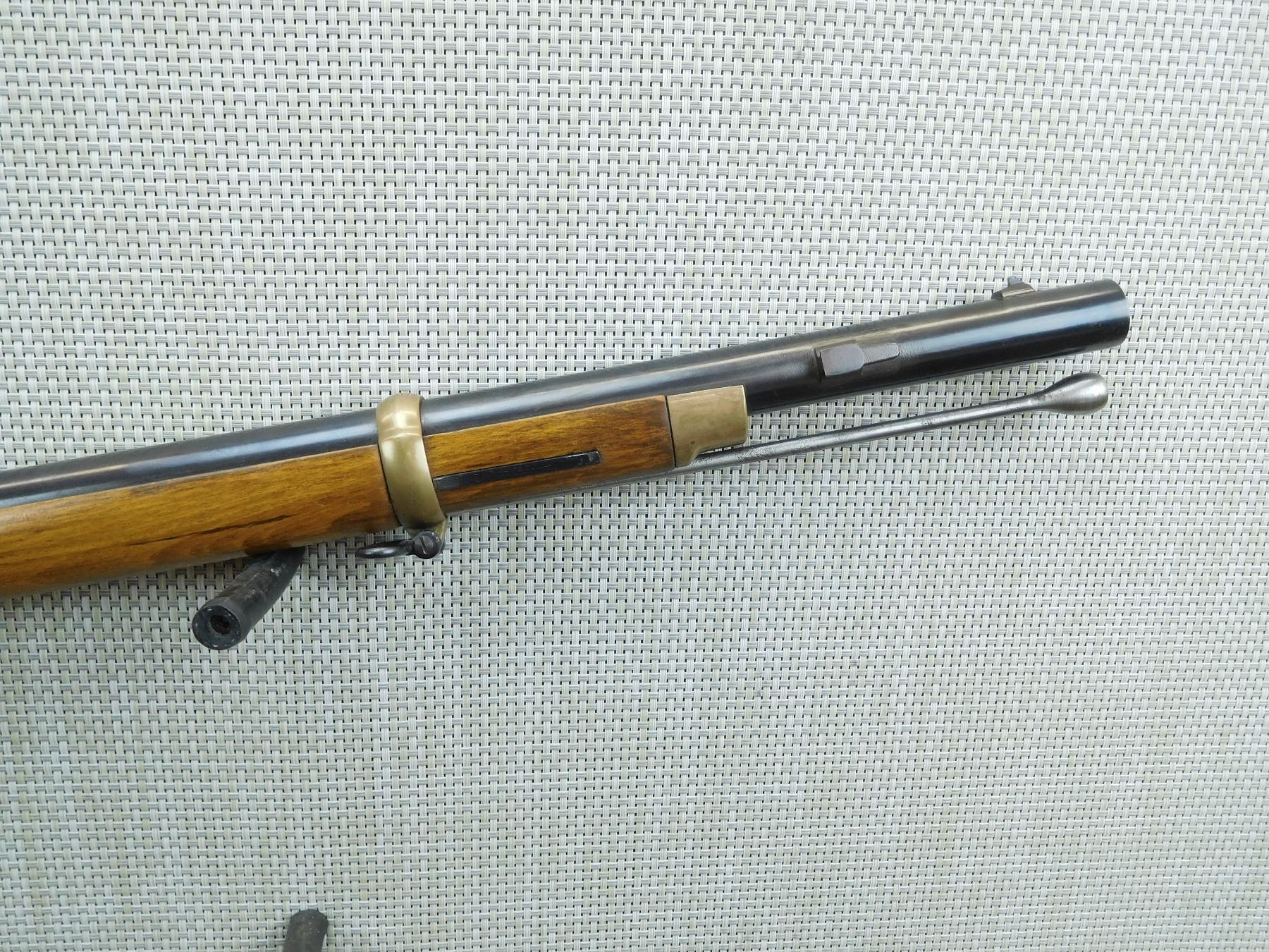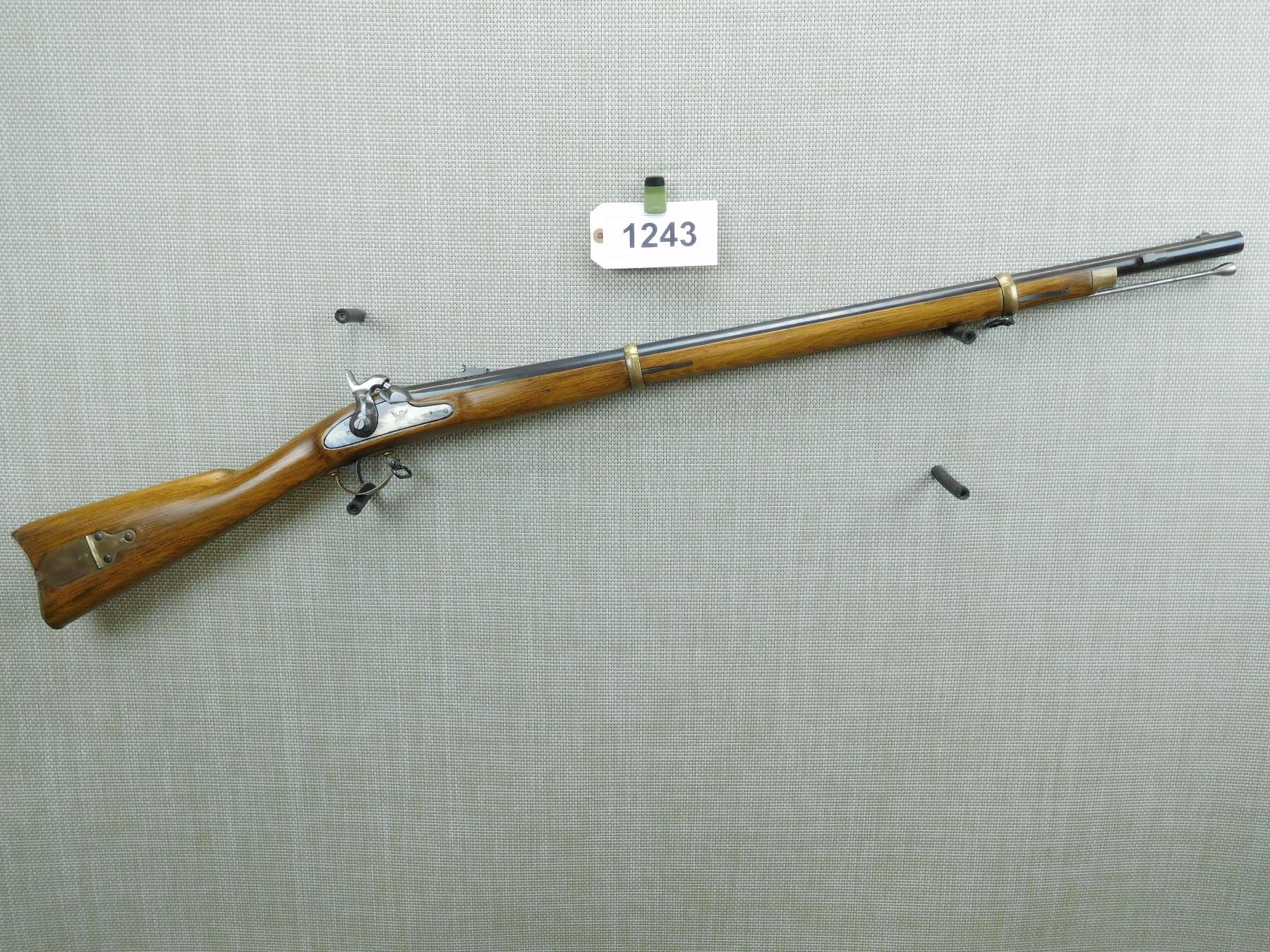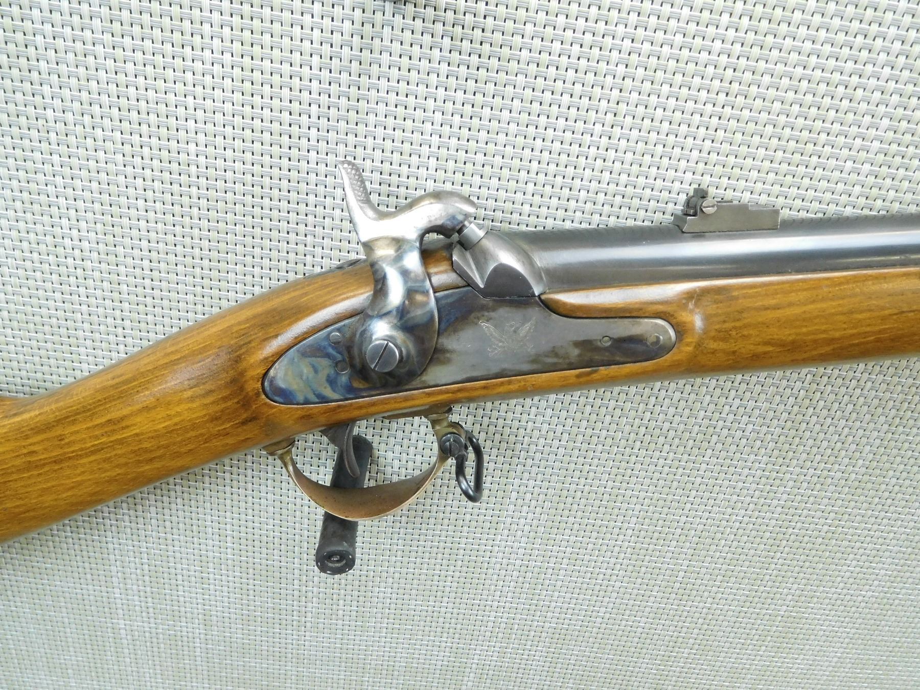 RAM ROD SHOWS MINOR PITTING, DOVETAIL FRONT AND FLIP ADJUSTABLE REAR SIGHT, CASE HARDENED RECEIVER, CASE HARDENED SIDE LOCK WITH EAGLE MOTIF, SHOWS SOME HANDLING MARKS, COMPLETE WITH BAYONET LUG, BORE IS EXCELLENT , SERIAL # 29733 , ACTION: PERCUSSION RIFLE , BARREL LENGTH: 33" , CONDITION: 7/10 , STOCK # 7599 , CLASS: CANADIAN NON RESTRICTED CLASS