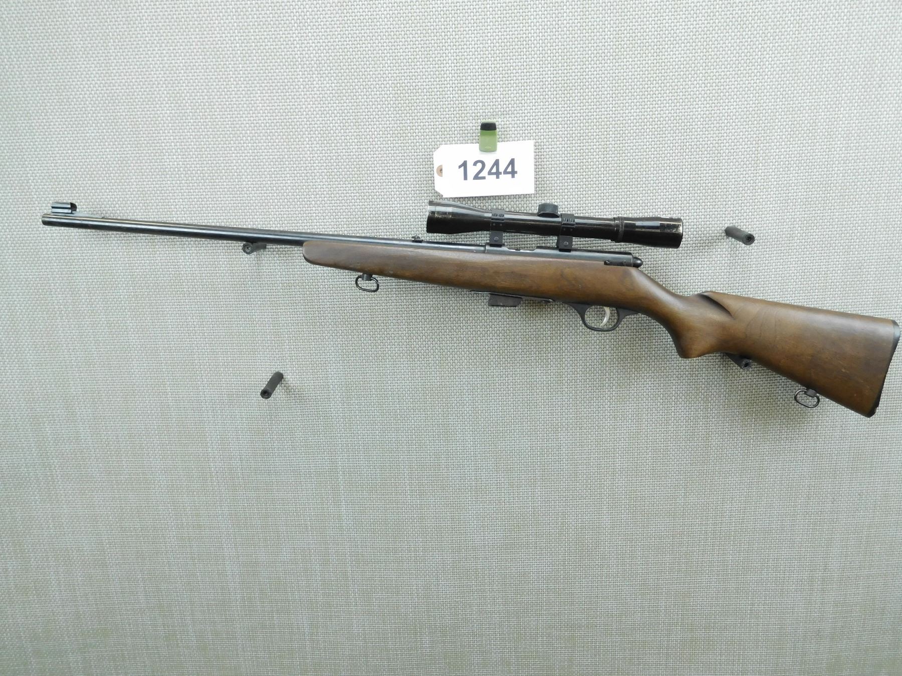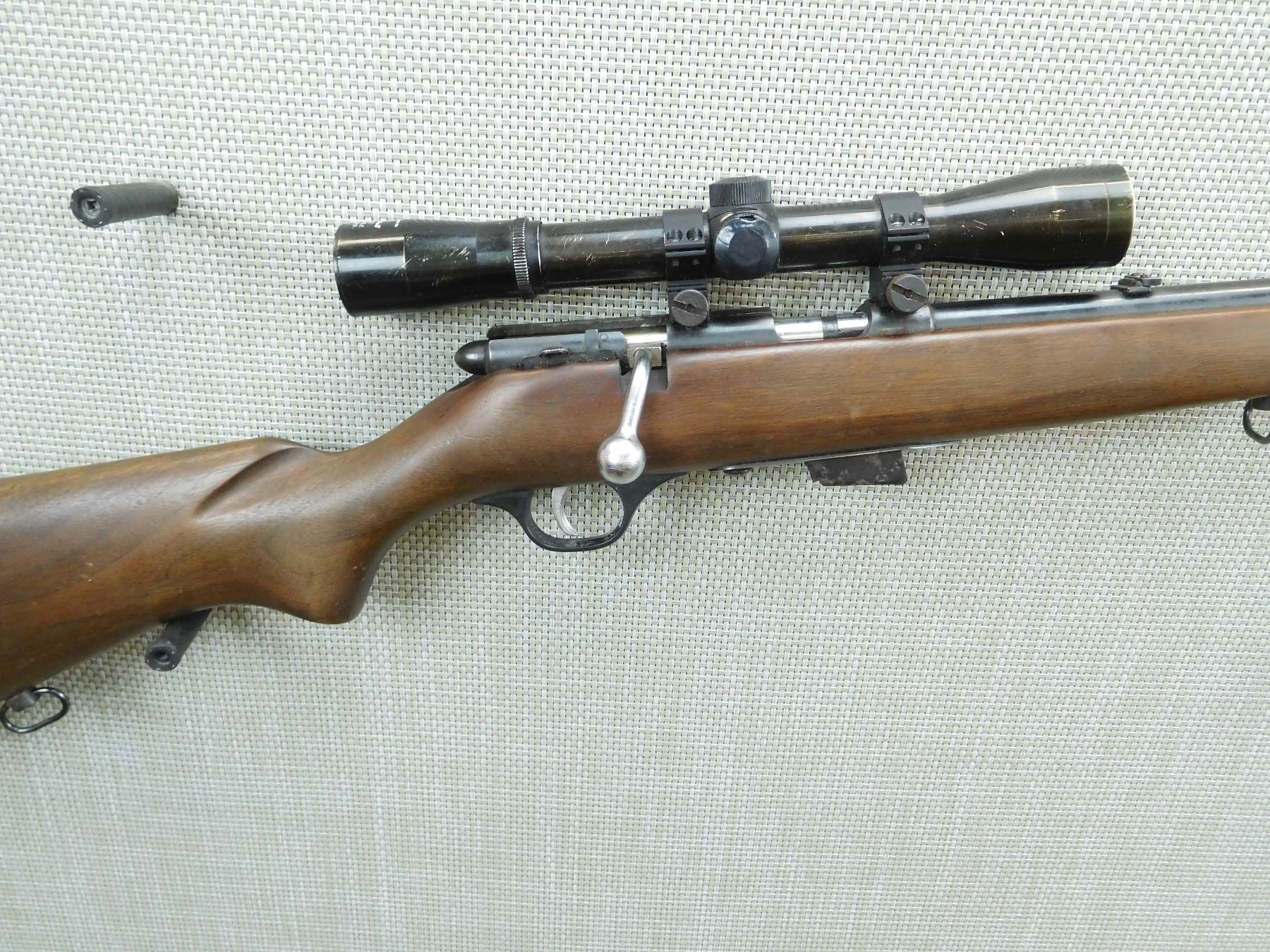 COMES WITH 2 MAGAZINES AND BELL 4 X SCOPE, GOOD BORE, HOODED FRONT AND FLIP ADJUSTABLE REAR SIGHT, SLING SWIVELS WITH EXTRA HOLE FOR REAR SLING SWIVEL, PLASTIC BUTT PLATE , SERIAL # N/A , ACTION: BOLT ACTION RILFE , BARREL LENGTH: 22" , CONDITION: 5/10 , STOCK # 7600 , CLASS: CANADIAN NON RESTRICTED CLASS