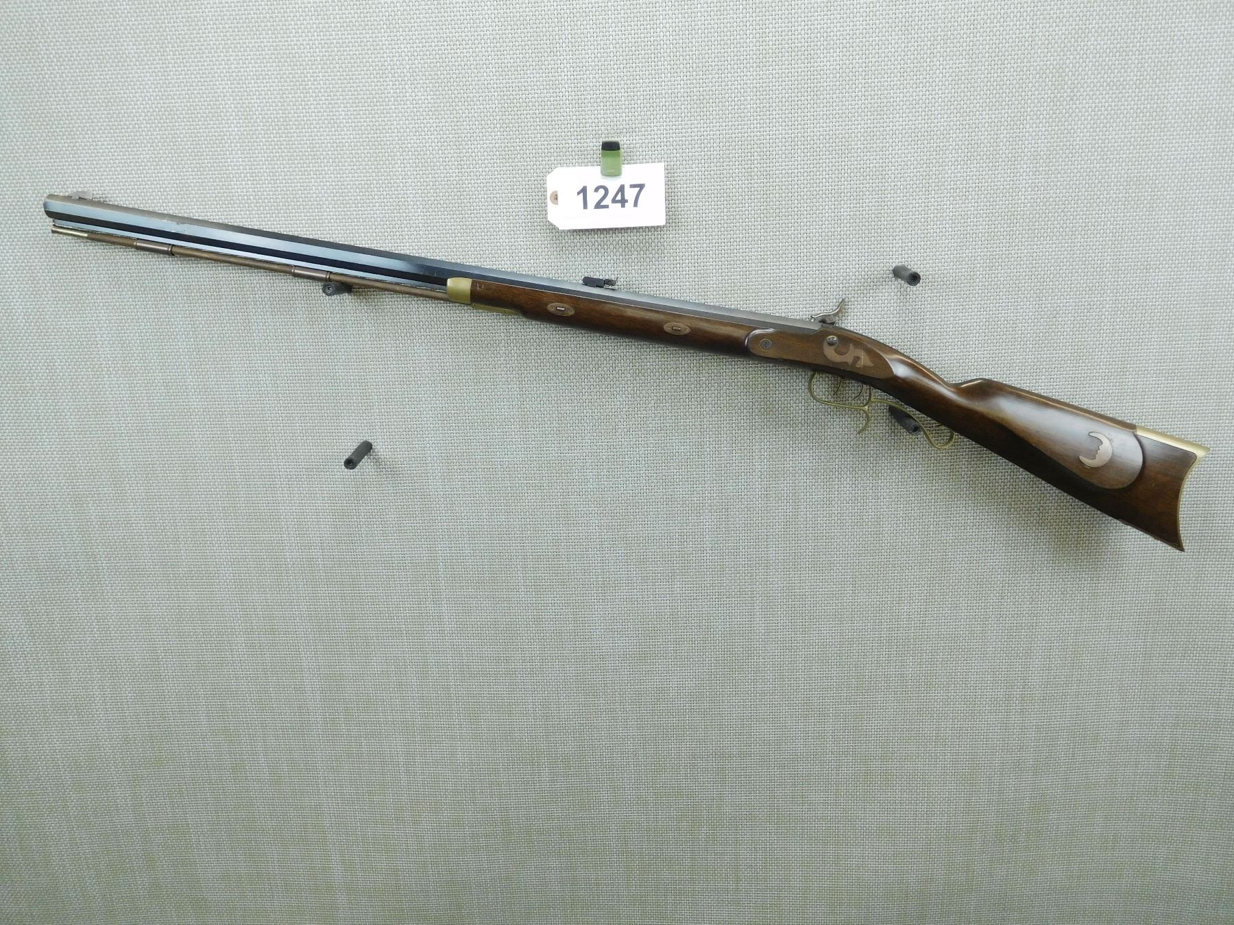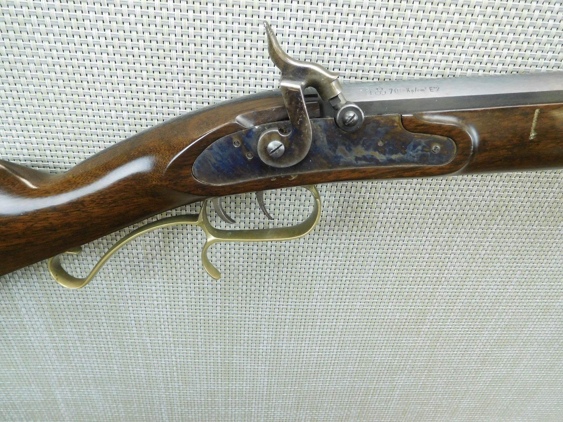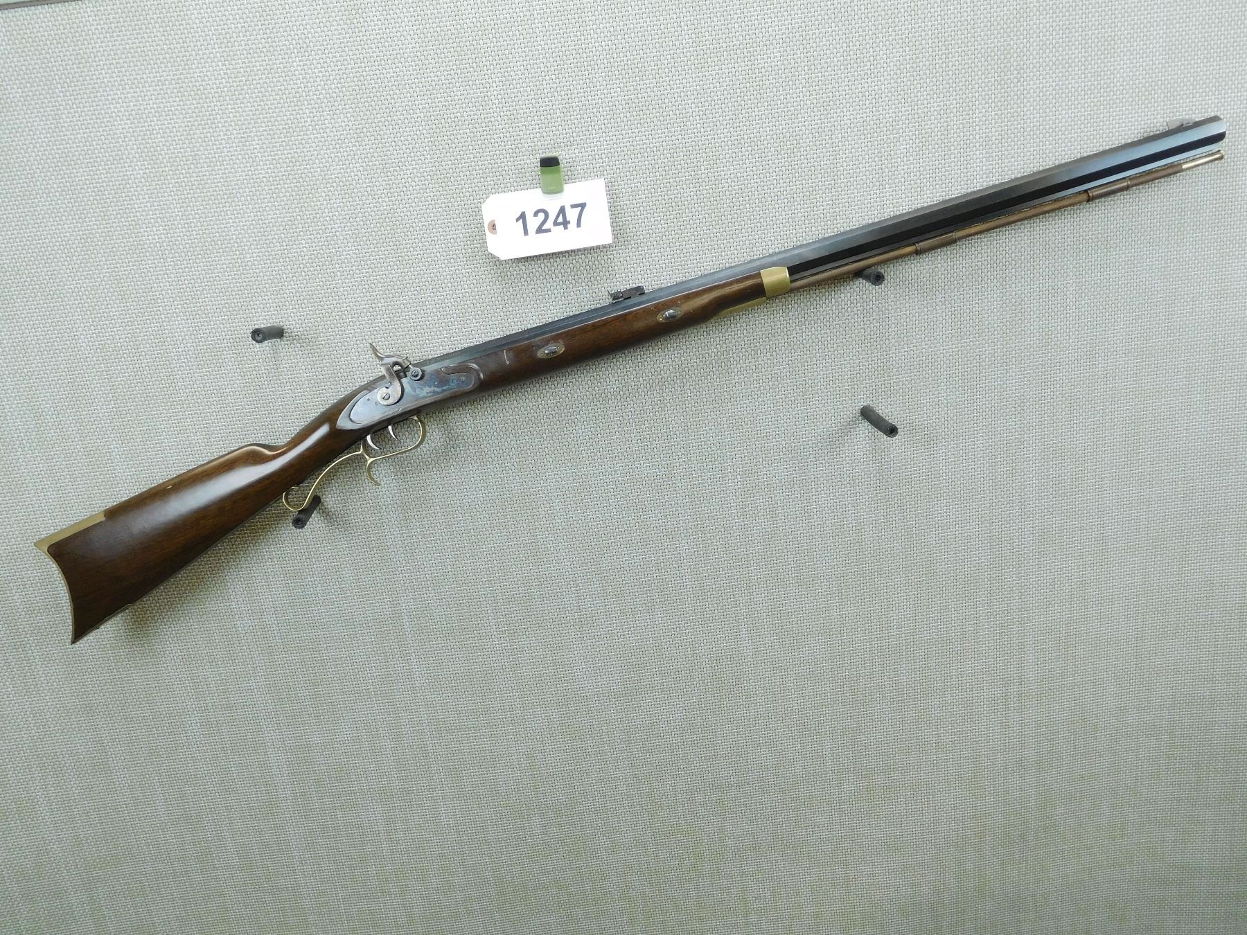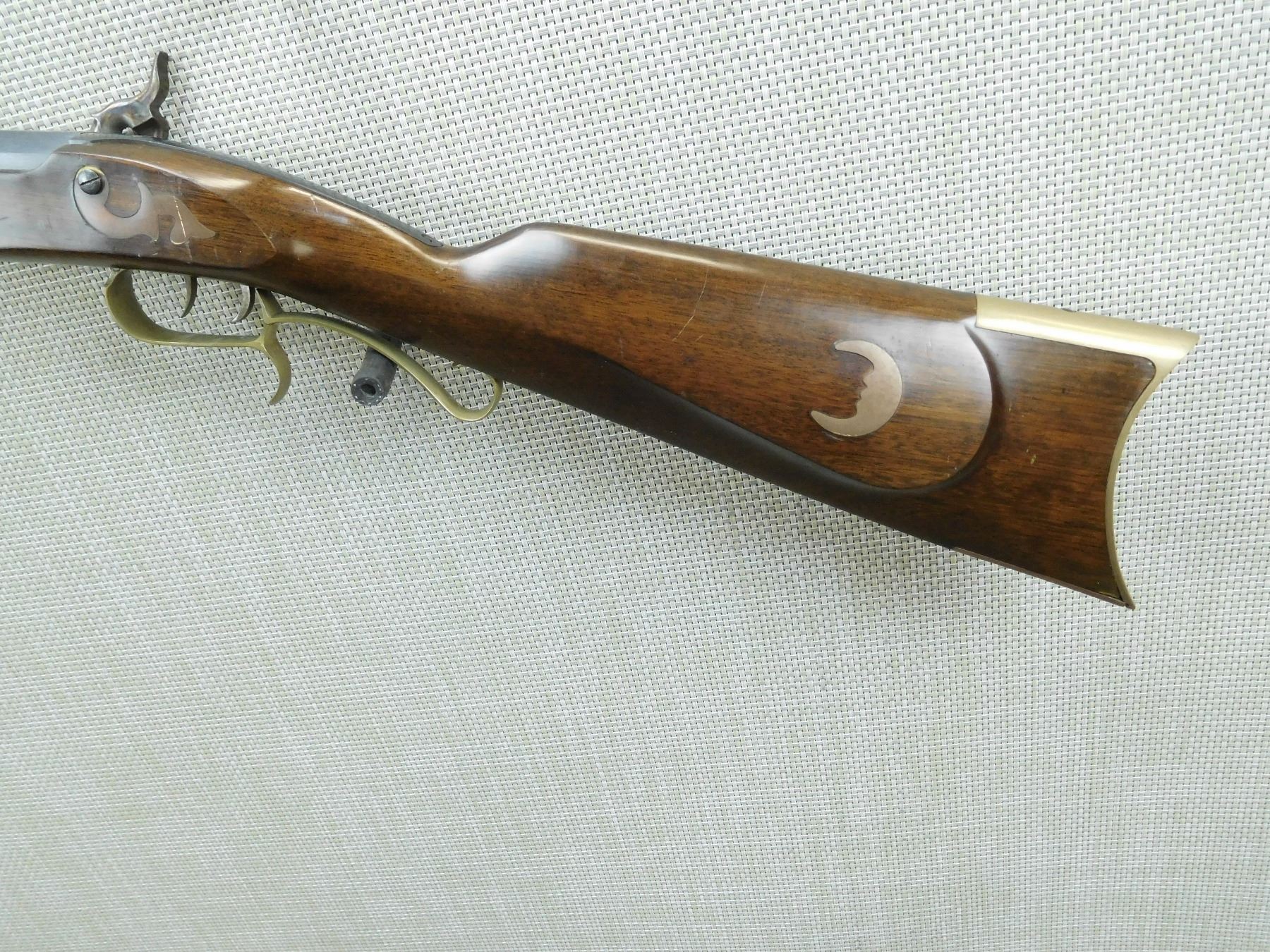MADE IN SPAIN, OCTAGONAL BULL BARREL, RAM ROD, BRASS BLADE FRONT SIGHT AND ADJUSTABLE REAR SIGHT, JEWELLED TRANSVERSE WEDGES RETAINING THE BARREL, FANCY TRIGGER GUARD AND SET TRIGGER, CASE HARDENED LOCK PLATE, SHOWS SOME HANDLING WEAR , SERIAL # 043612 , ACTION: PERCUSSION RIFLE , BARREL LENGTH: 32" , CONDITION: 6/10 , STOCK # 7603 , CLASS: CANADIAN NON RESTRICTED CLASS