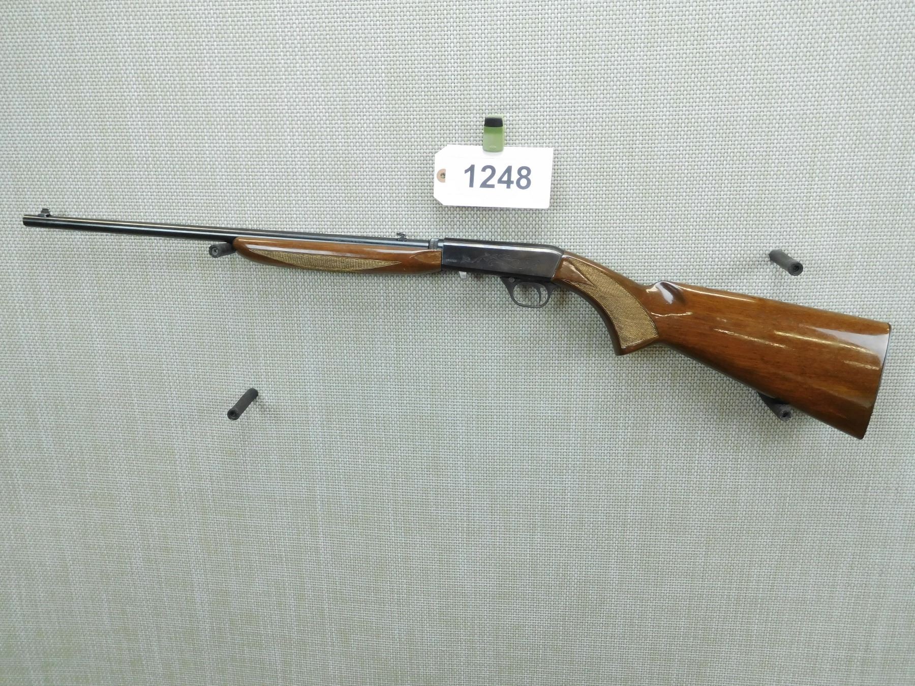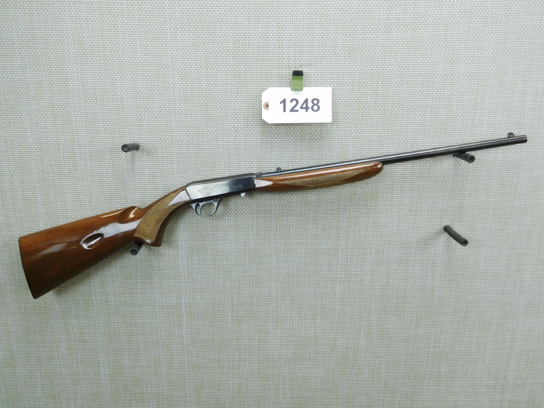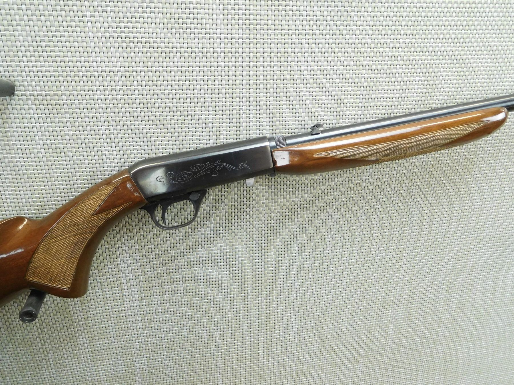 COMES WITH CASE, COPY OF A BROWNING SEMI AUTOMATIC, VERY GOOD BORE, DOVETAIL FRONT AND FLIP ADJUSTABLE REAR SIGHT, CHECKERED FOREND AND SEMI PISTOL GRIP FORESTOCK, MAGAZINE TUBE IN THE BUTT , SERIAL # 208265 , ACTION: SEMI AUTOMATIC RIFLE , BARREL LENGTH: 19" , CONDITION: 8/10 , STOCK # 7604 , CLASS: CANADIAN NON RESTRICTED CLASS