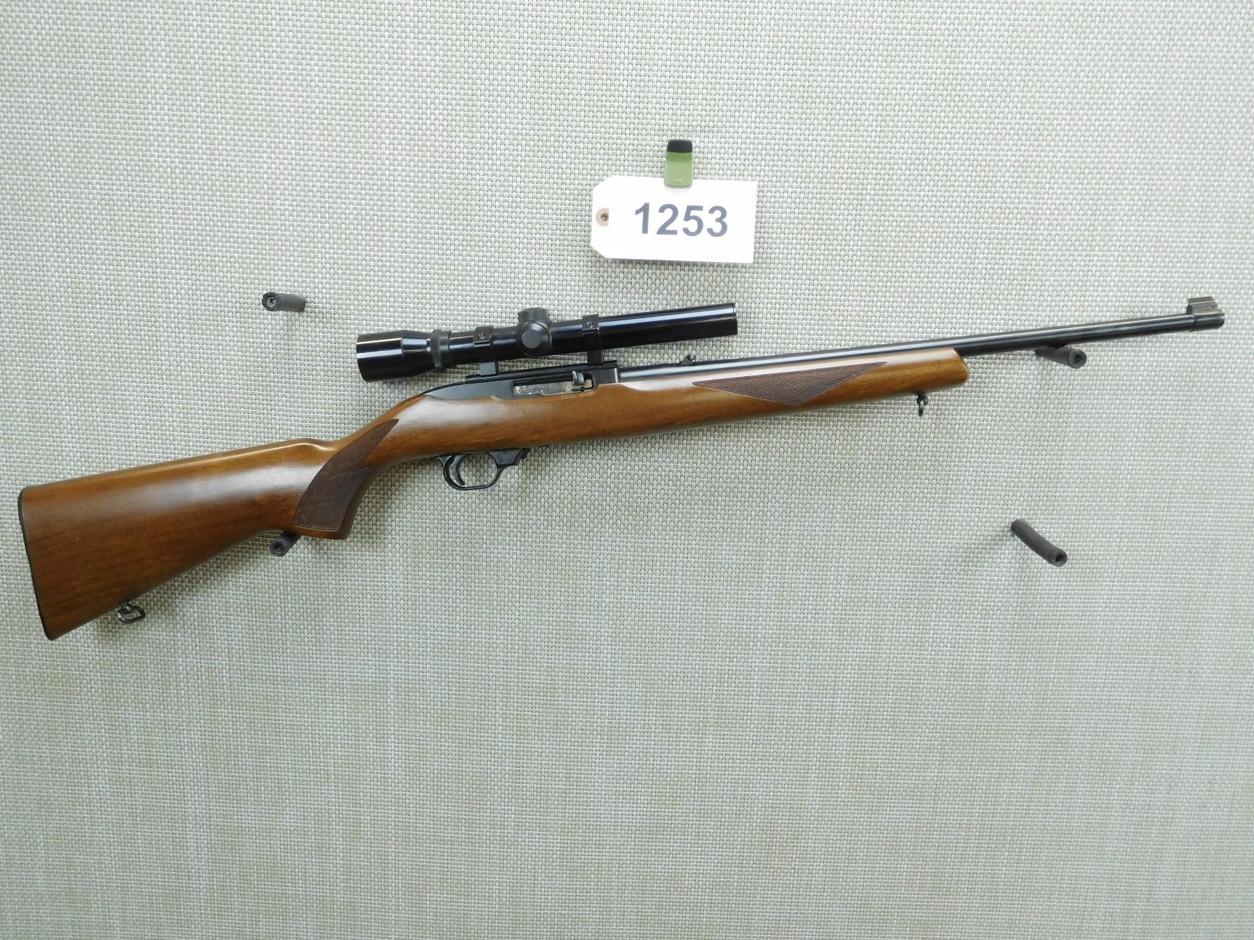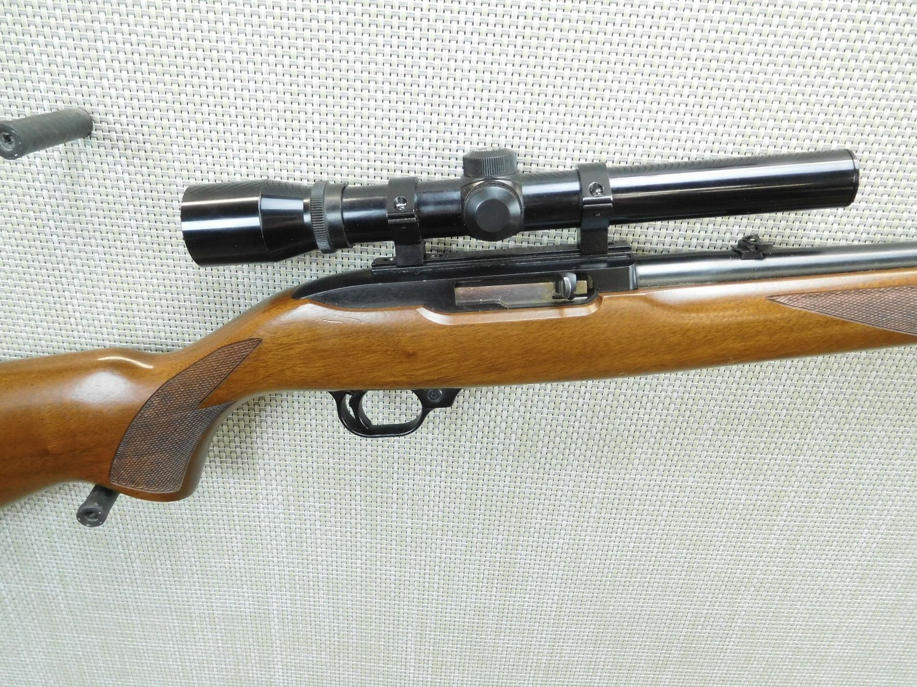 COMES WITH MAGAZINE, BUSHNELL BANNER SCOPE, DOVETAIL FRONT AND FLIP ADJUSTABLE REAR SIGHT, CHECKERED FOREND AND CHECKERED SEMI PISTOL GRIP STOCK, SLING SWIVELS, PLASTIC BUTT PLATE, BORE IS EXCELLENT, APPEARS AS NEW , SERIAL # 12517729 , ACTION: SEMI AUTOMATIC RIFLE , BARREL LENGTH: 18 1/2" , CONDITION: 9/10 , STOCK # 7609 , CLASS: CANADIAN NON RESTRICTED CLASS