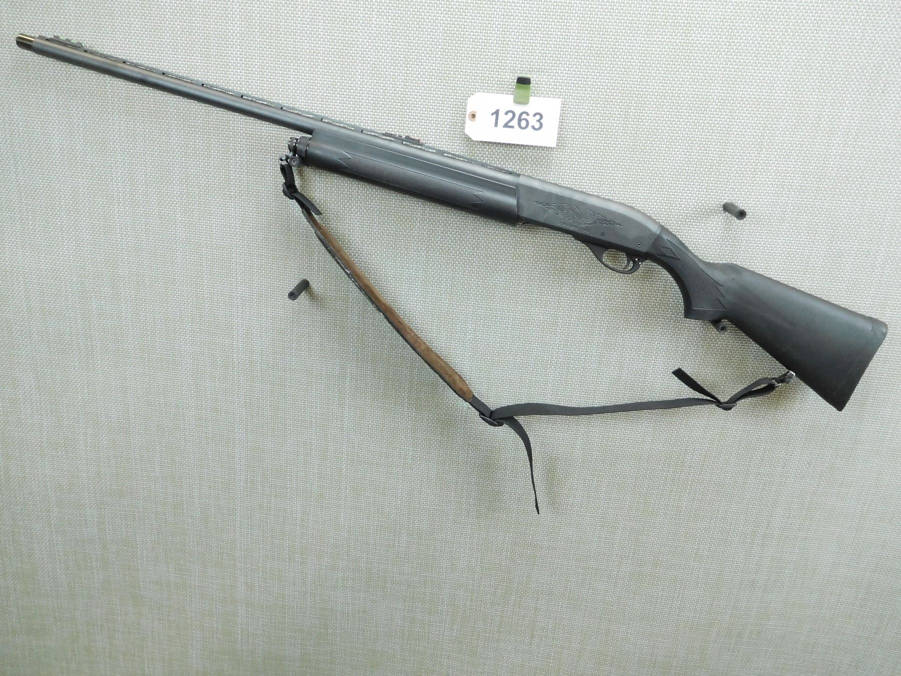 COMES WITH AN 2 CHOKE TUBES, CHOKE TUBE WRENCH, REM OIL, FIBEROPTIC FRONT AND FIBEROPTIC MID BEAD SIGHT ON RAISED VENTED BARREL, VERY GOOD BORE, BLACK SYNTHETIC STOCK WITH NYLON AND LEATHER SLING, RUBBER RECOIL PAD , SERIAL # R188323V , ACTION: SEMI AUTOMATIC SHOTGUN , BARREL LENGTH: 28" , CONDITION: 8/10 , STOCK # 7619 , CLASS: CANADIAN NON RESTRICTED CLASS