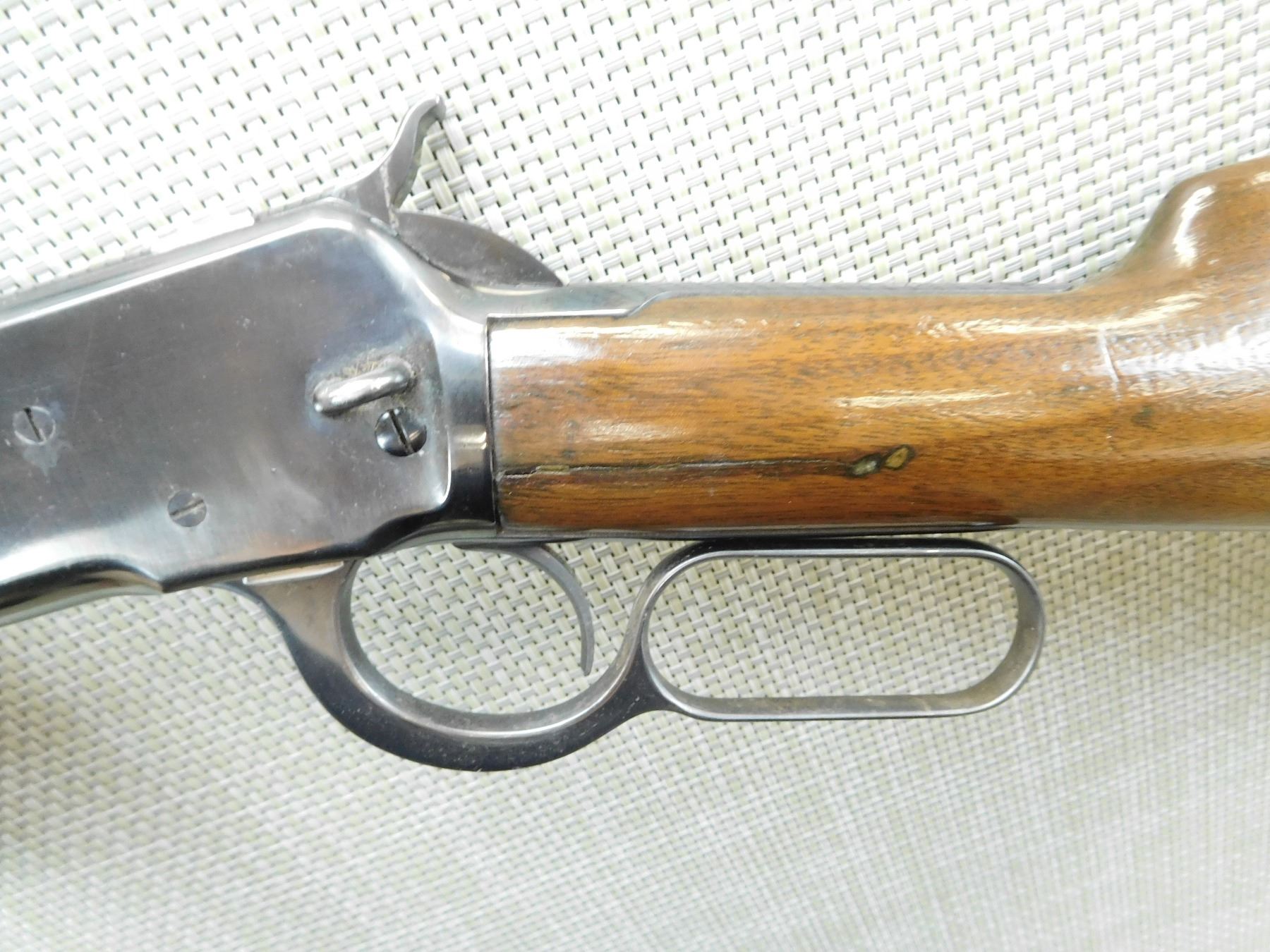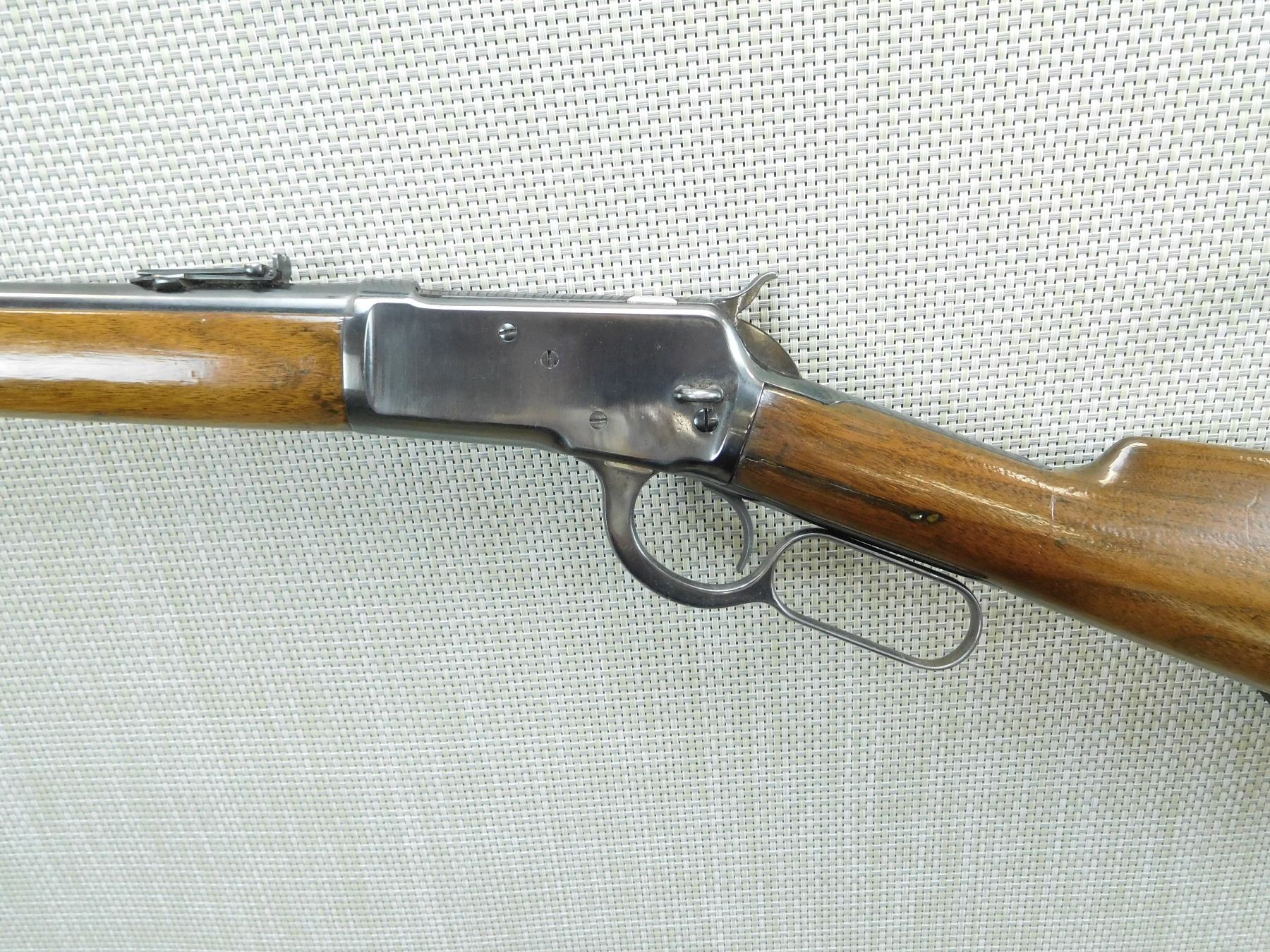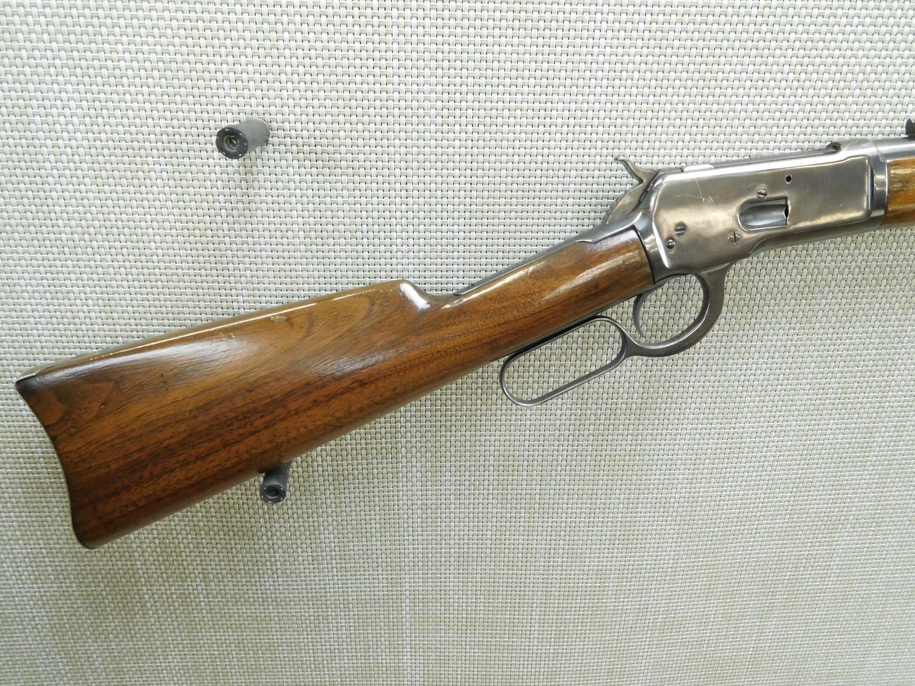 MISSING THE SADDLE RING, MANUFACTURED IN 1902, FAIR BORE, REPLACED FRONT SIGHT AND ORGINAL ADJUSTABLE REAR SIGHT, APPEARS TO HAVE BEEN REBLUED, CRACK IN BUTT STOCK ABOVE THE LEVER, SHOWS SOME HANDLING MARKS , SERIAL # 220352 , ACTION: LEVER ACTION RIFLE , BARREL LENGTH: 20" , CONDITION: 6/10 , STOCK # 7623 , CLASS: CANADIAN NON RESTRICTED CLASS