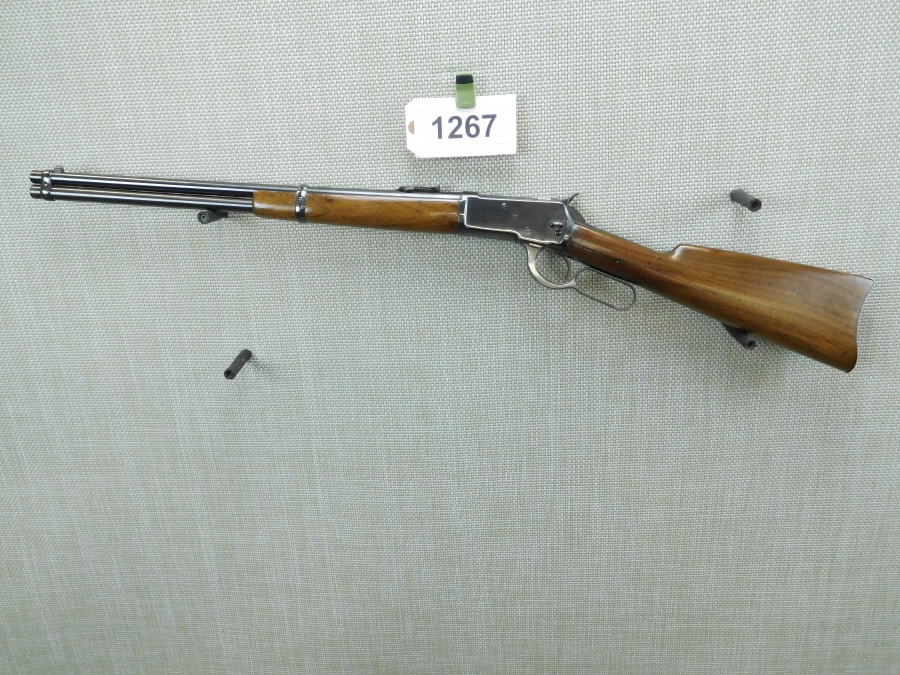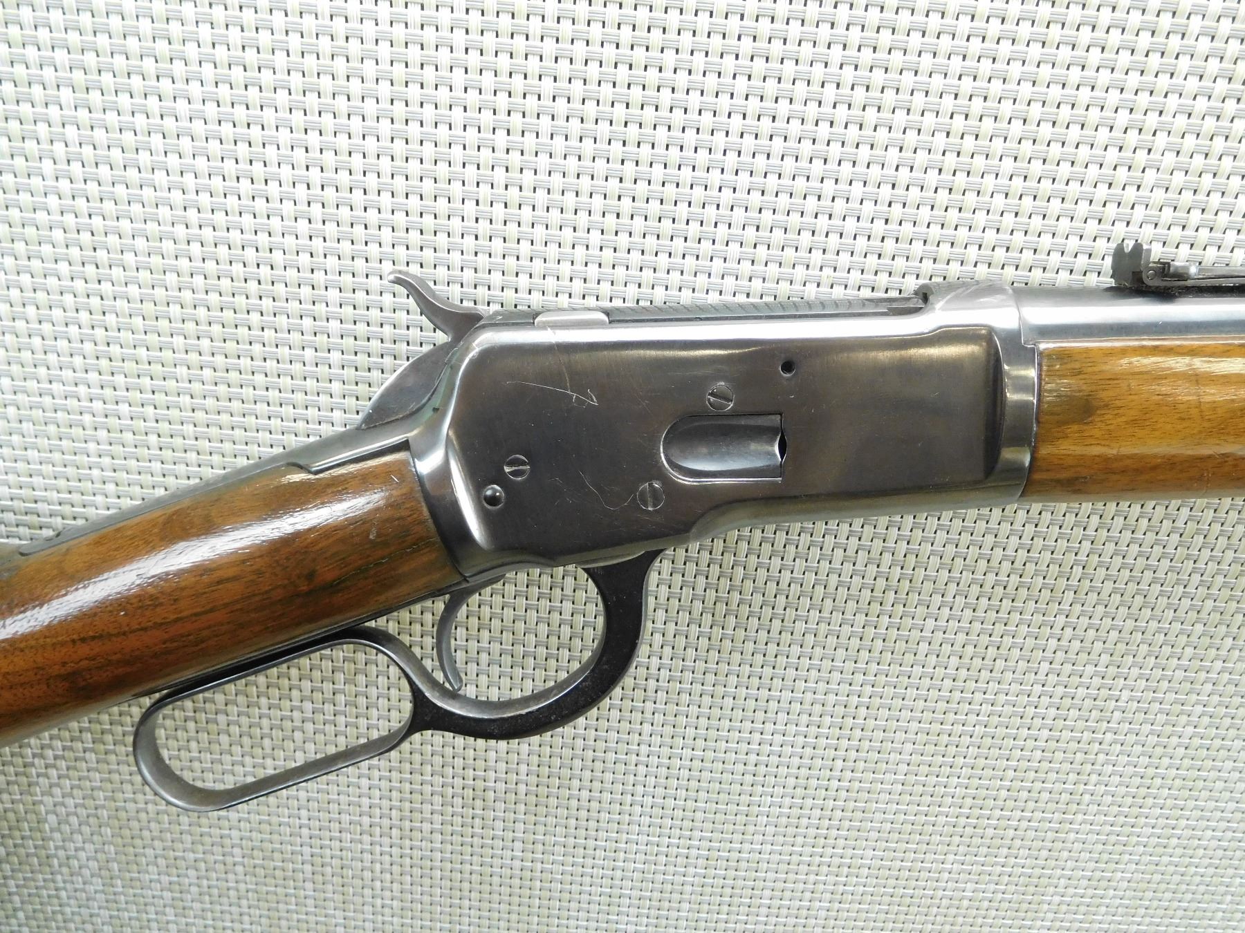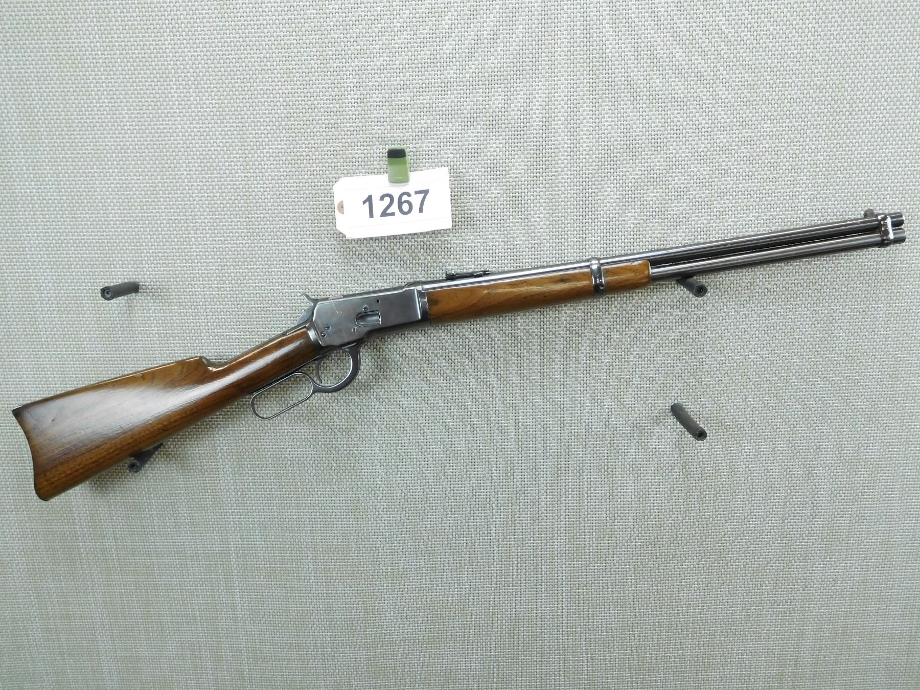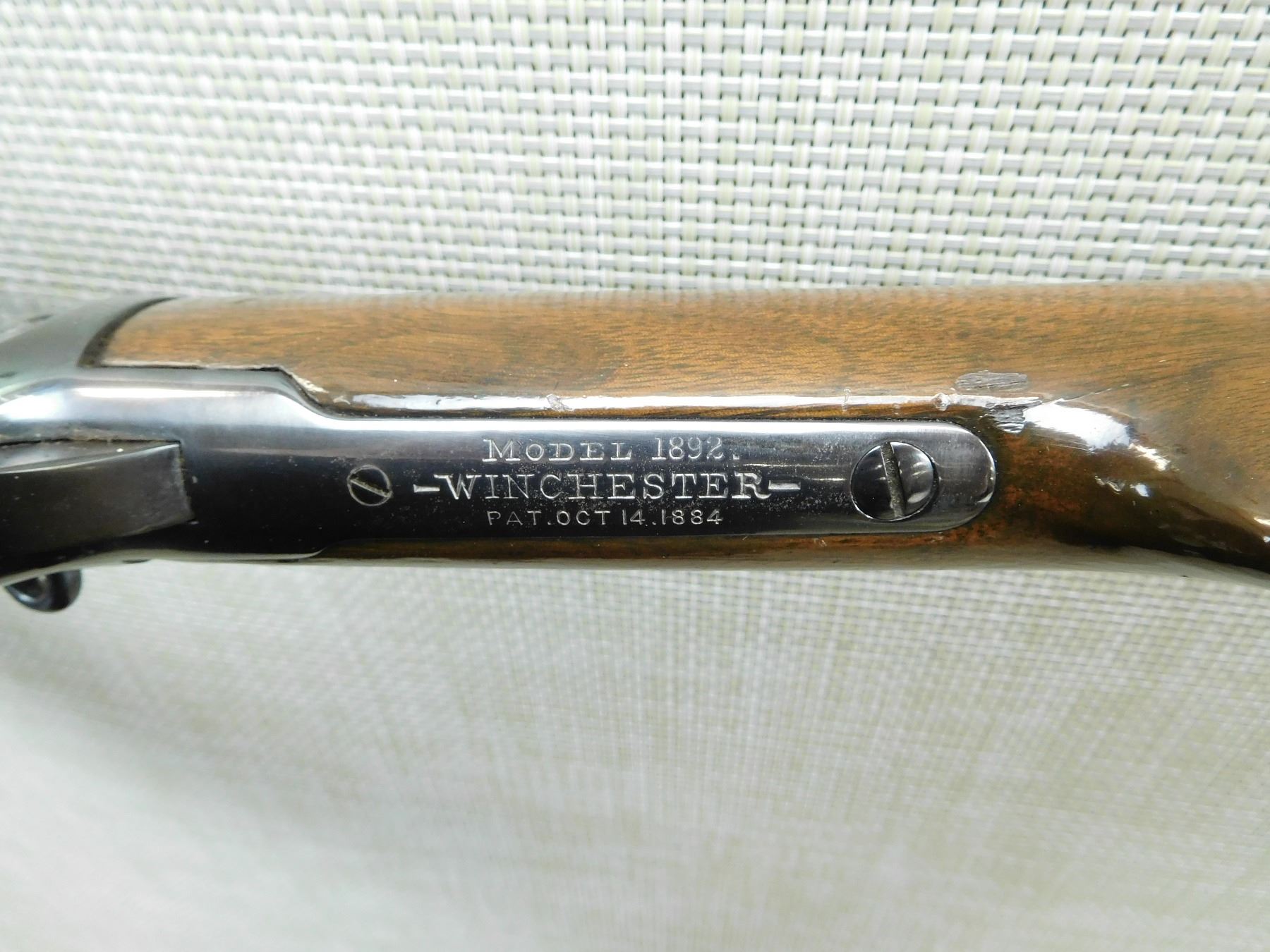 MISSING THE SADDLE RING, MANUFACTURED IN 1902, FAIR BORE, REPLACED FRONT SIGHT AND ORGINAL ADJUSTABLE REAR SIGHT, APPEARS TO HAVE BEEN REBLUED, CRACK IN BUTT STOCK ABOVE THE LEVER, SHOWS SOME HANDLING MARKS , SERIAL # 220352 , ACTION: LEVER ACTION RIFLE , BARREL LENGTH: 20" , CONDITION: 6/10 , STOCK # 7623 , CLASS: CANADIAN NON RESTRICTED CLASS