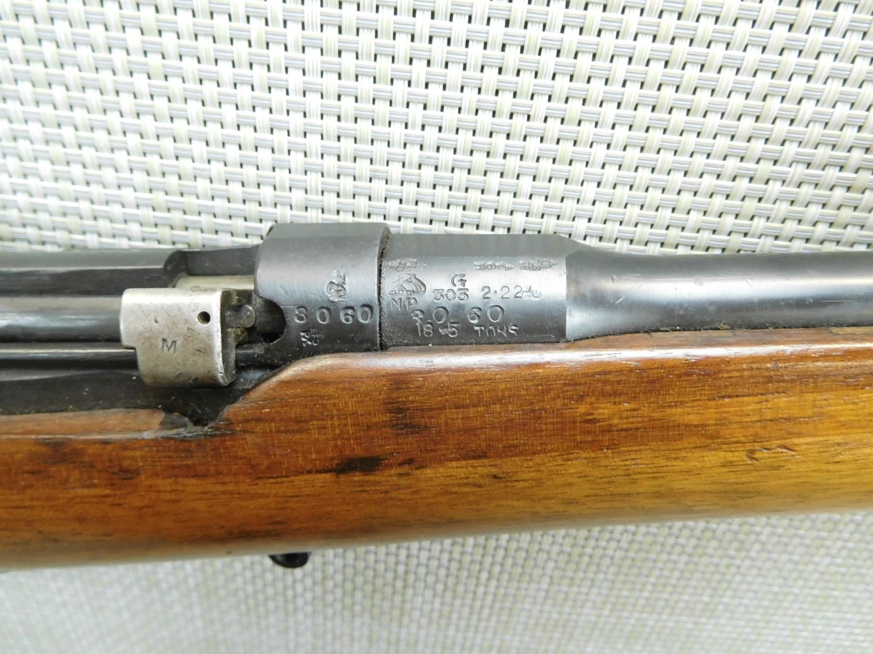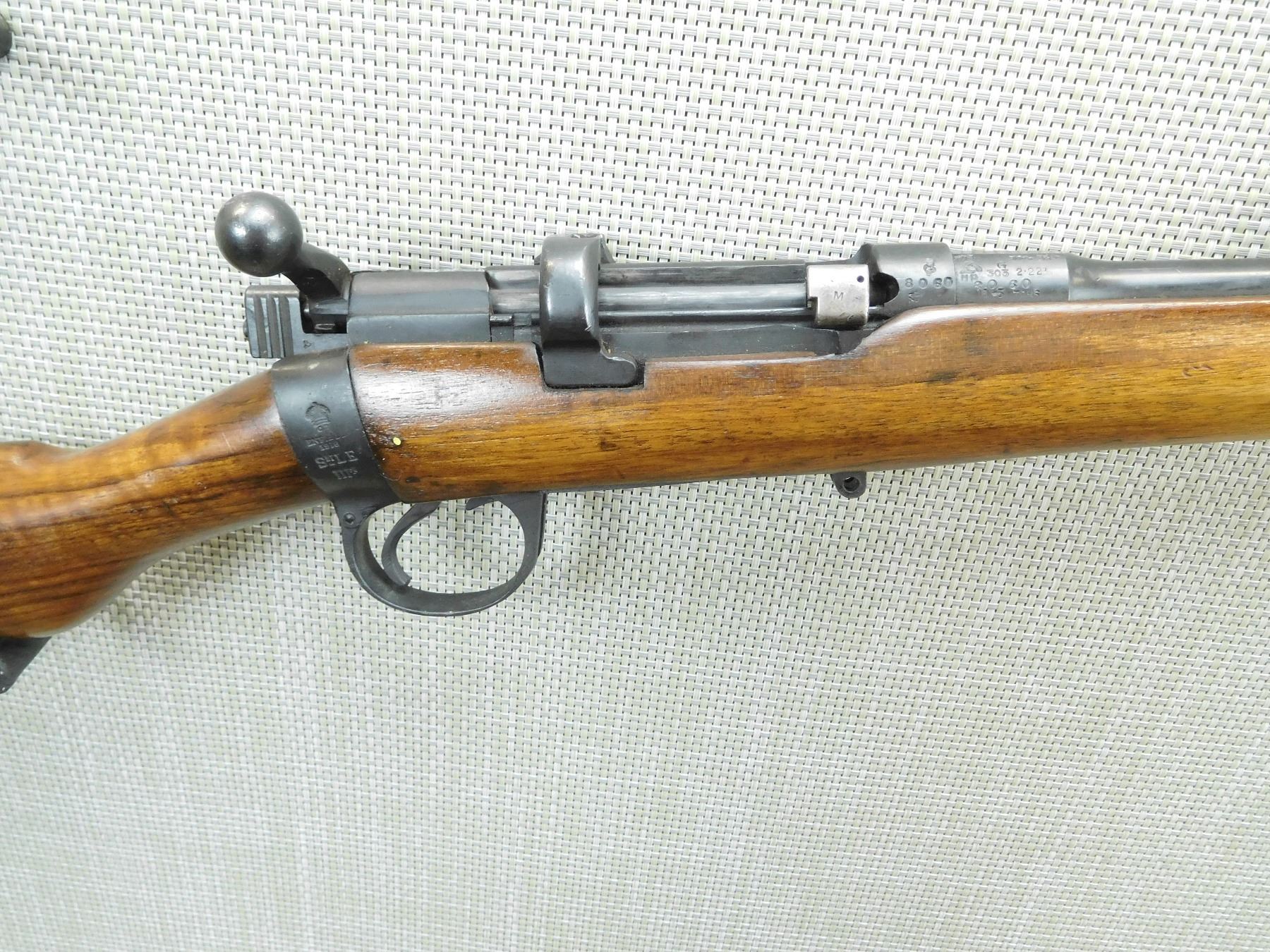 DOES NOT COME WITH MAGAZINE, DARK BORE, SLING SWIVEL LOOPS, RETAINS ORIGINAL MILITARY SIGHTS, BOLT AND RECEIVER MATCH, MISSING THE REAR SLING SWIVEL STUD , SERIAL # 8060 , ACTION: BOLT ACTION RIFLE , BARREL LENGTH: 25 1/2" , CONDITION: 5/10 , STOCK # 7624 , CLASS: CANADIAN NON RESTRICTED CLASS