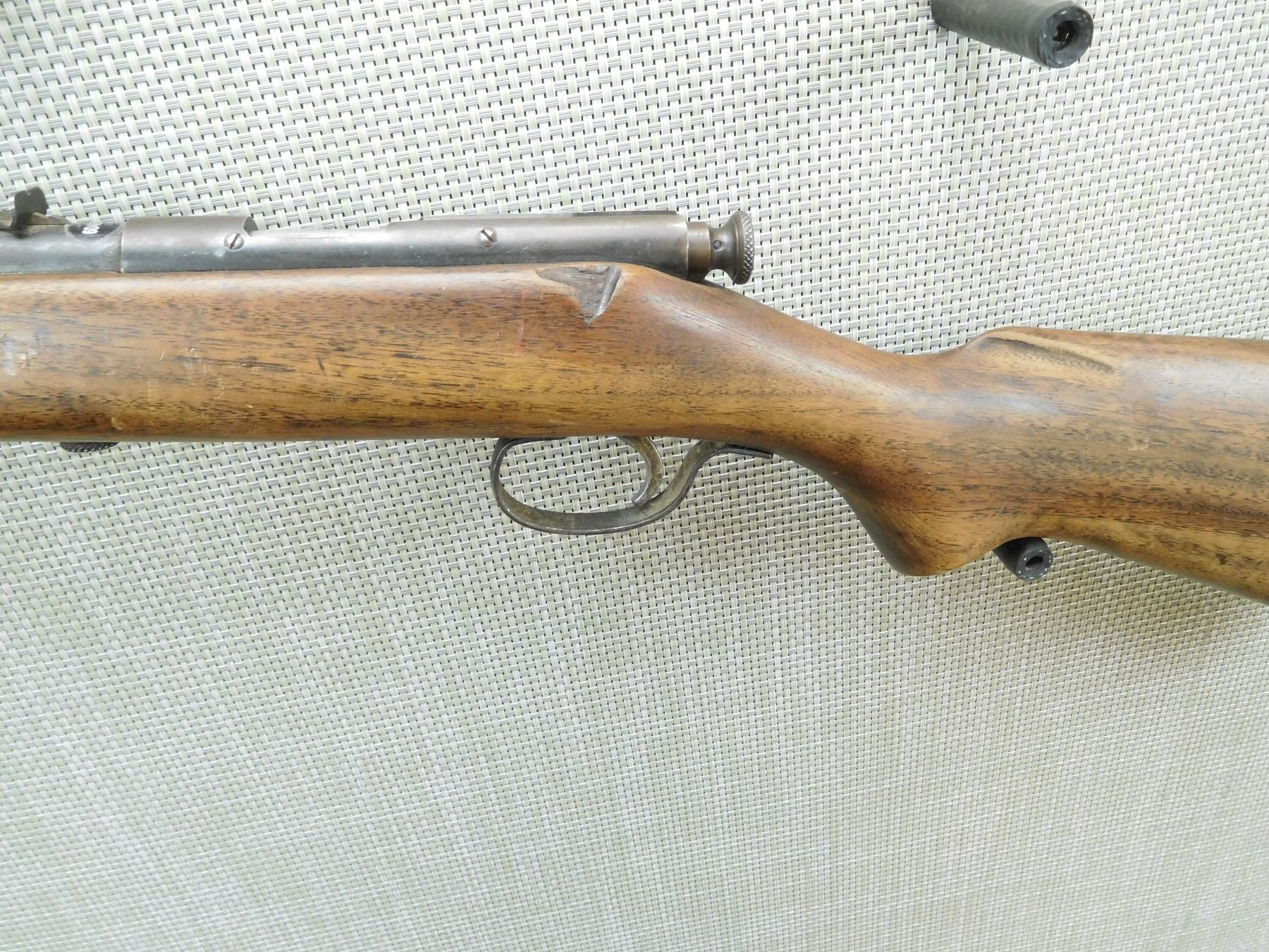 BORE IS DARK, DENT OR GOUGE OUT OF THE STOCK, SHOWS EXTENSIVE HANDLING MARKS, DOVETAIL FRONT AND ADJUSTABLE REAR SIGHTS, PLASTIC BUTT PLATE , SERIAL # N/A , ACTION: BOLT ACTION RIFLE , BARREL LENGTH: 26" , CONDITION: 5/0 , STOCK # 7642 , CLASS: CANADIAN NON RESTRICTED CLASS