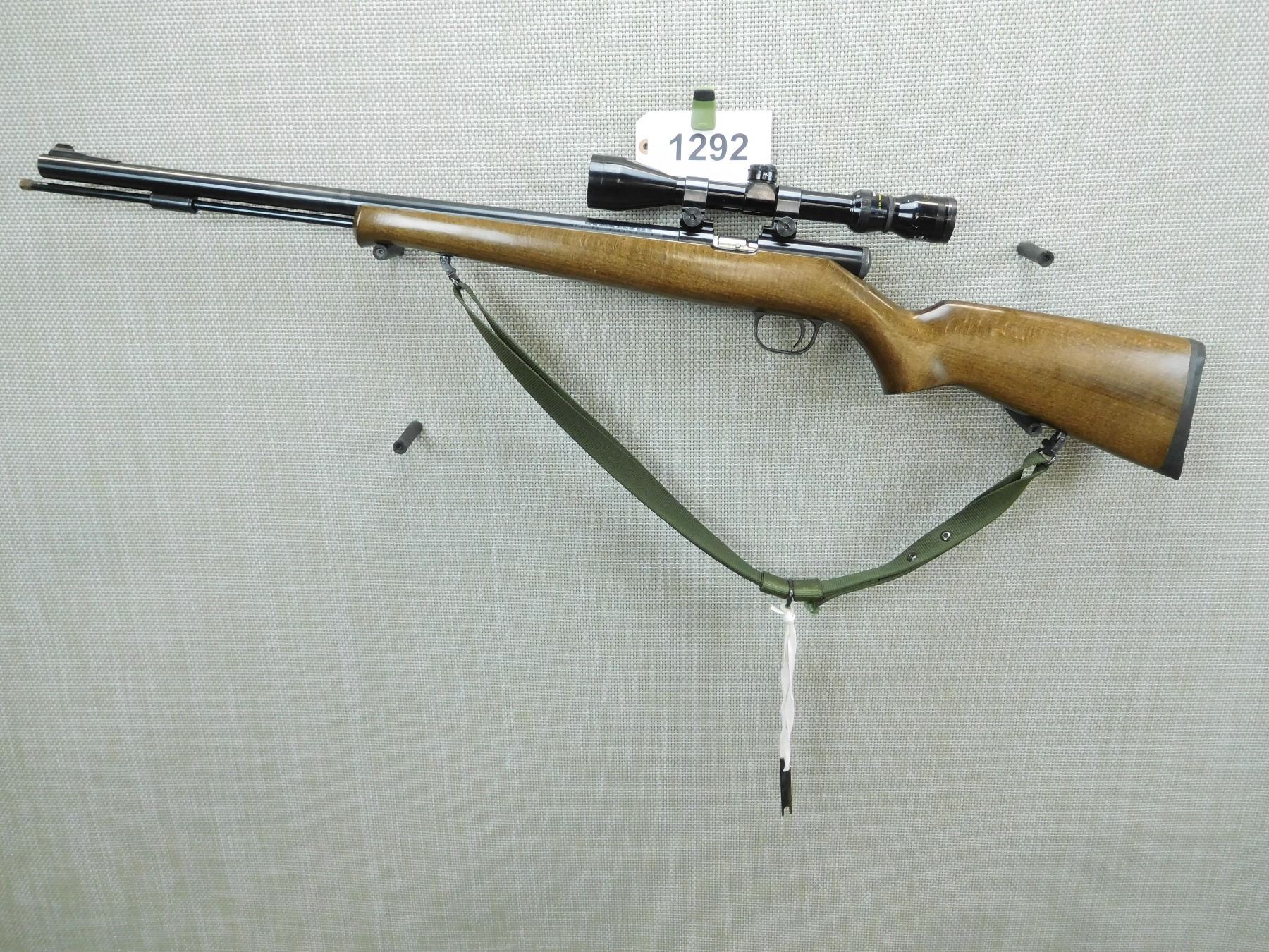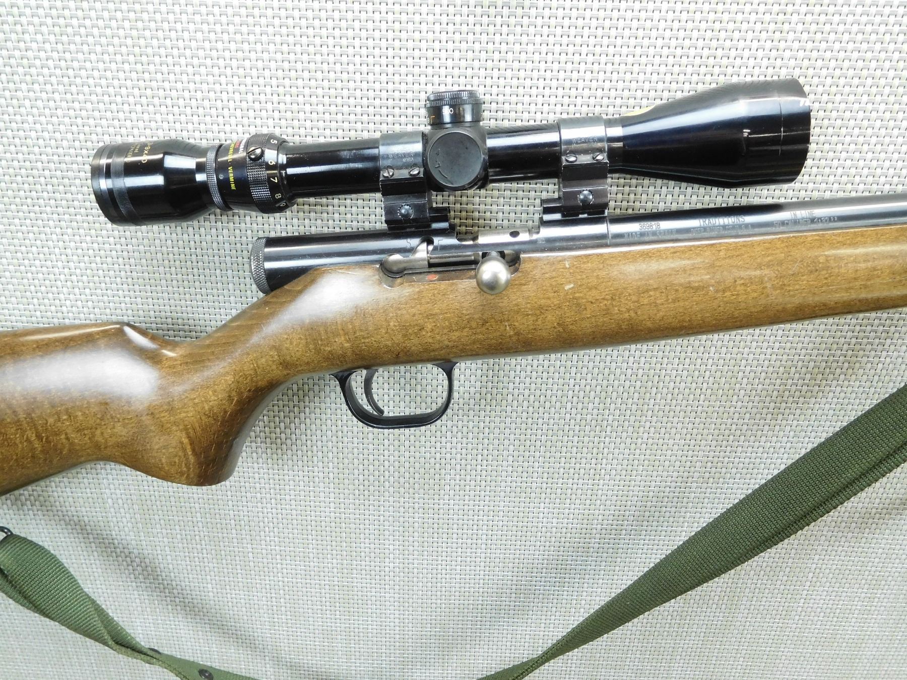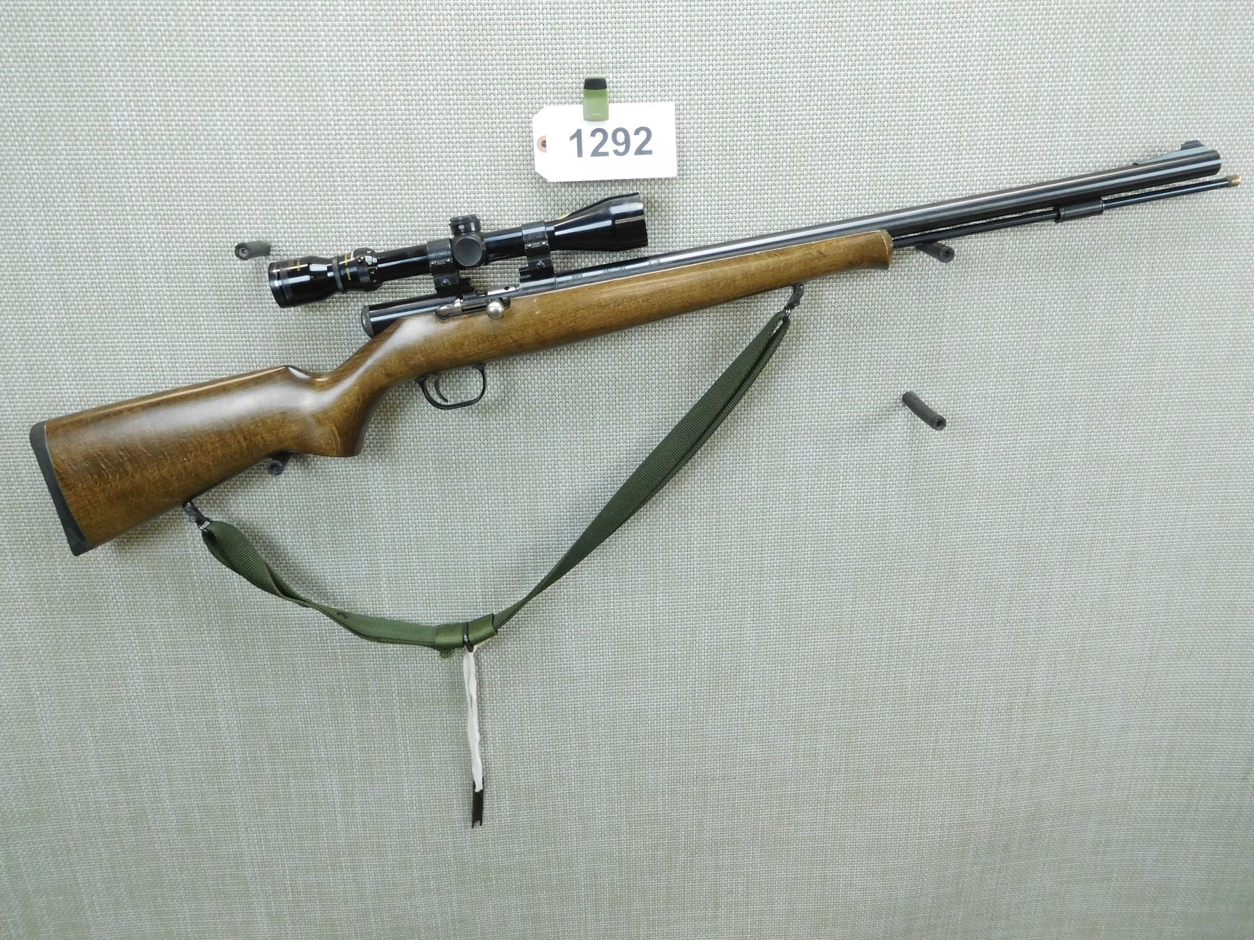 RAISED RAMP FRONT SIGHT, NO REAR SIGHT, FEATURES A TASCO 3 - 9 SCOPE, COMES WITH 2 RAM RODS, SLING SWIVELS WITH CANVAS SLING, RUBBER RECOIL PAD, GOOD BORE , SERIAL # 369818 , ACTION: INLINE PERCUSSION RIFLE , BARREL LENGTH: 24" , CONDITION: 8/10 , STOCK # 7648 , CLASS: CANADIAN NON RESTRICTED CLASS