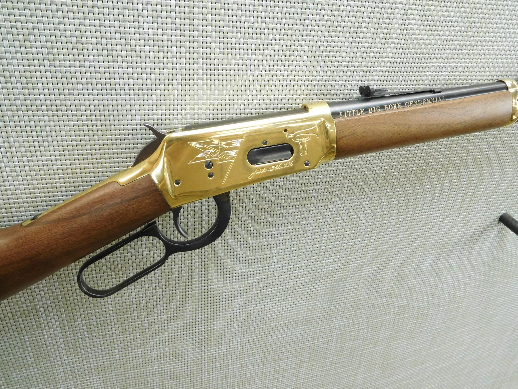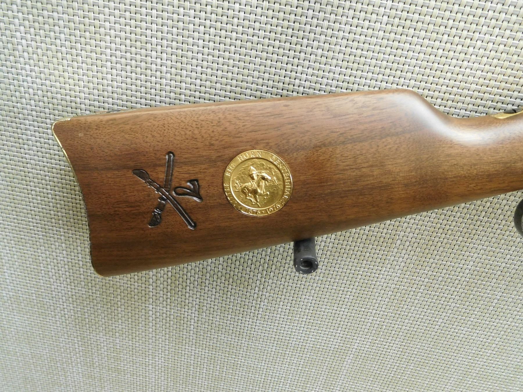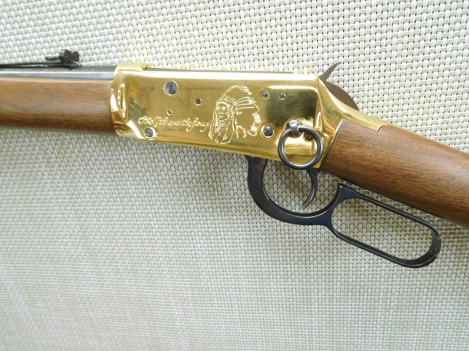 COMES WITH THE ORIGINAL BOX, THIS FIREARM HAS BEEN RECONDITIONED DUE TO INCORRECT STORAGE, SOME SURFACE CORROSION AND PITTING APPEARS, BORE IS VERY GOOD, SADDLE RING, GOLD FINISH RECEIVER AND BARREL BANDS, HOODED FRONT SIGHT AND ADJUSTABLE REAR SIGHT, BRASS BUTT PLATE, PITTING AROUND THE TRIGGER ON THE RECEIVER AS WELL AS THE LEVER, HAS THE 94 LITTLE BIG HORN COMMEMORATIVE DISK EMBEDDED ON THE STOCK AND THE 7TH CALVARY LOGO PRESSED INTO THE BUTT , SERIAL # LBH07507 , ACTION: LEVER ACTION RIFLE , BARREL LENGTH: 20" , CONDITION: 7/10 IN RECONDITIONED CONFIGURATION , STOCK # 7653 , CLASS: CANADIAN NON RESTRICTED CLASS