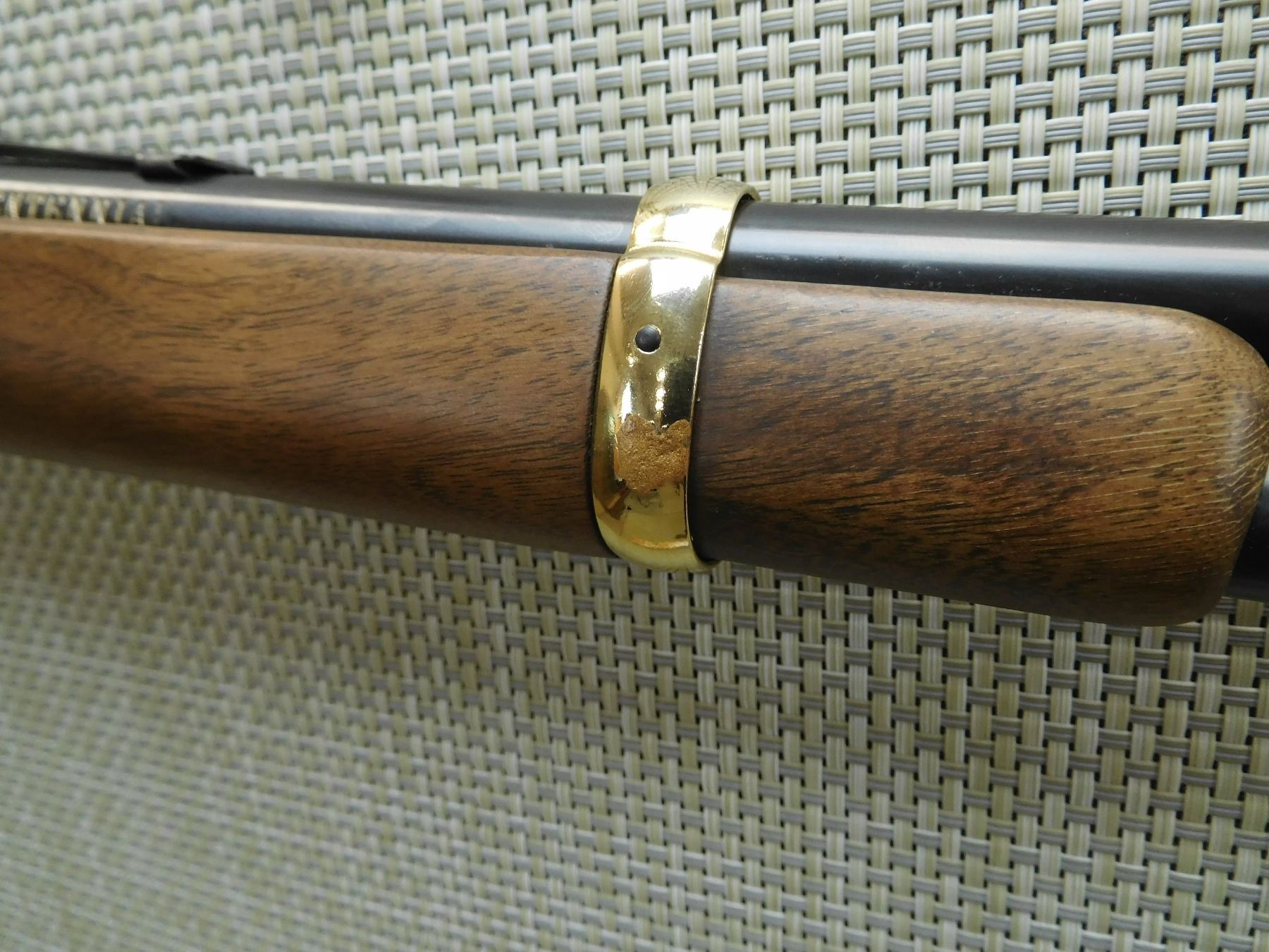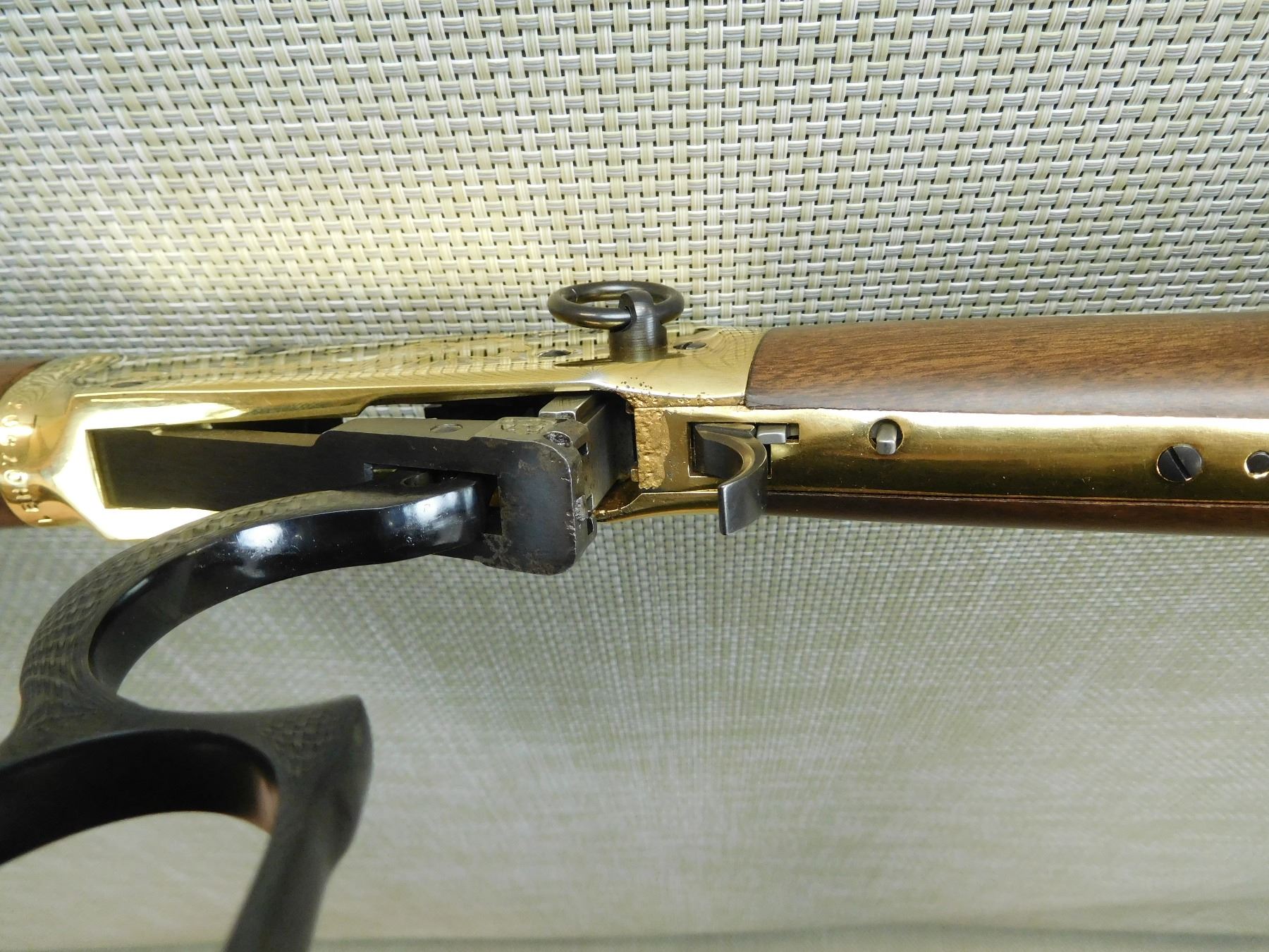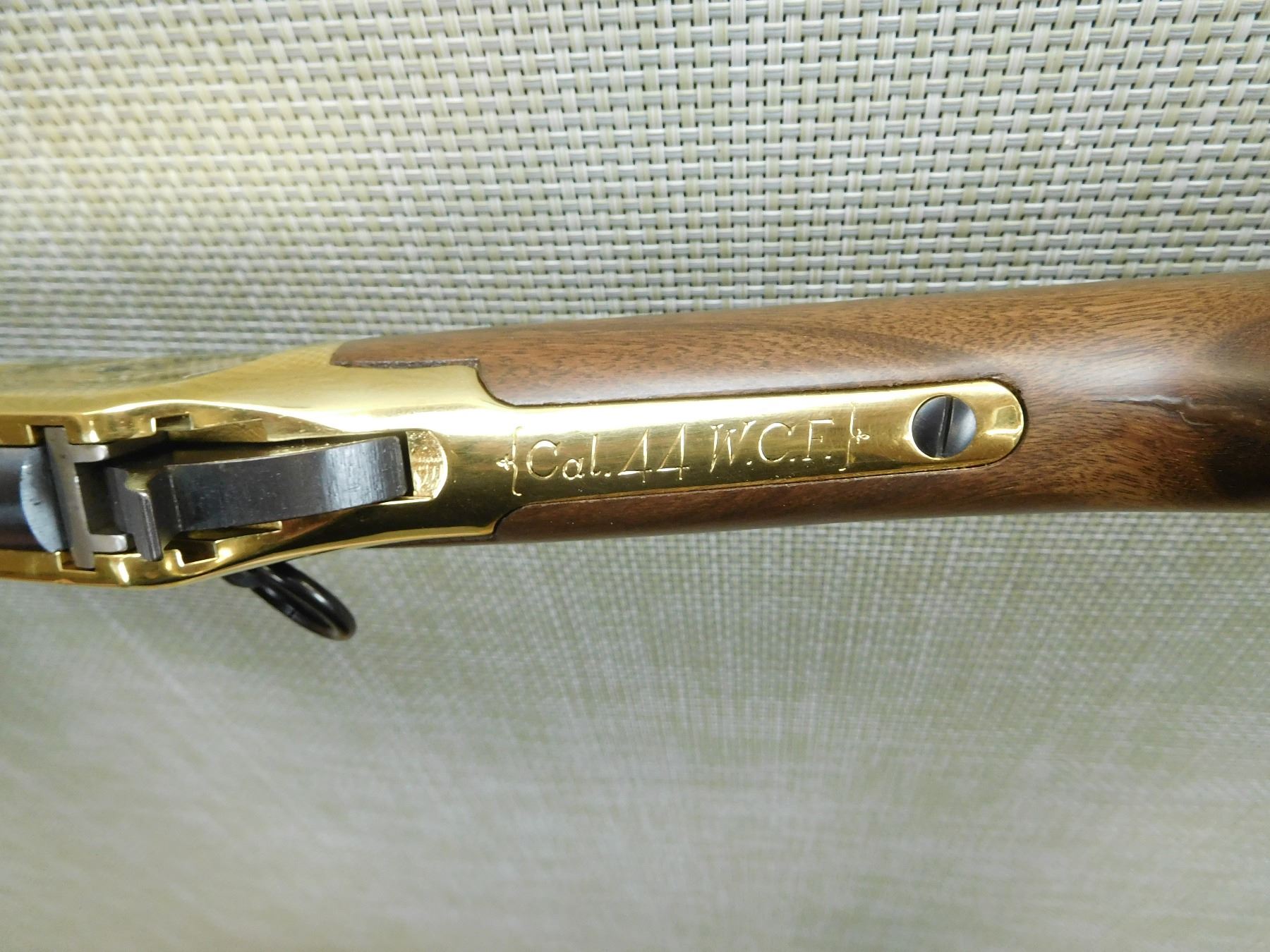 COMES WITH THE ORIGINAL BOX, THIS FIREARM HAS BEEN RECONDITIONED DUE TO INCORRECT STORAGE, SOME SURFACE CORROSION AND PITTING APPEARS, BORE IS VERY GOOD, SADDLE RING, GOLD FINISH RECEIVER AND BARREL BANDS, HOODED FRONT SIGHT AND ADJUSTABLE REAR SIGHT, BRASS BUTT PLATE, PITTING AROUND THE TRIGGER ON THE RECEIVER AS WELL AS THE LEVER, HAS THE 94 LITTLE BIG HORN COMMEMORATIVE DISK EMBEDDED ON THE STOCK AND THE 7TH CALVARY LOGO PRESSED INTO THE BUTT , SERIAL # LBH07507 , ACTION: LEVER ACTION RIFLE , BARREL LENGTH: 20" , CONDITION: 7/10 IN RECONDITIONED CONFIGURATION , STOCK # 7653 , CLASS: CANADIAN NON RESTRICTED CLASS