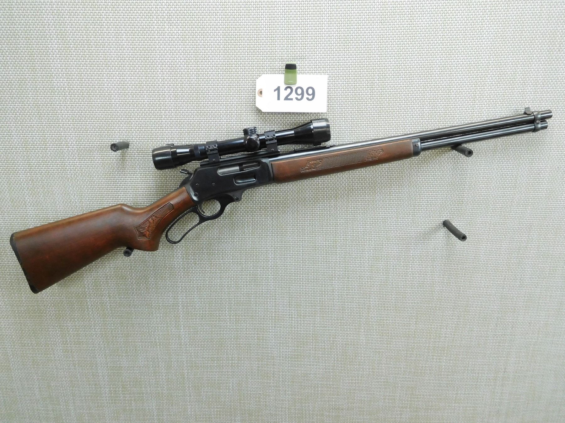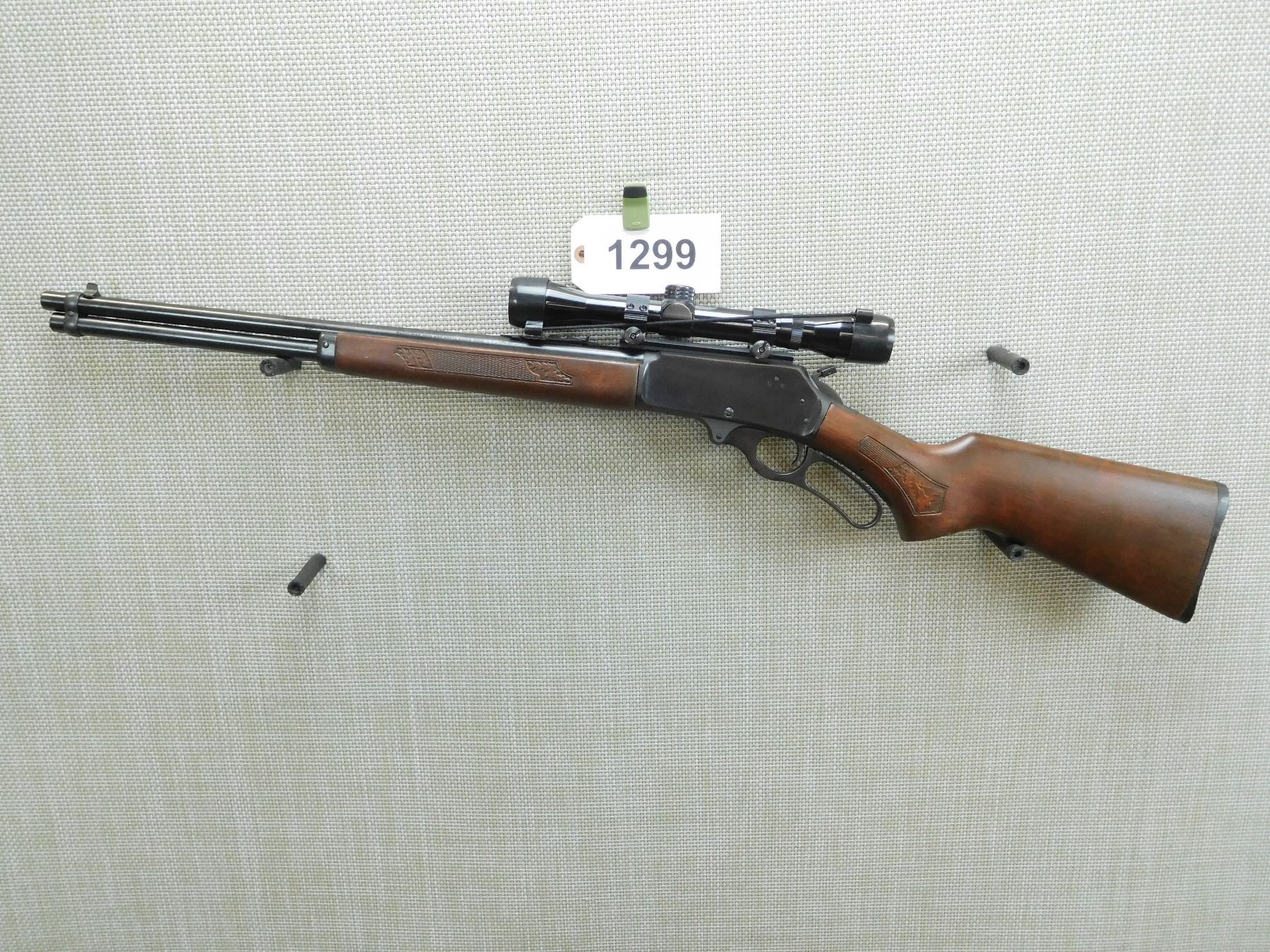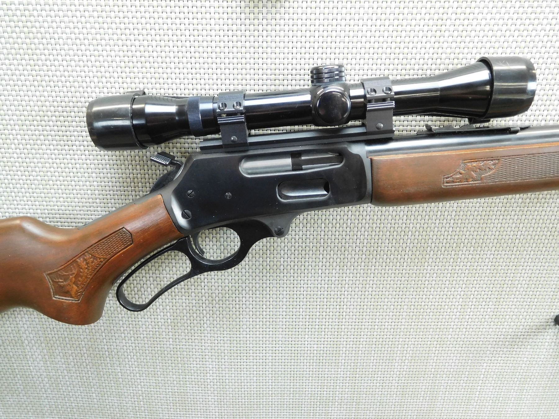 MANUFACTURED BY MARLIN,THIS FIREARM HAS BEEN COMES WITH SCOPE, BORE IS GOOD, HAS A MARLIN 4 X SCOPE, ORIGINAL DOVETAIL FRONT AND ADJUSTABLE REAR SIGHTS, PRESSED CHECKERING ON THE FOREND AND SEMI PISTOL GRIP, PLASTIC BUTT PLATE, STOCK APPEARS TO BE REFINISHED, NON ORIGINAL TANG AND FOREND CAP SCREWS , SERIAL # 21099858 , ACTION: LEVER ACTION RIFLE , BARREL LENGTH: 20" , CONDITION: 6/10 , STOCK # 7655 , CLASS: CANADIAN NON RESTRICTED CLASS