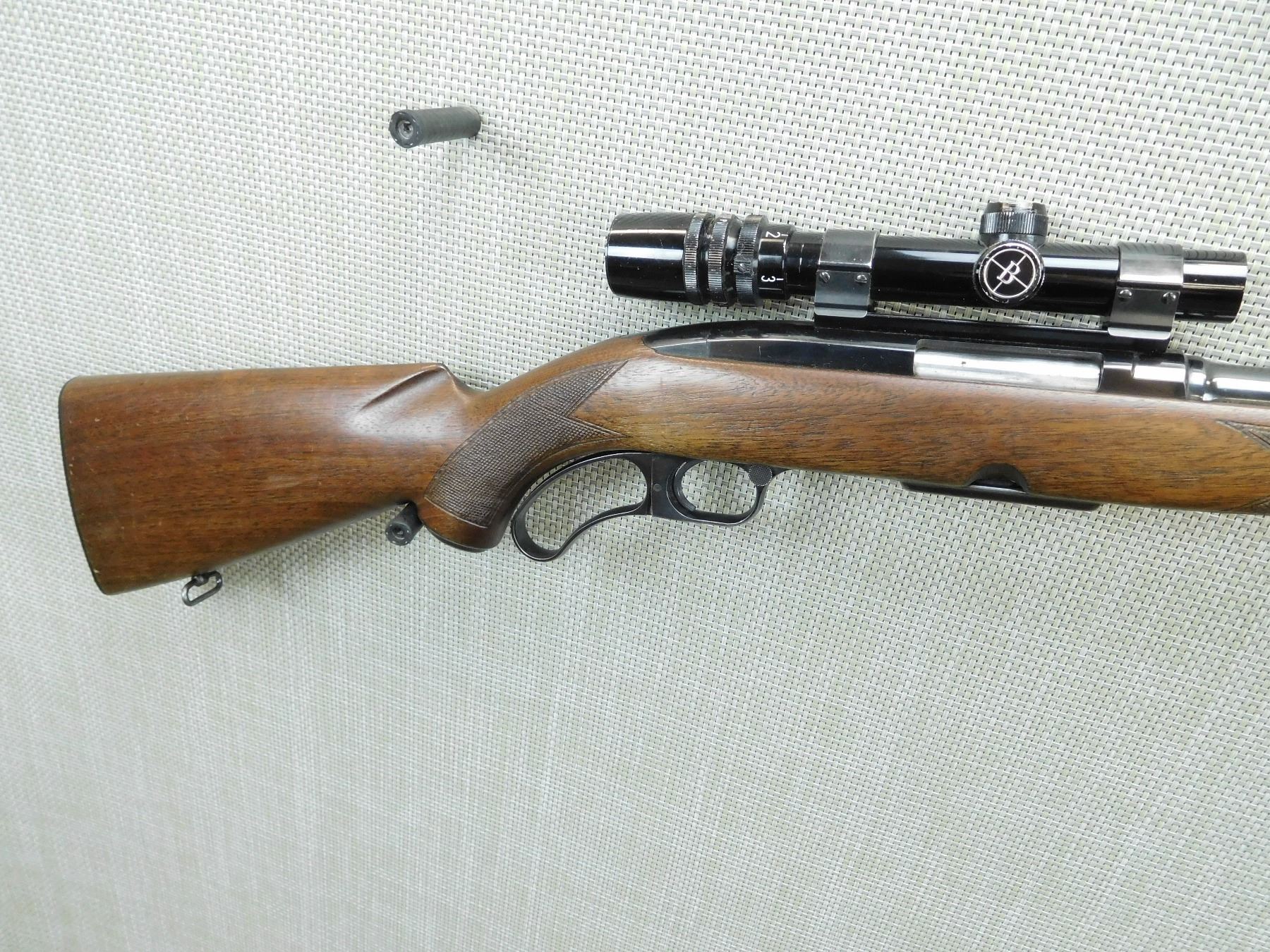 COMES WITH MAGAZINE, GOOD BORE, BUSHNELL SCOPECHIEF IV 1.5-4.5 SCOPE, HOODED FRONT SIGHT AND FLIP ADJUSTABLE REAR SIGHT, CHECKERED FOREND AND CAPPED PISTOL GRIP BUTT STOCK, PLASTIC BUTT PLATE, SLING SWIVEL LOOPS , SERIAL # 70334 , ACTION: LEVER ACTION RIFLE , BARREL LENGTH: 22" , CONDITION: 7/10 , STOCK # 7663 , CLASS: CANADIAN NON RESTRICTED CLASS