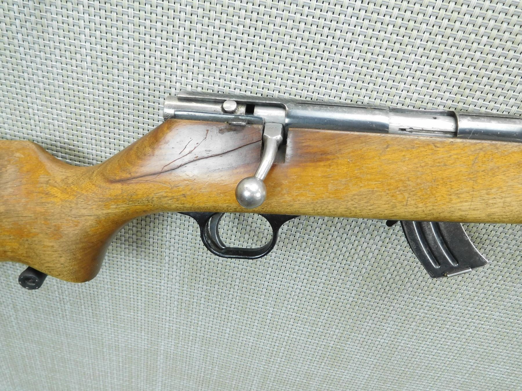 COMES WITH MAGAZINE, BORE IS GOOD, DOVETAIL FRONT AND ADJUSTABLE REAR SIGHTS, SOME SURFACE RUST ON THE BARREL, STOCK IS CRACKED ABOVE THE TRIGGER GUARD, PLASTIC BUTT PLATE, SHOWS HANDLING MARKS, FINISH IS VERY WORN , SERIAL # N/A , ACTION: BOLT ACTION RIFLE , BARREL LENGTH: 21" , CONDITION: 4/10 , STOCK # 7678 , CLASS: CANADIAN NON RESTRICTED CLASS
