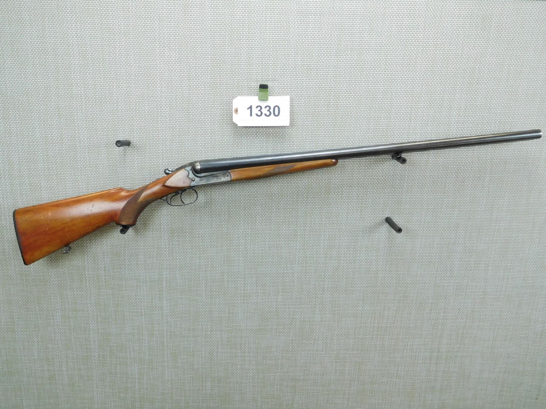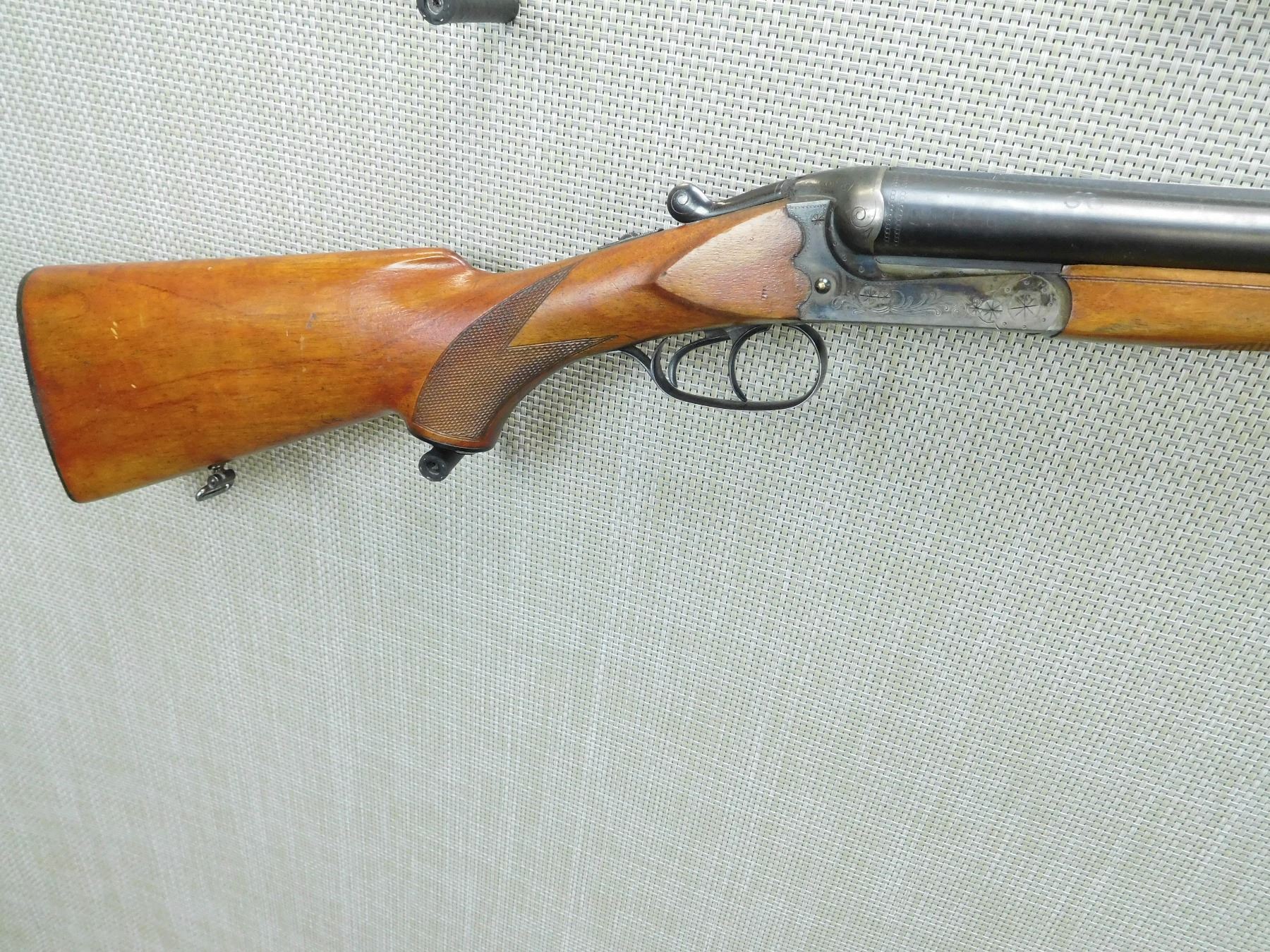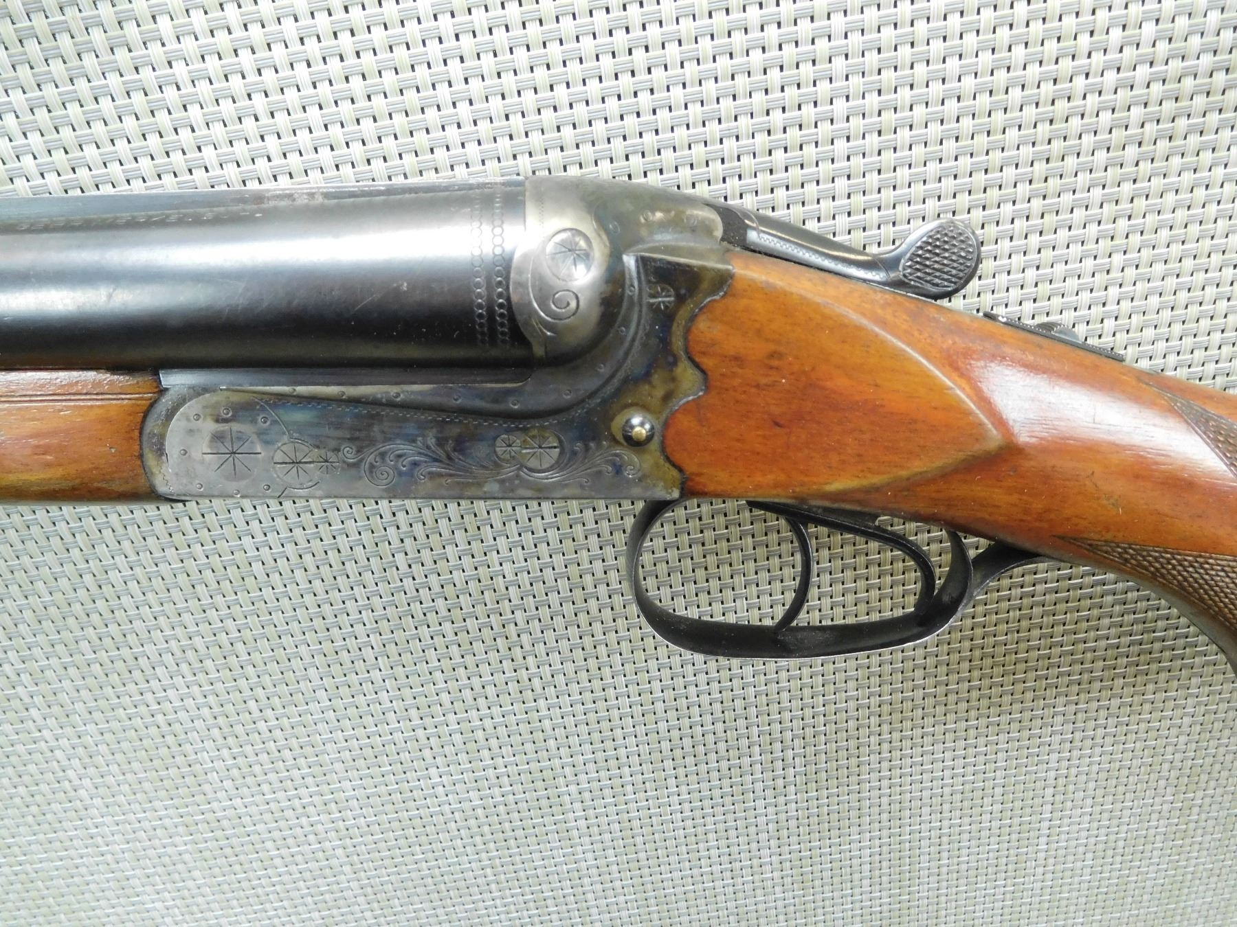 BORES ARE VERY GOOD, BEAD FRONT SIGHT, CHECKERED FOREND AND CAPPED PISTOL GRIP BUTT STOCK WITH RAISED CHEEK PIECE, PLASTIC BUTT PLATE, SHOWS SOME HANDLING MARKS, COCKING INDICATORS , SERIAL # 535280 , ACTION: SIDE BY SIDE BREAK ACTION SHOTGUN , BARREL LENGTH: 28" , CONDITION: 6/10 , STOCK # 7686 , CLASS: CANADIAN NON RESTRICTED CLASS