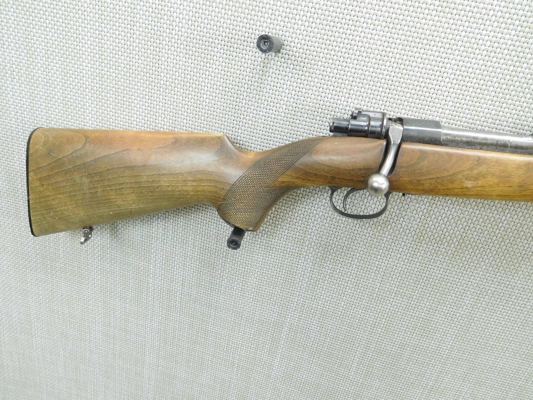 BORE IS GOOD, RAMP FRONT AND FULLY ADJUSTABLE REAR SIGHT, RECEIVER IS DRILLED AND TAPPED FOR A SCOPE MOUNT, SHOWS EXTENSIVE HANDLING MARKS, THERE IS SOLDER RESIDUE ON THE RECEIVER, CHECKERED FOREND AND CAPPED PISTOL GRIP BUTT STOCK, RUBBER BUTT PLATE, SLING SWIVELS , SERIAL # 13266 , ACTION: BOLT ACTION RIFLE , BARREL LENGTH: 24" , CONDITION: 4/10 , STOCK # 7697 , CLASS: CANADIAN NON RESTRICTED CLASS