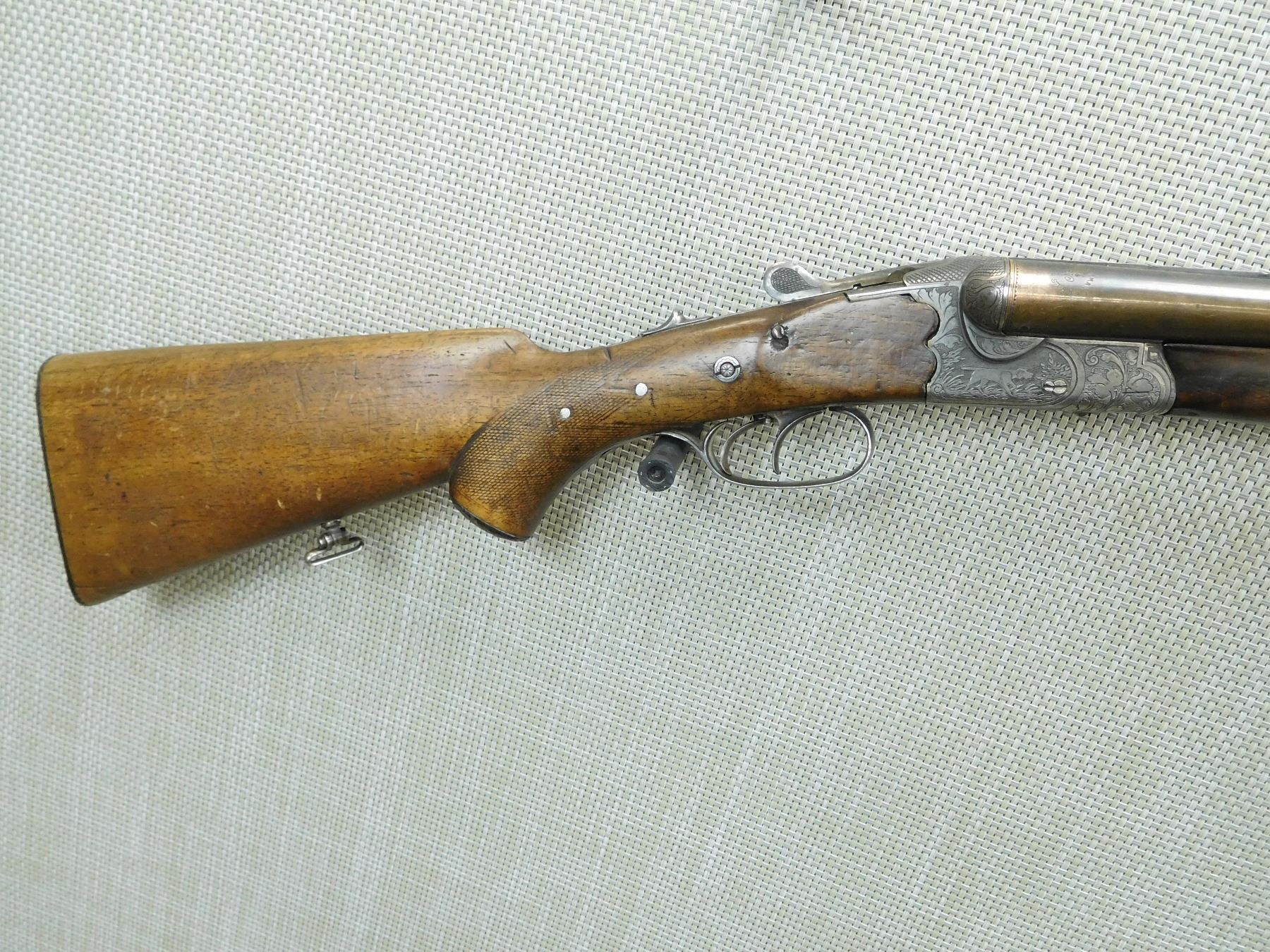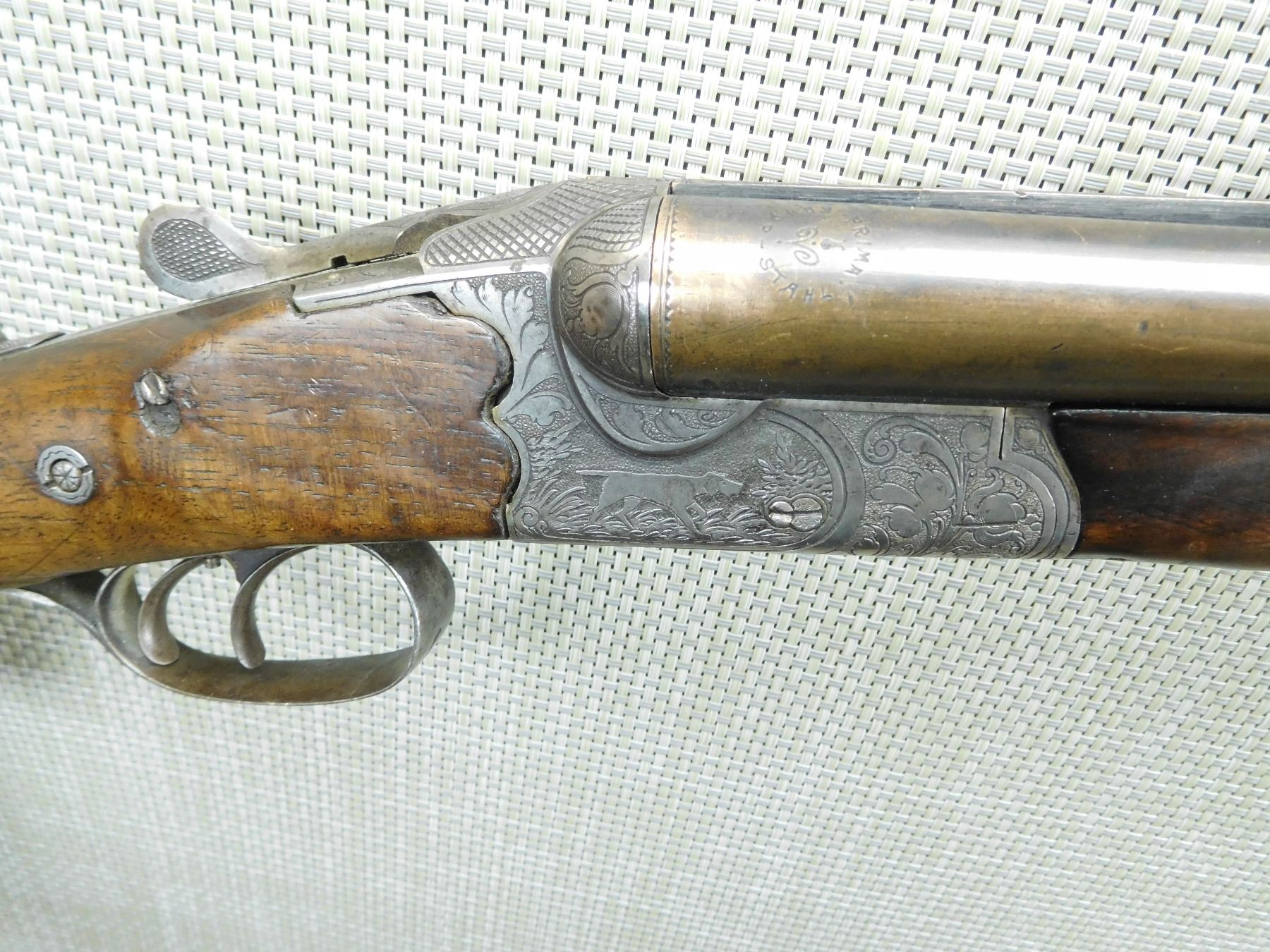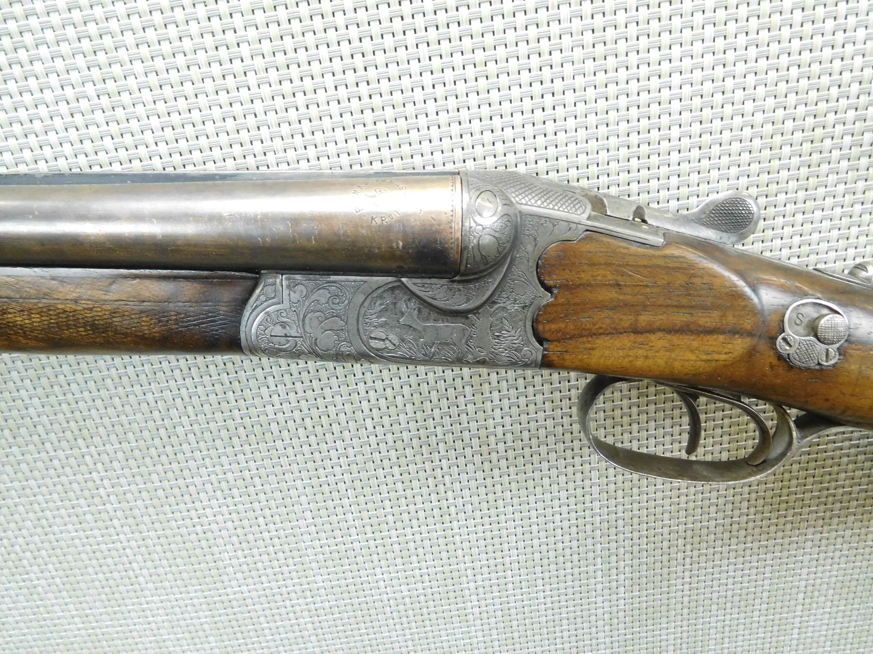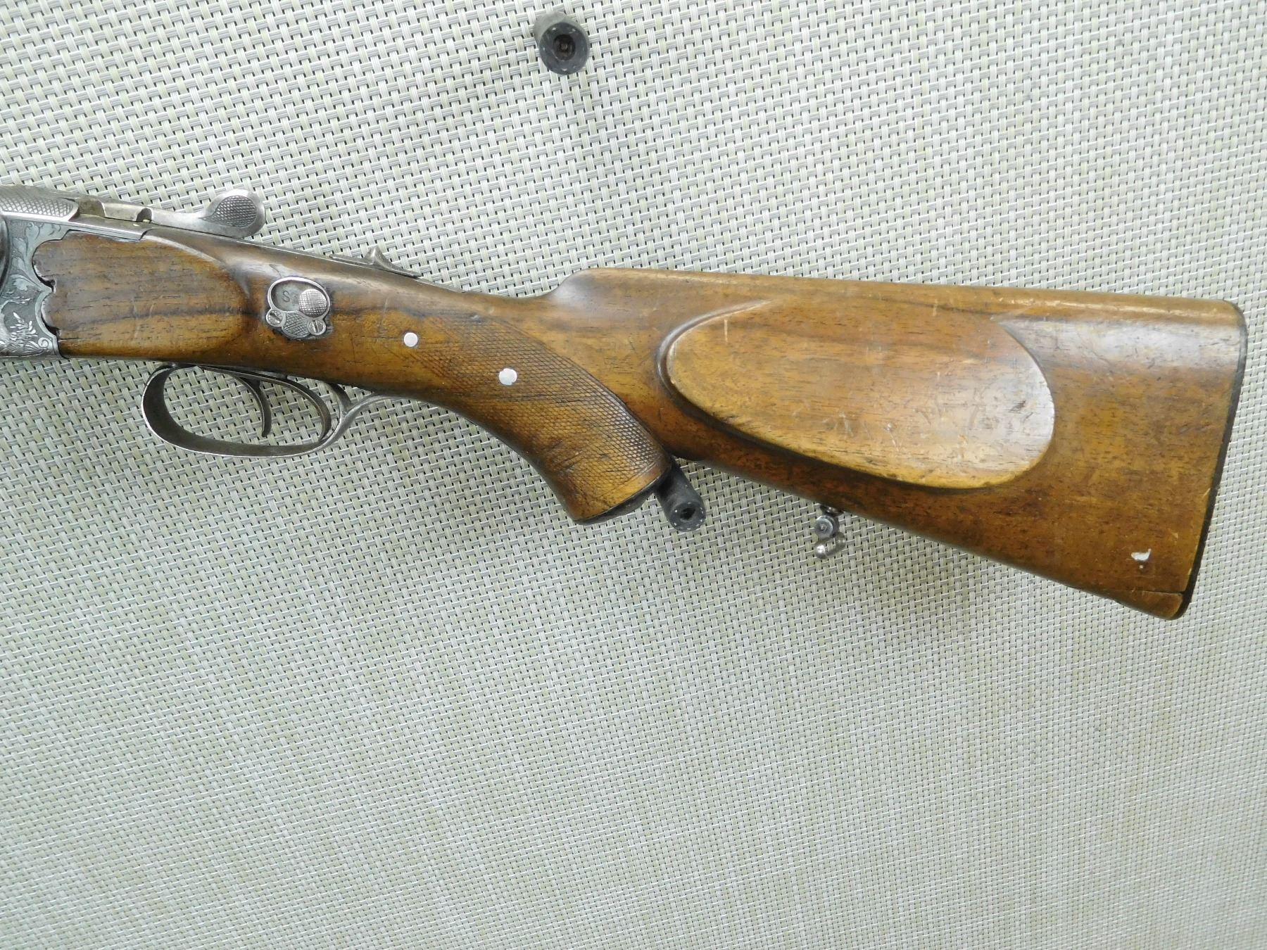 GOOD BORES, BEAD FRONT SIGHT, FLIP REAR SIGHT, ACTION IS WELL WORN, WOOD BUTT STOCK IS LOOSE, SHOWS EXTENSIVE HANDLING MARKS, STOCK HAS BEEN REPAIRED AT THE WRIST, STOCK IS CRACKED AT THE TOE, CHECKERED FOREND AND PISTOL GRIP CAPPED BUTT STOCK WITH RAISED CHEEK PIECE, SLING LOOPS, HORN BUTT PLATE, HAS EXTENSIVE ENGRAVING ON RECEIVER, BARRELS MARKED KRUPP-STAHL, BARRELS APPEAR TO HAVE BEEN PAINTED AT ONE POINT , SERIAL # N/A , ACTION: DRILLING HINGED BARREL , BARREL LENGTH: 28" , CONDITION: 3/10 , STOCK # 7699 , CLASS: CANADIAN NON RESTRICTED CLASS