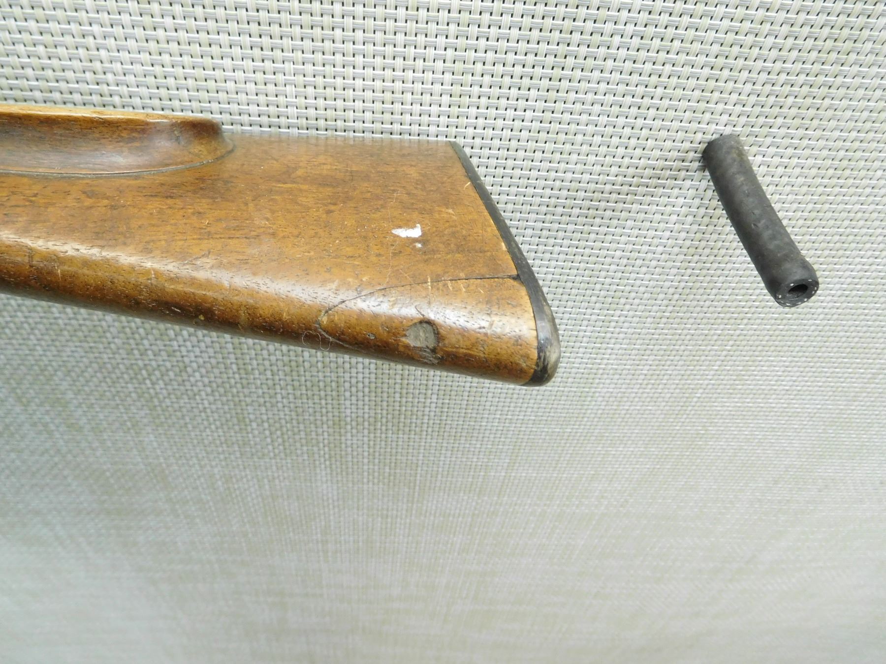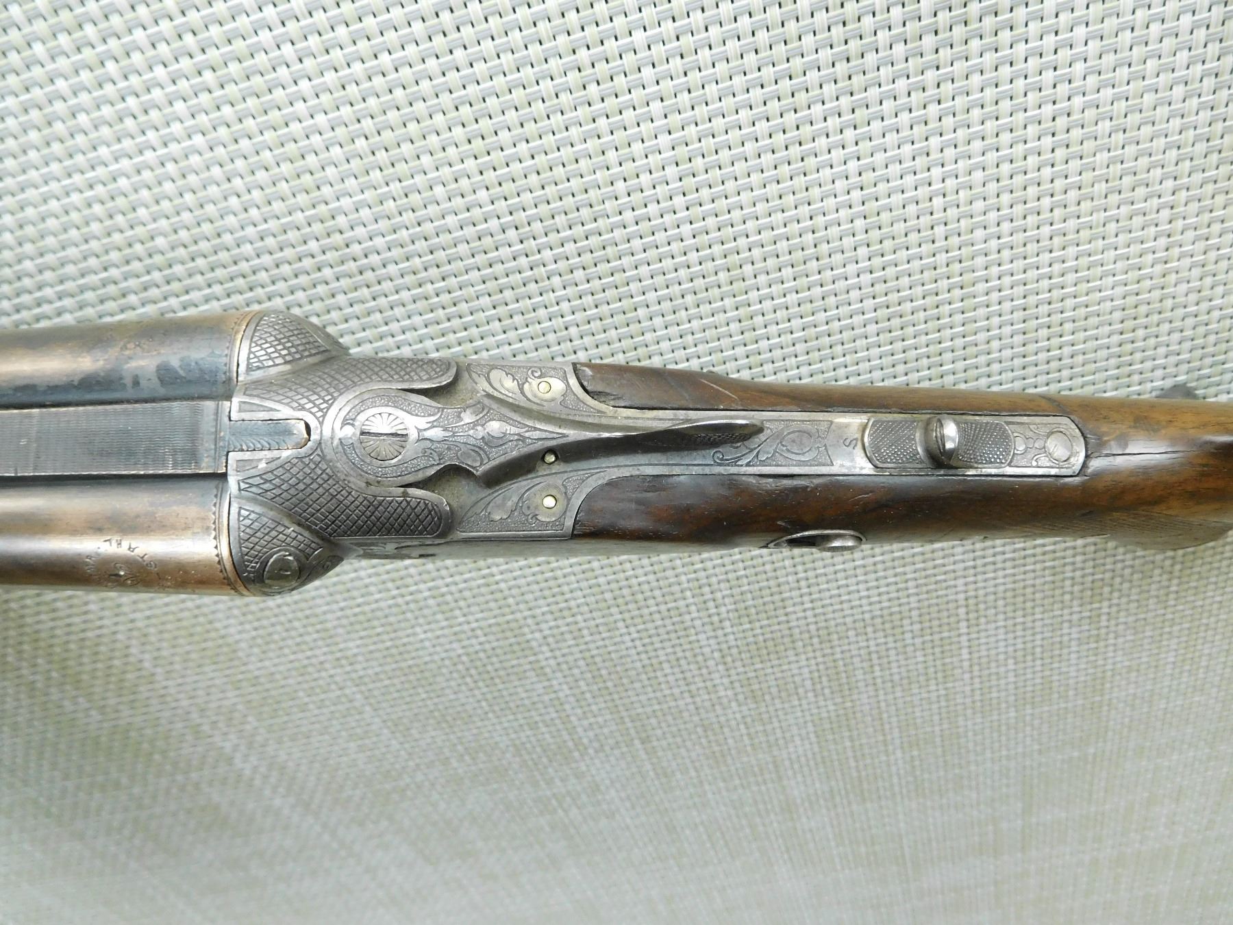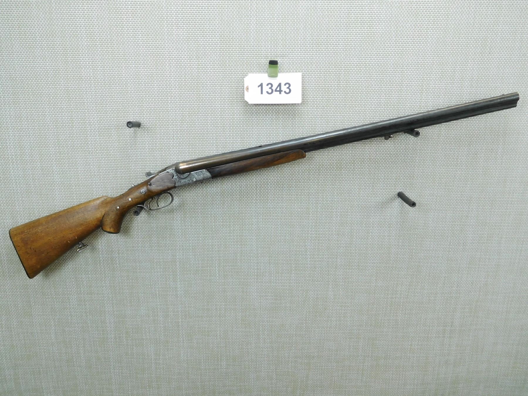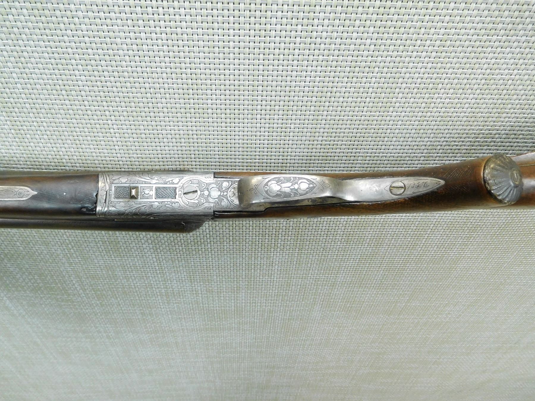 GOOD BORES, BEAD FRONT SIGHT, FLIP REAR SIGHT, ACTION IS WELL WORN, WOOD BUTT STOCK IS LOOSE, SHOWS EXTENSIVE HANDLING MARKS, STOCK HAS BEEN REPAIRED AT THE WRIST, STOCK IS CRACKED AT THE TOE, CHECKERED FOREND AND PISTOL GRIP CAPPED BUTT STOCK WITH RAISED CHEEK PIECE, SLING LOOPS, HORN BUTT PLATE, HAS EXTENSIVE ENGRAVING ON RECEIVER, BARRELS MARKED KRUPP-STAHL, BARRELS APPEAR TO HAVE BEEN PAINTED AT ONE POINT , SERIAL # N/A , ACTION: DRILLING HINGED BARREL , BARREL LENGTH: 28" , CONDITION: 3/10 , STOCK # 7699 , CLASS: CANADIAN NON RESTRICTED CLASS