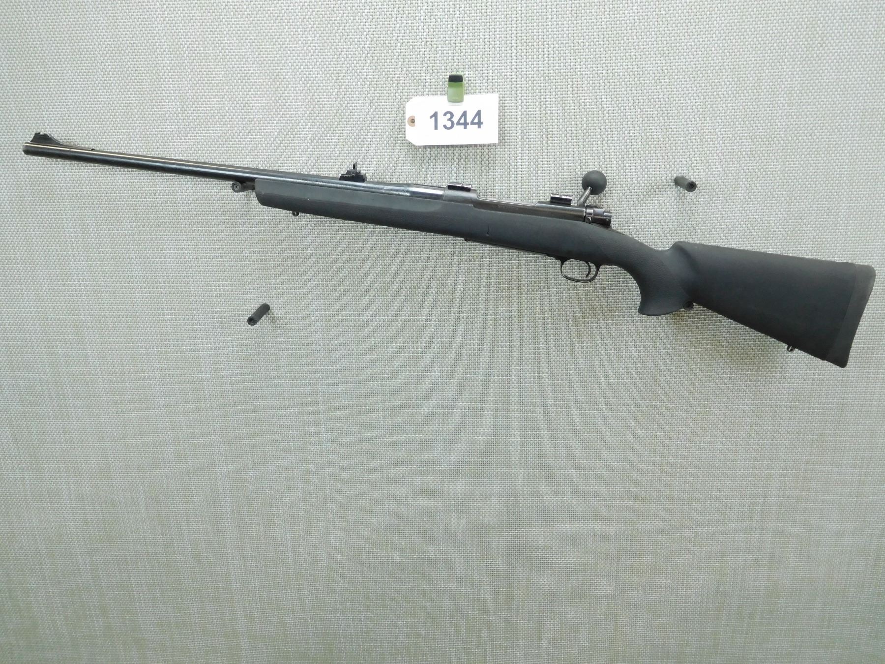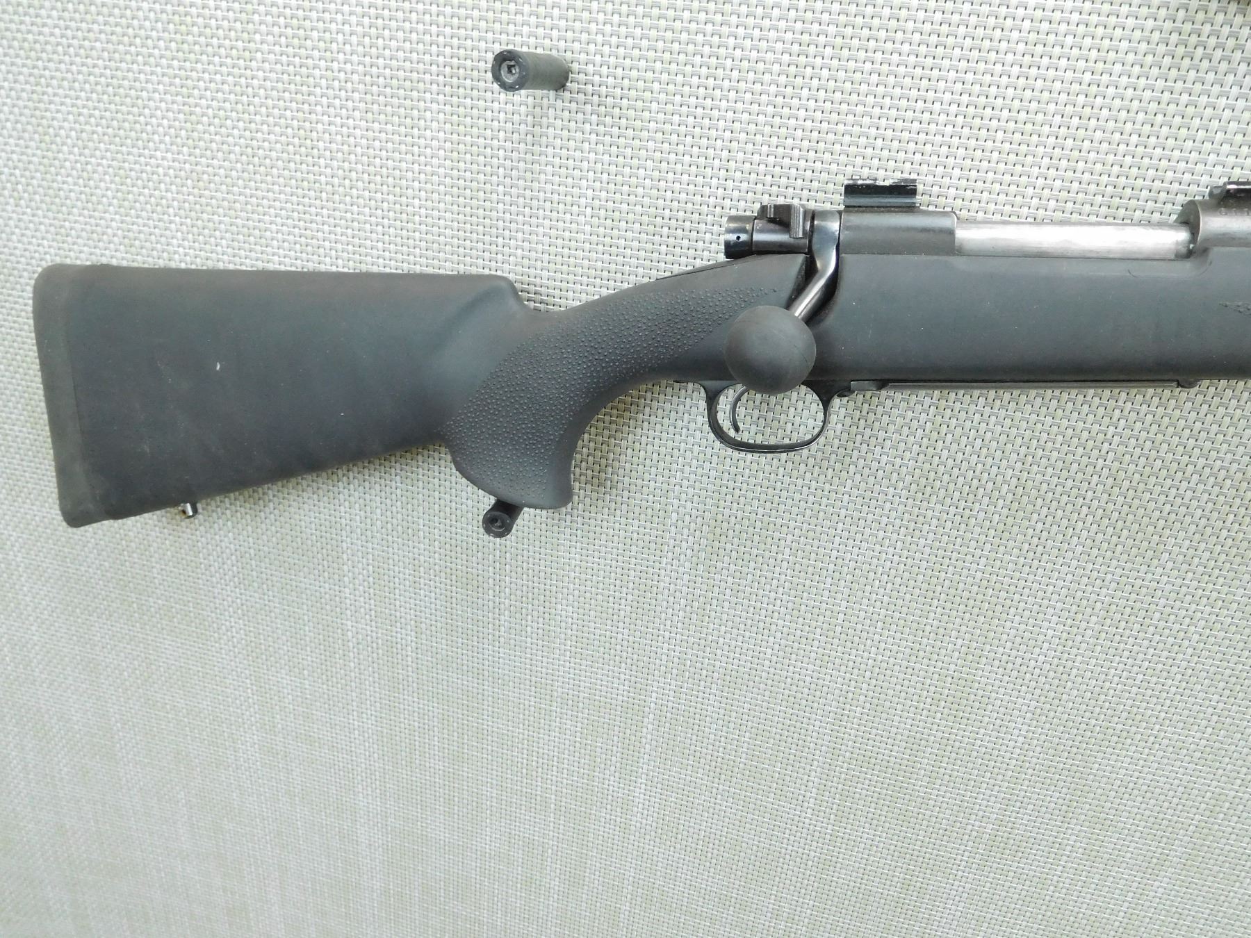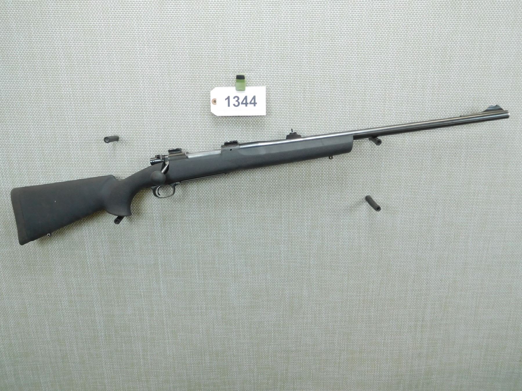 BORE IS VERY GOOD, RAMP FRONT SIGHT IS MISSING THE DOVETAIL SIGHT, ADJUSTABLE REAR SIGHT, SCOPE MOUNTS ATTACHED, HEAVY BARREL, BLACK SYNTHETIC STOCK WITH RUBBER BUTT PAD, SYNTHETIC BOLT KNOB, SHOWS SOME HANDLING MARKS, SLING STUDS , SERIAL # G1180922 , ACTION: BOLT ACTION RIFLE , BARREL LENGTH: 24" , CONDITION: 5/10 , STOCK # 7700 , CLASS: CANADIAN NON RESTRICTED CLASS