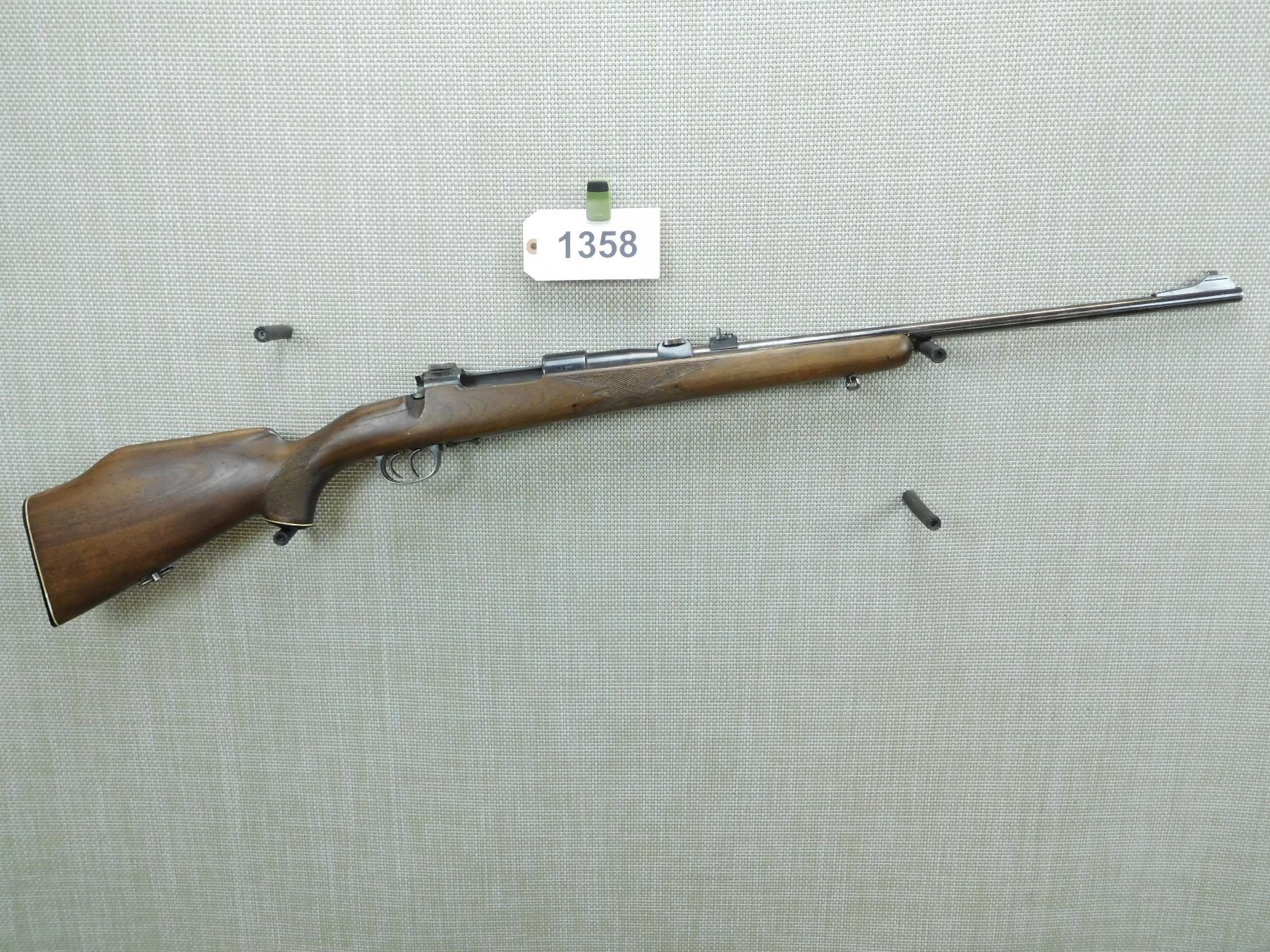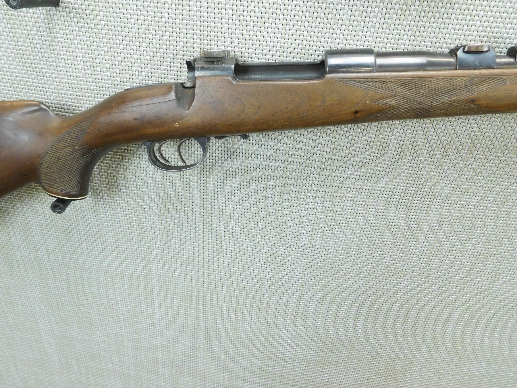 BOLT IS MISSING, BORE IS GOOD, RAMP FRONT AND EXPRESS REAR SIGHTS, CLAW SCOPE MOUNTS, CHECKERED FOREND AND CAPPED PISTOL GRIP BUTT STOCK WITH RAISED CHEEK PIECE, SLING SWIVEL STUDS, PLASTIC BUTT PLATE, MISSING THE TRIGGER GUARD SCREW, SHOWS SOME HANDLING MARKS , SERIAL # 24504 , ACTION: BOLT ACTION RIFLE , BARREL LENGTH: 23" , CONDITION: 3/10 , STOCK # 7714 , CLASS: CANADIAN NON RESTRICTED CLASS