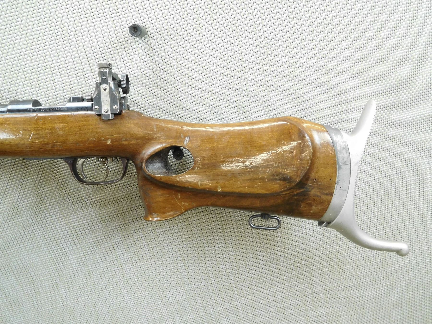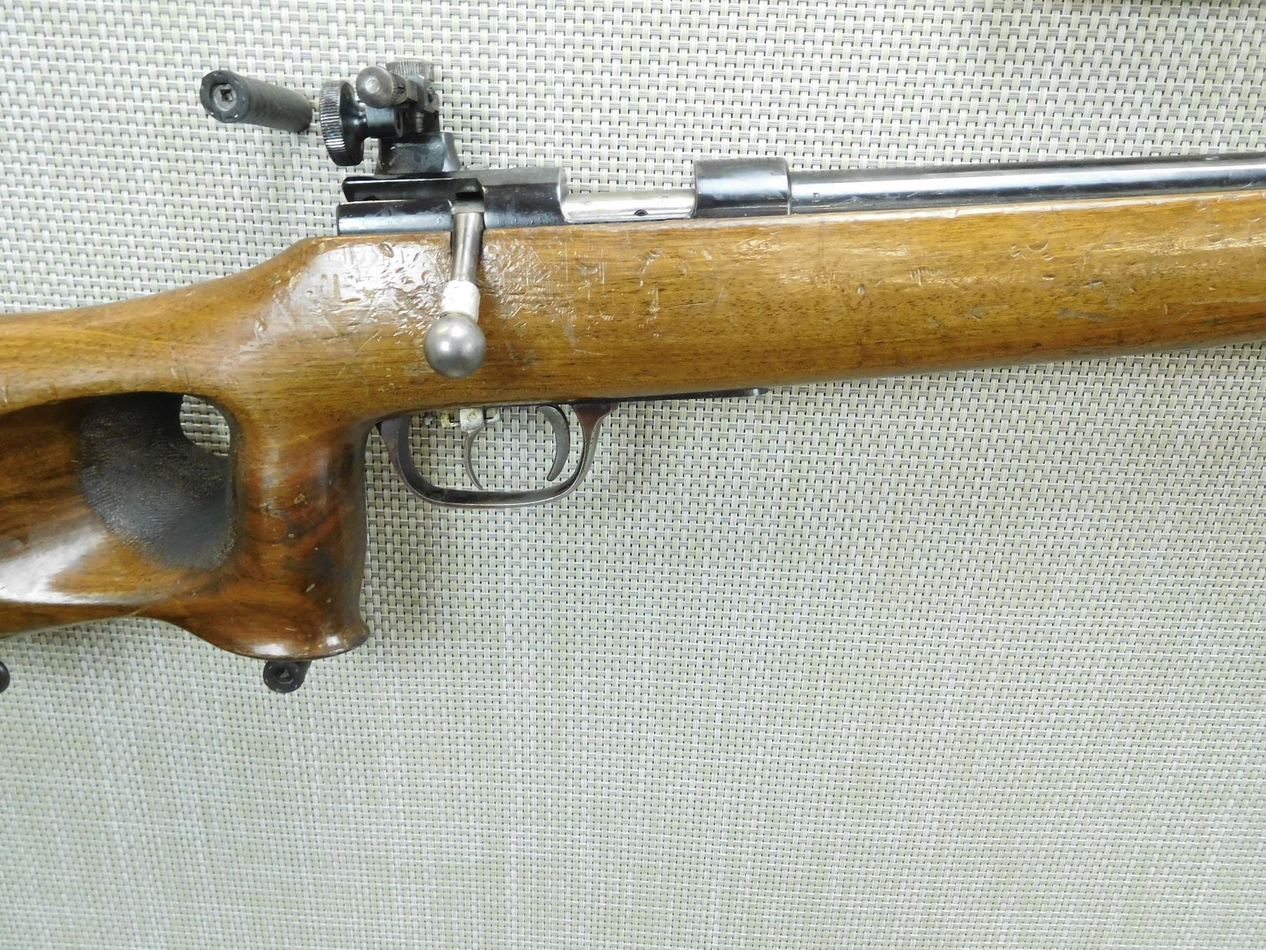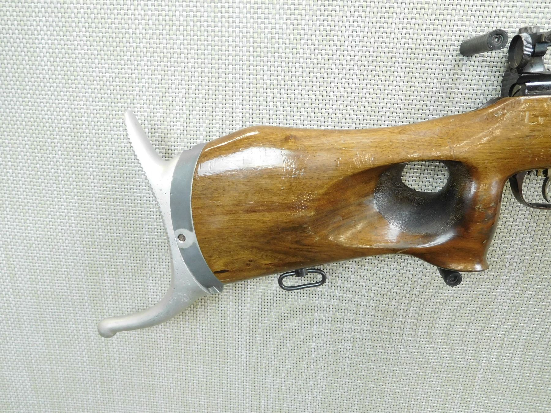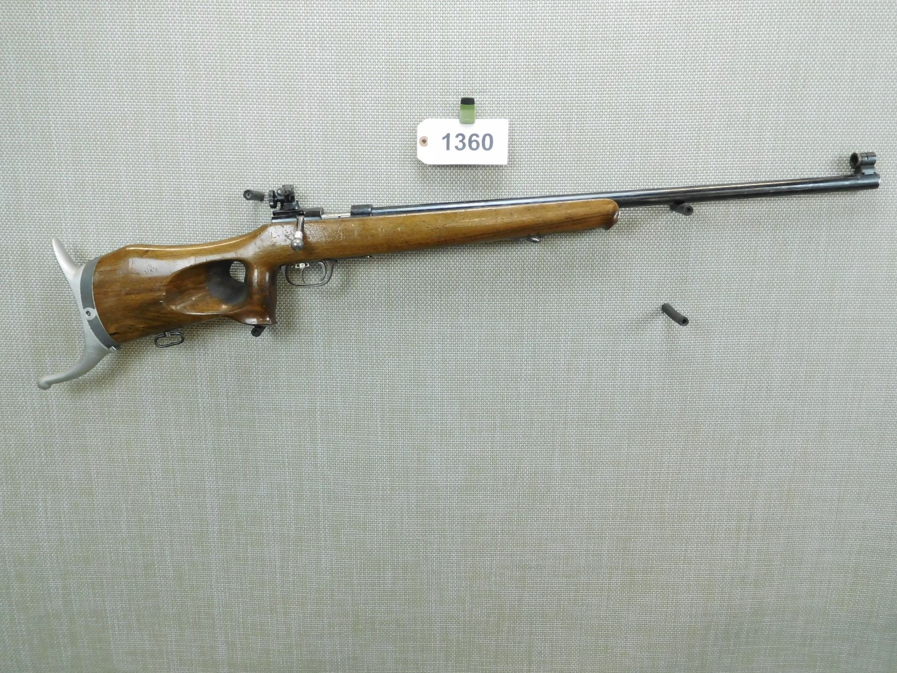 BORE IS VERY GOOD, HEAVY BARREL, ADJUSTABLE FRONT AND PEEP APERTURE REAR SIGHT, THUMBHOLE STOCK FEATURES A FULLY ADJUSTABLE SCHUTZEN BUTT PLATE, SET TRIGGER, SLING LOOPS, SHOWS SOME HANDLING MARKS , SERIAL # 1662 , ACTION: BOLT ACTION RIFLE , BARREL LENGTH: 28" , CONDITION: 5/10 , STOCK # 7716 , CLASS: CANADIAN NON RESTRICTED CLASS