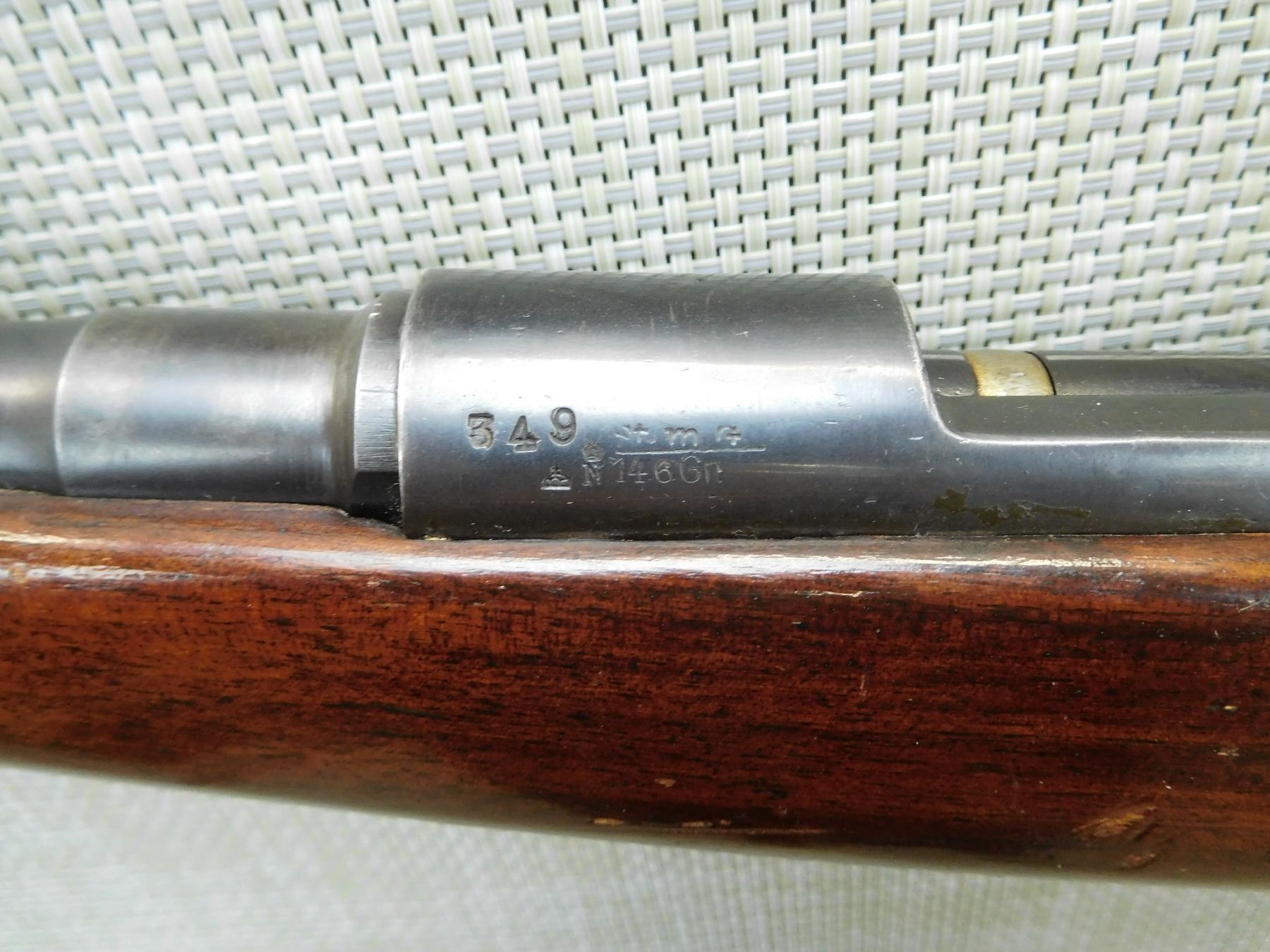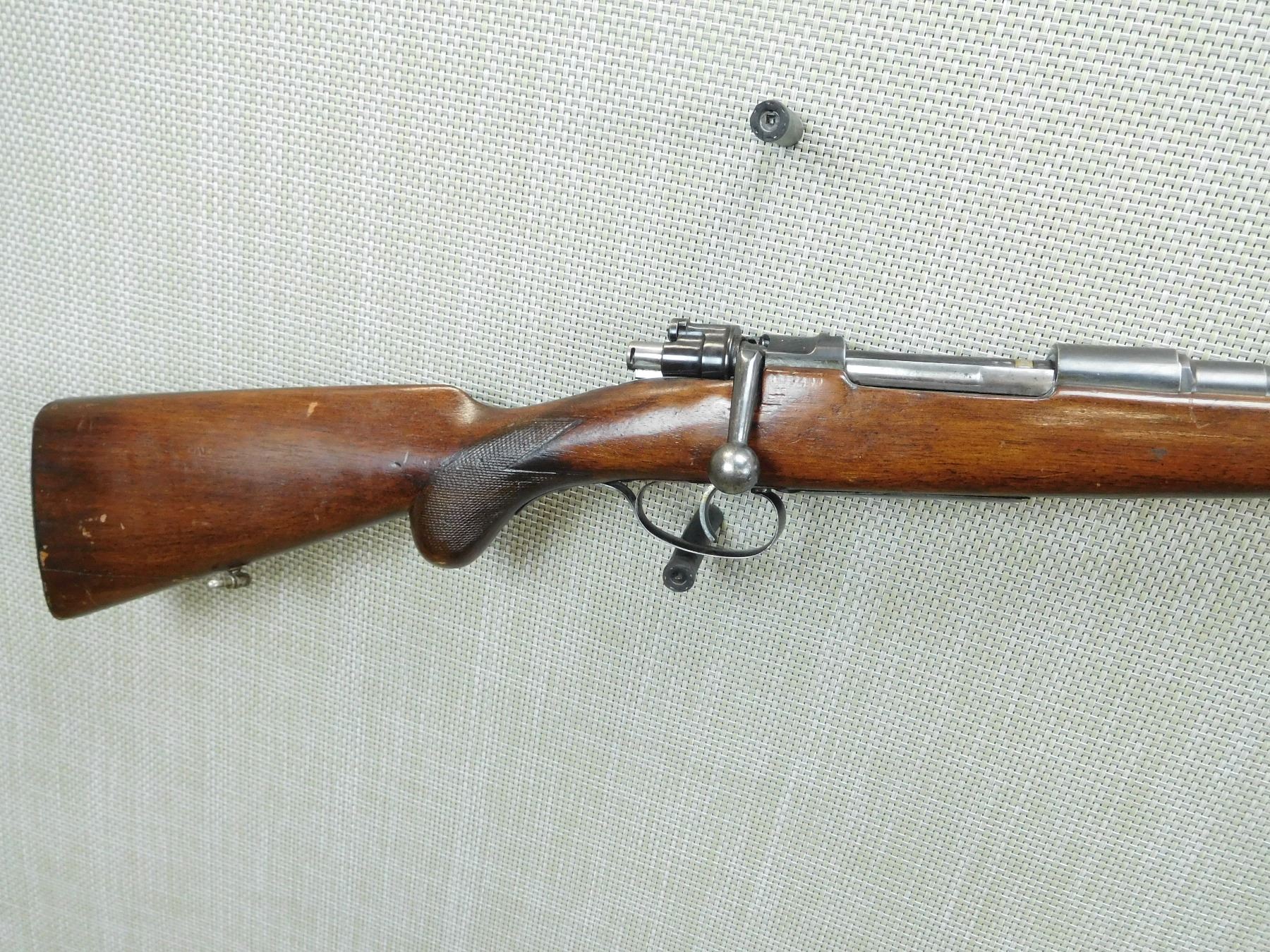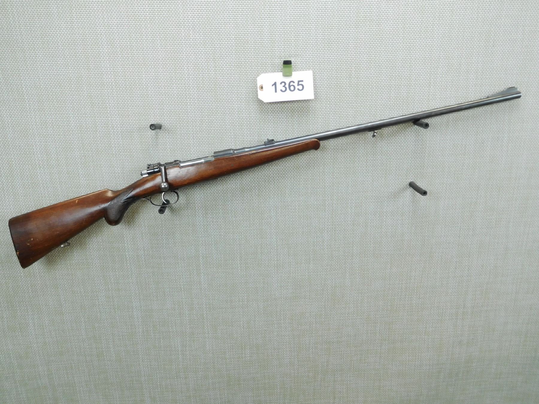BORE IS VERY GOOD, RAMP FRONT AND FLIP ADJUSTABLE EXPRESS REAR SIGHT, CHECKERED SEMI PISTOL GRIP BUTT STOCK WITH STEEL BUTT PLATE AND RAISED CHEEK PIECE, SLING SWIVELS, SHOWS SOME HANDLING MARKS , SERIAL # 349 , ACTION: BOLT ACTION RIFLE , BARREL LENGTH: 25" , CONDITION: 5/10 , STOCK # 7721 , CLASS: CANADIAN NON RESTRICTED CLASS