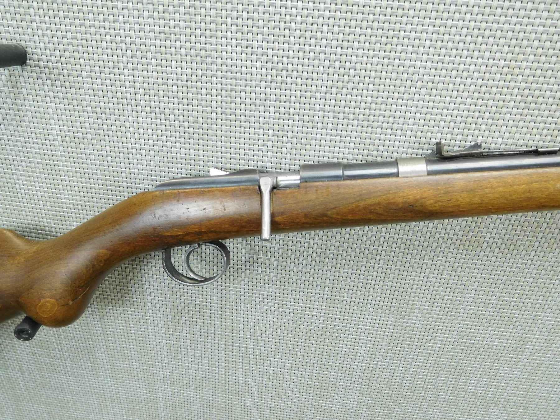 BORE IS GOOD, BLADE FRONT AND ADJUSTABLE REAR SIGHT, RECEIVER IS DRILLED AND TAPPED FOR SCOPE MOUNTS, BOLT KNOB IS MISSING, SLING SWIVEL LOOPS, STEEL BUTT PAD , SERIAL # 67864 , ACTION: BOLT ACTION SINGLE SHOT , BARREL LENGTH: 24" , CONDITION: 4/10 , STOCK # 7722 , CLASS: CANADIAN NON RESTRICTED CLASS