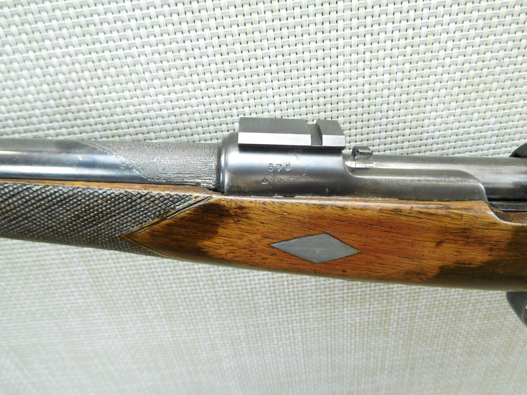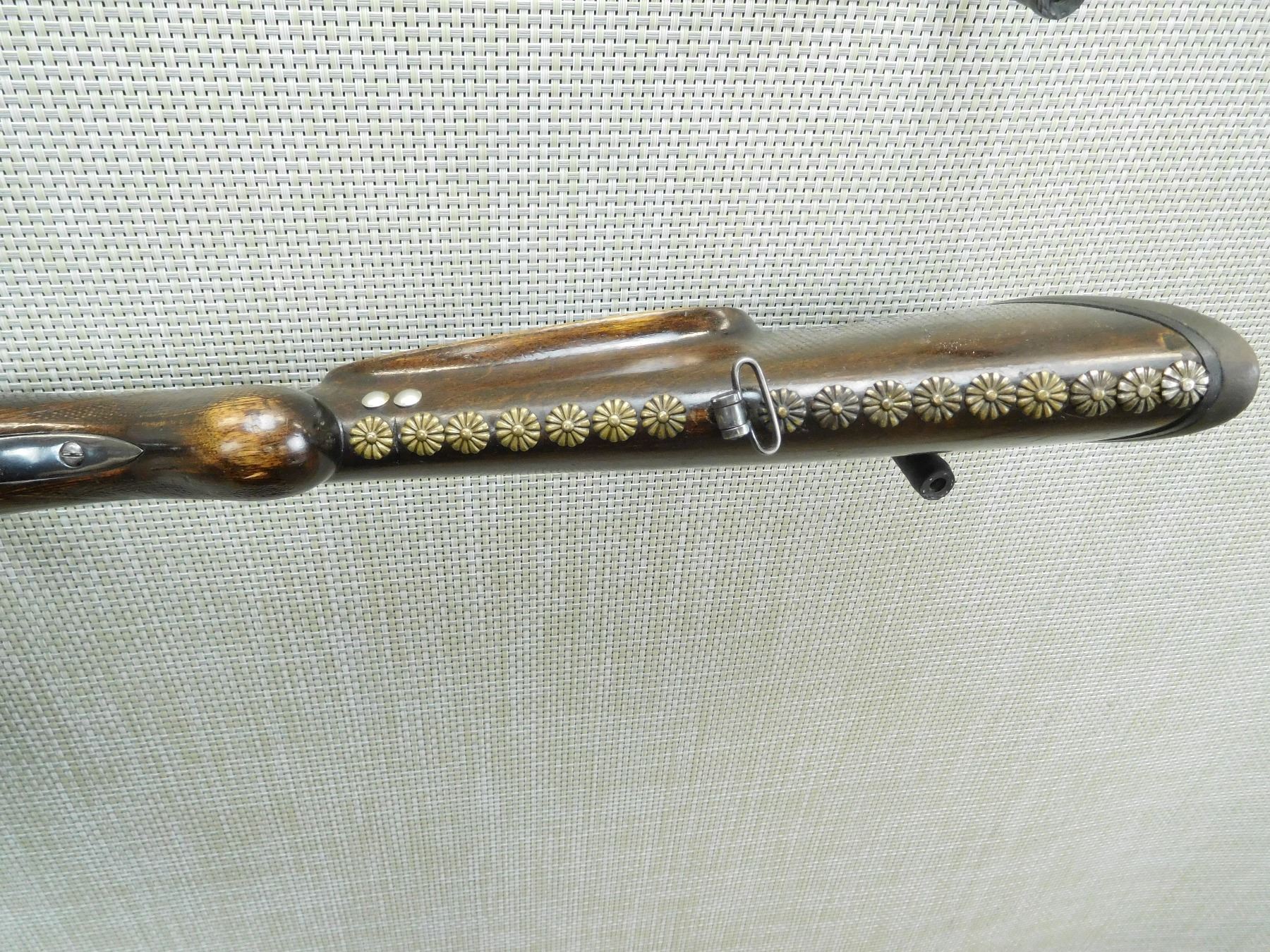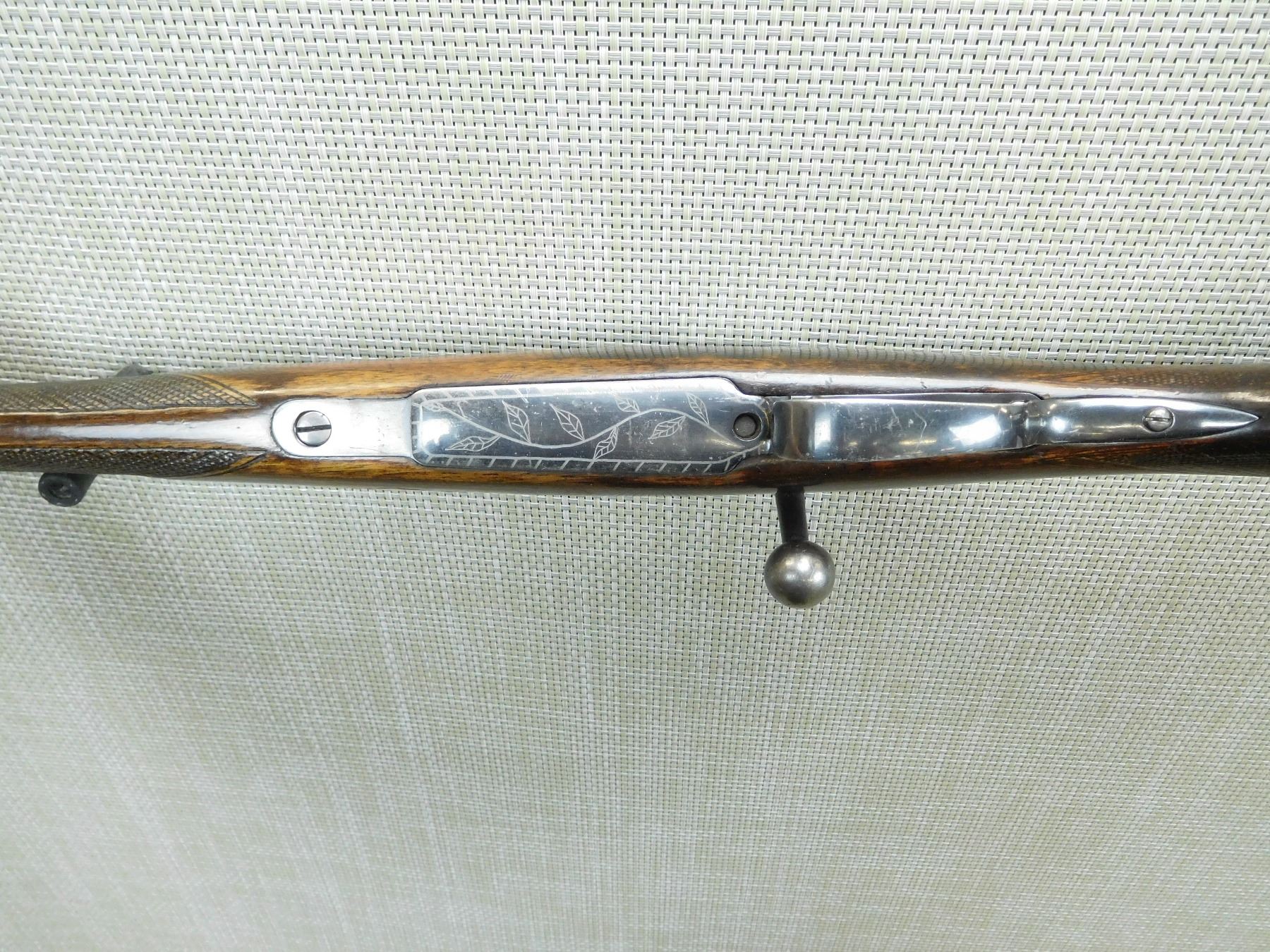 BORE IS DARK, RAMP FRONT AND FLIP ADJUSTABLE REAR SIGHT, SCOPE MOUNTS, BUTT STOCK IS CHIPPED AT THE TOP TANG, HOME MADE ENGRAVING AND CHECKERING, SLING SWIVELS, RUBBER BUTT PAD, TACKS ADDED TO BOTTOM OF BUTT STOCK , SERIAL # 579 , ACTION: BOLT ACTION RIFLE , BARREL LENGTH: 21" , CONDITION: 3/10 , STOCK # 7725 , CLASS: CANADIAN NON RESTRICTED CLASS