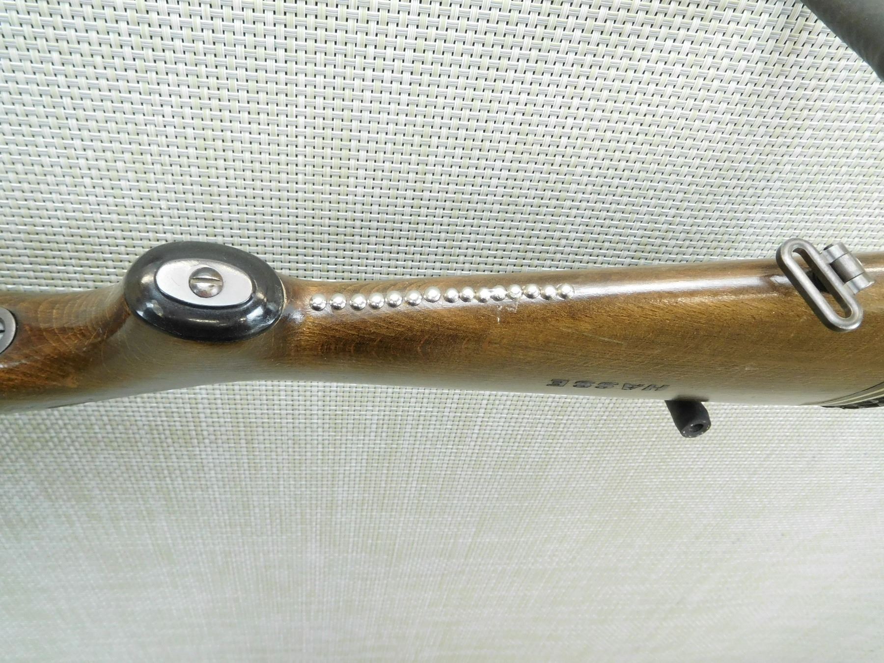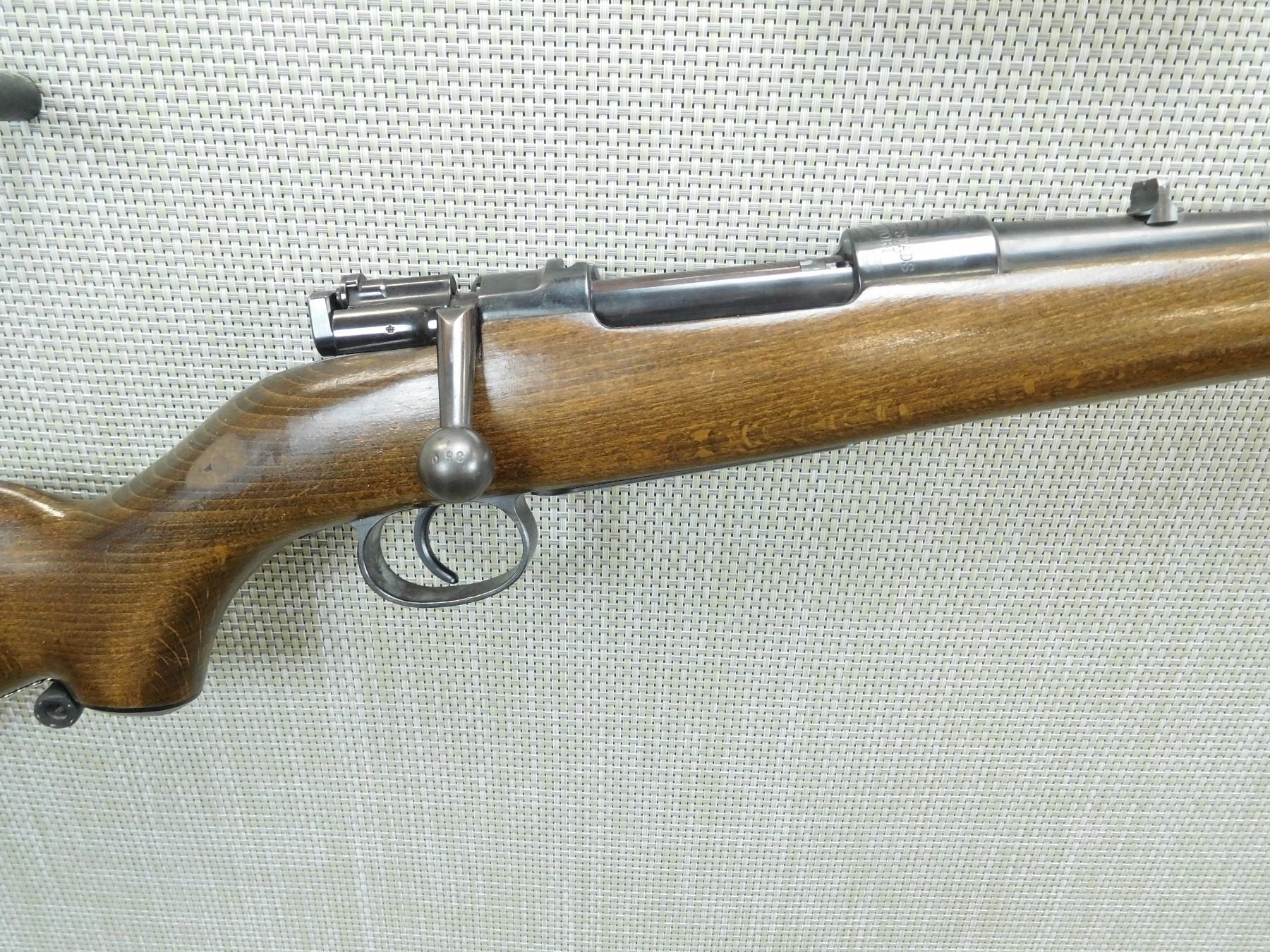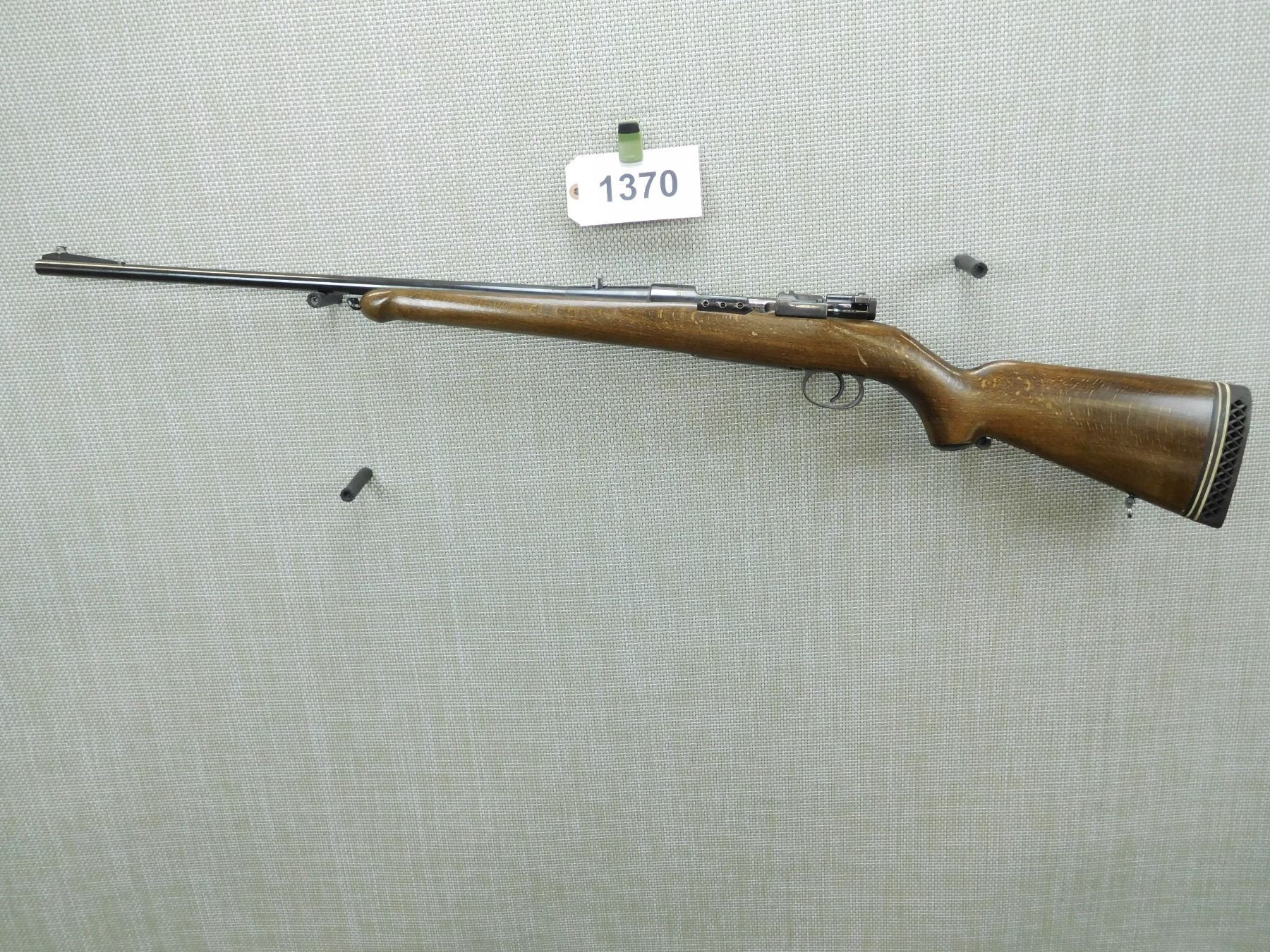 BORE IS GOOD, DOVETAIL FRONT AND FIXED REAR SIGHTS, CAPPED PISTOL GRIP BUTT STOCK WITH VENTED RUBBER RECOIL PAD, TACKS ADED TO UNDER SIDE OF BUTT STOCK, RECEIVER IS DRILLED AND TAPPED FOR SCOPE MOUNT , SERIAL # 63350 , ACTION: BOLT ACTION RIFLE , BARREL LENGTH: 24" , CONDITION: 4/10 , STOCK # 7726 , CLASS: CANADIAN NON RESTRICTED CLASS