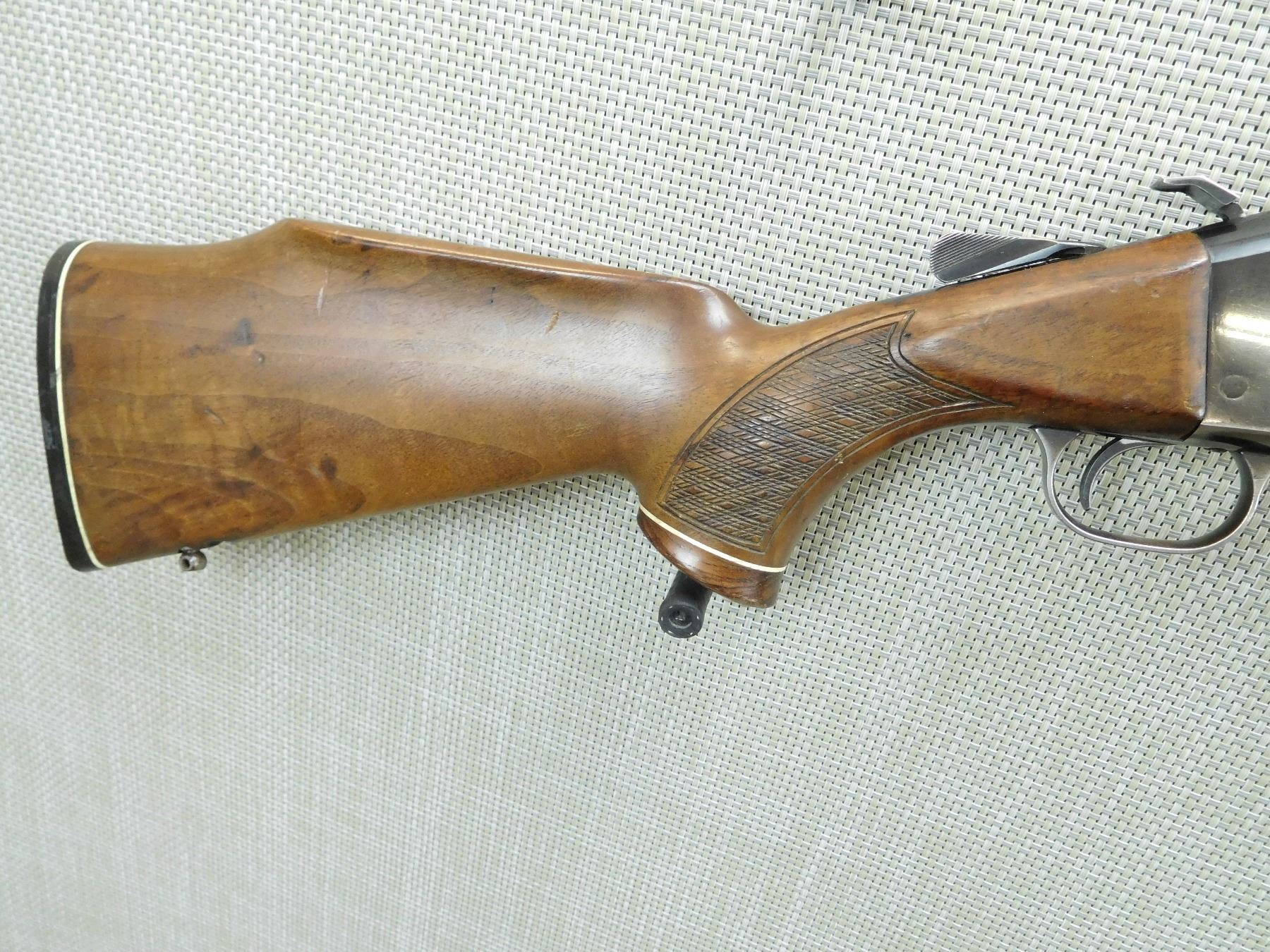 BORE IS EXCELLENT, VENTED RIB BARREL WITH DOVETAIL FRONT AND FIXED REAR SIGHT, SCOPE RAIL ADDED, CHECKERED FOREND AND CAPPED PISTOL GRIP BUTT STOCK WITH RAISED CHEEK PIECE, SLING SWIVEL STUDS, RUBBER BUTT PLATE, EXTRA HOLE DRILLED IN THE BUTT STOCK , SERIAL # 35295 , ACTION: COMBINATION OVER UNDER , BARREL LENGTH: 24" , CONDITION: 5/10 , STOCK # 7728 , CLASS: CANADIAN NON RESTRICTED CLASS