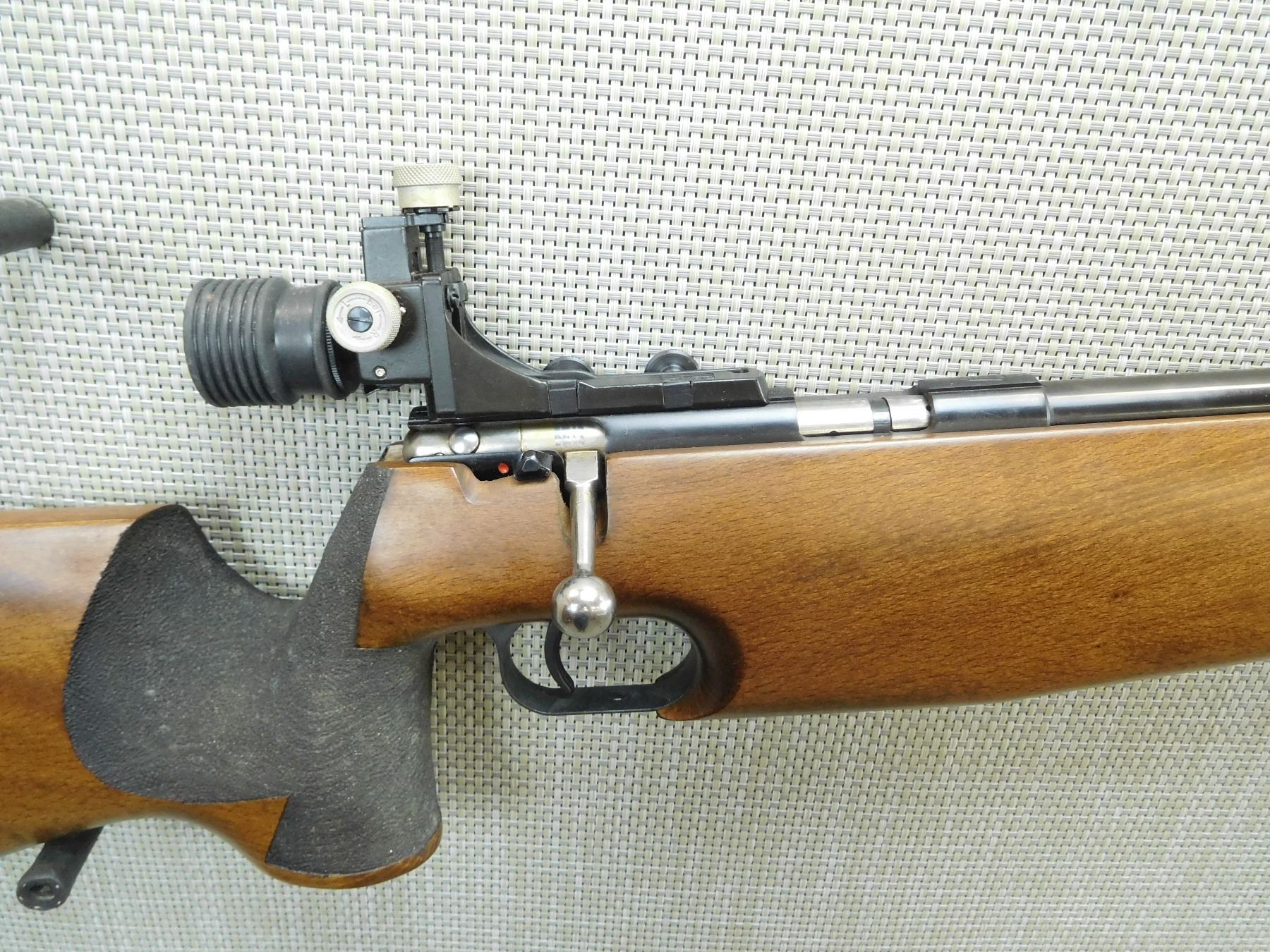 COMES WITH HARD CASE AND KEY, 1 EXTRA SPACER, INSERTS FOR FRONT GLOBE SIGHT, HEAVY BARREL, BORE IS VERY GOOD, ADJUSTABLE SLING SWIVELS, STIPPLE VERTICAL PISTOL GRIP, HOODED FRONT AND REAR APERTURE SIGHT, ADJUSTABLE BUTT PLATE , SERIAL # 1275326 , ACTION: BOLT ACTION RIFLE , BARREL LENGTH: 24 1/2" , CONDITION: 8/10 , STOCK # 7747 , CLASS: CANADIAN NON RESTRICTED CLASS