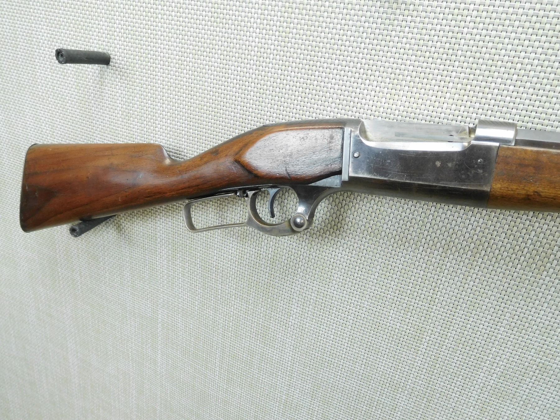OCTAGONAL BARREL, BORE IS GOOD, BLADE FRONT AND ADJUSTABLE REAR SIGHT, DRILLED AND TAPPED FOR REAR APERTURE SIGHT, SHOWS SOME HANDLING MARKS, CHIP OUT OF FOREND FOR SIGHT ATTACHMENT, BARREL HAS BEEN DRILLED AND FILLED WITH SCREWS NEAR THE FOREND TIP , SERIAL # 28.003 , ACTION: LEVER ACTION RIFLE , BARREL LENGTH: 26" , CONDITION: 5/10 , STOCK # 7752 , CLASS: CANADIAN NON RESTRICTED CLASS