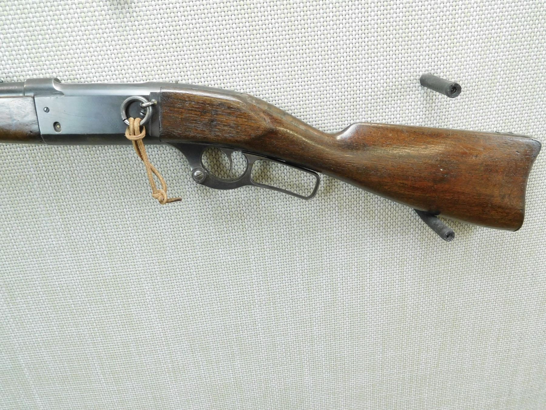 BORE IS DARK, DOVETAIL FRONT AND ADJUSTABLE REAR SIGHT, BUTT STOCK IS CRACKED BEHIND THE UPPER TANG, STEEL BUTT PLATE, SHOWS SOME HANDLING MARKS , SERIAL # 177646 , ACTION: LEVER ACTION RIFLE , BARREL LENGTH: 20" , CONDITION: 6/10 , STOCK # 7757 , CLASS: CANADIAN NON RESTRICTED CLASS