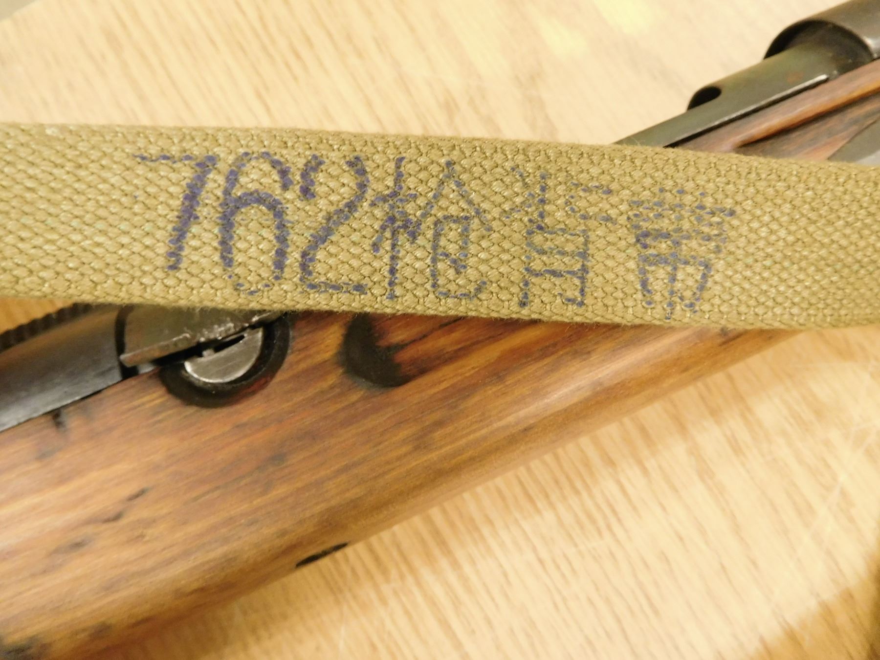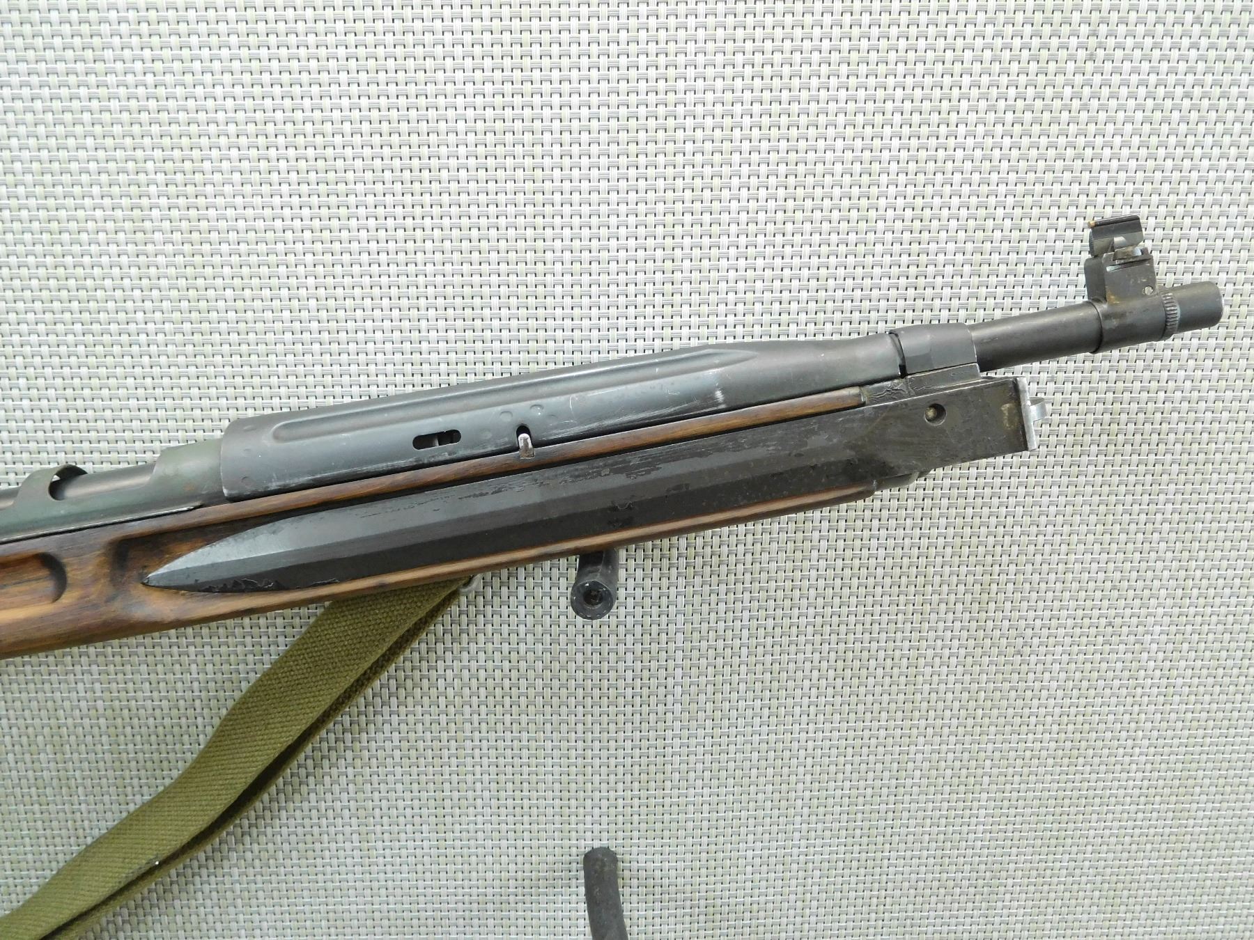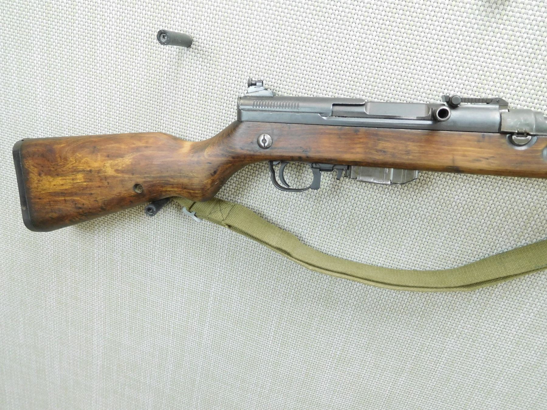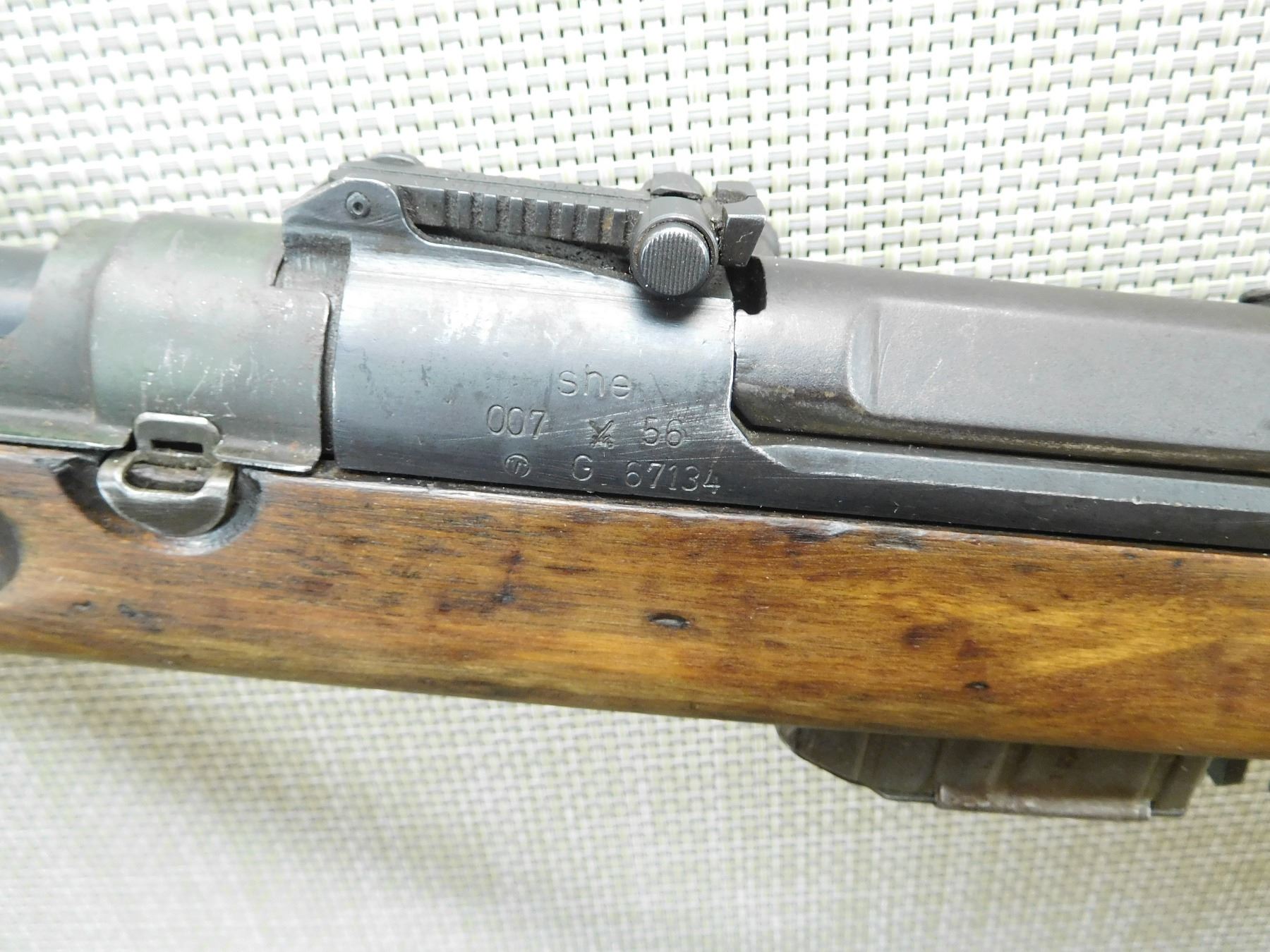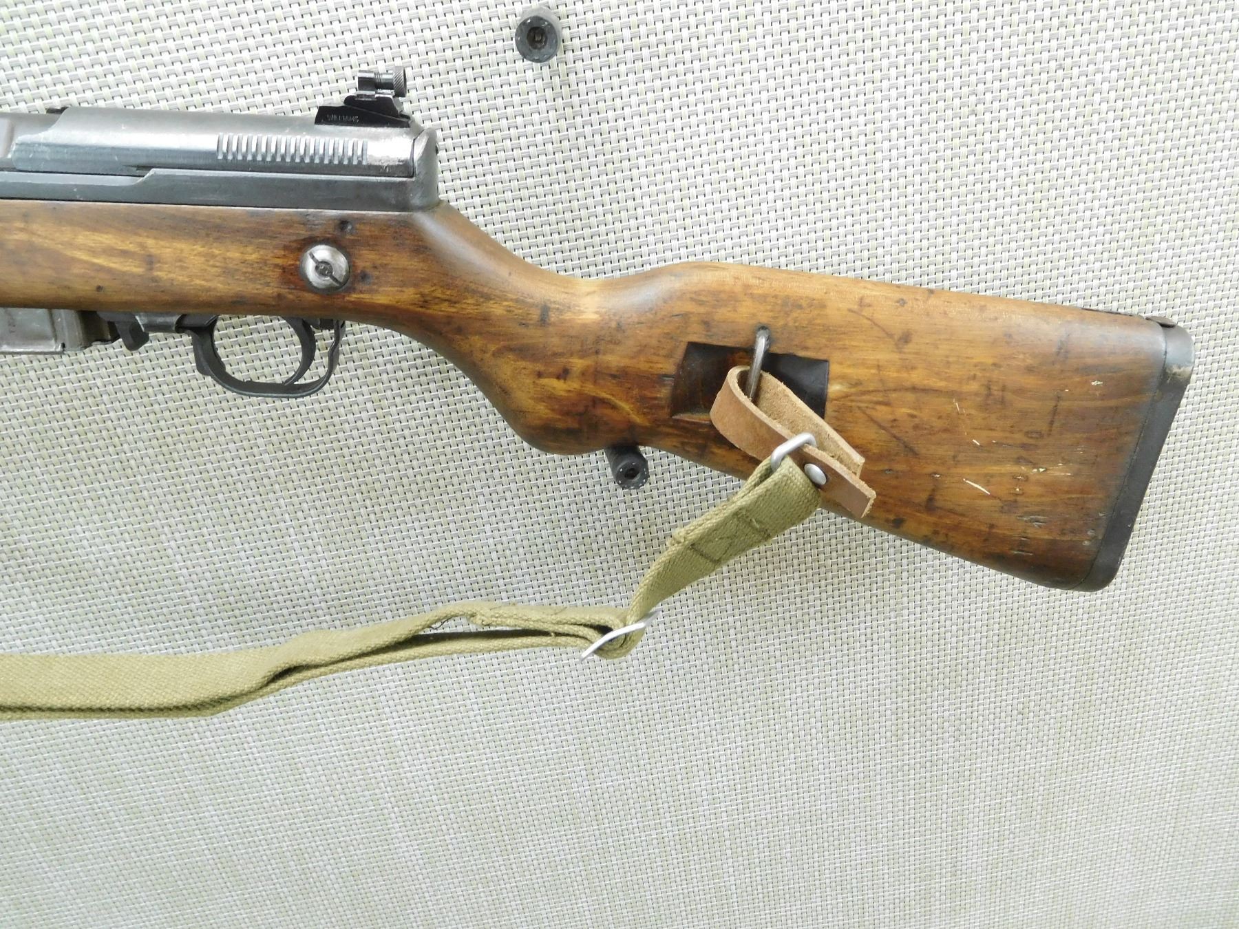 COMES WITH MAGAZINE, DARK BORE, RETAINS SIDE FOLDING BAYONET, ORIGINAL CANVAS SLING, SHOWS SOME HANDLING MARKS, BLADE FRONT AND ADJUSTABLE REAR SIGHT, THERE IS SOMETHING MISSING AT THE HEAL OF THE BUTT STOCK ( WOOD IS MISSING AND THERE IS A DRILLED HOLE) WILLIAMS PEEP SIGHT HAS BEEN ADDED , SERIAL # 67134 , ACTION: SEMI AUTOMATIC RIFLE , BARREL LENGTH: 20" , CONDITION: 6/10 , STOCK # 7758 , CLASS: CANADIAN NON RESTRICTED CLASS