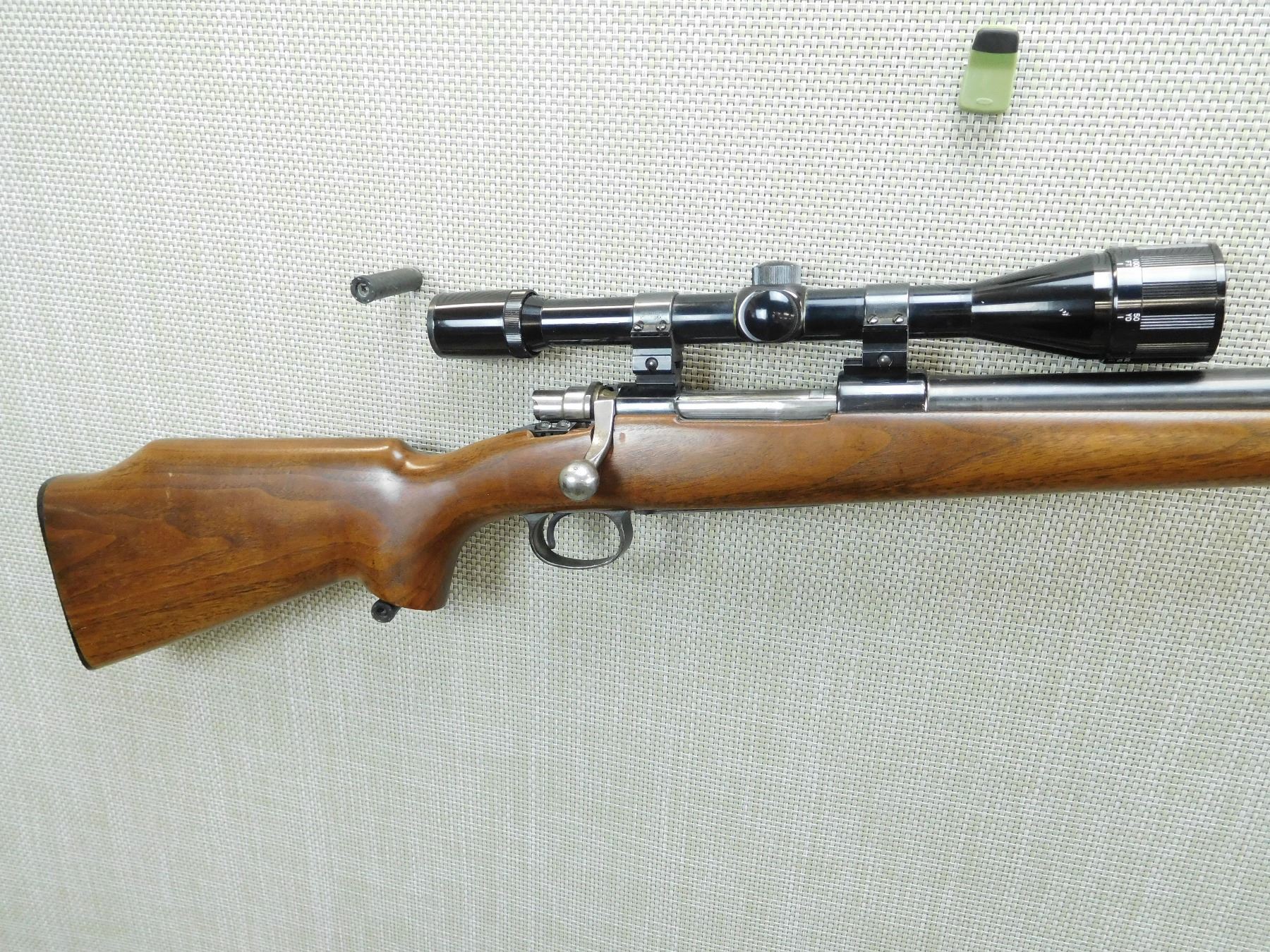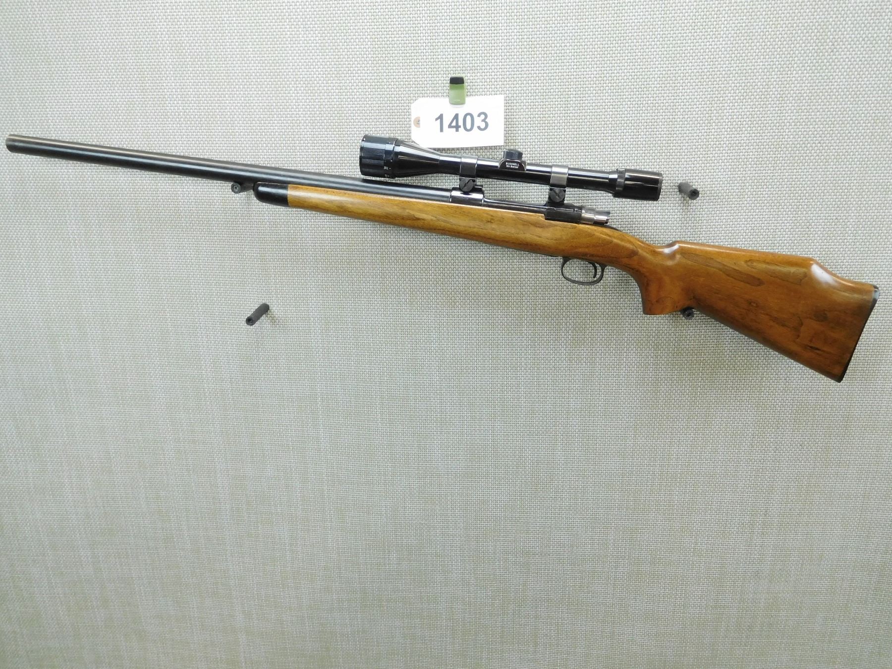 HEAVY BARREL, GOOD BORE, WITH BUSHNELL 10X POWER SCOPE, NO SIGHTS, MONTE CARLO STOCK WITH PLASTIC BUTT PLATE, APPEARS TO BE A SANTA BARBARA ACTION, SHOWS SOME HANDLING MARKS , SERIAL # Y2836 , ACTION: BOLT ACTION RIFLE , BARREL LENGTH: 26" , CONDITION: 7/10 , STOCK # 7759 , CLASS: CANADIAN NON RESTRICTED CLASS