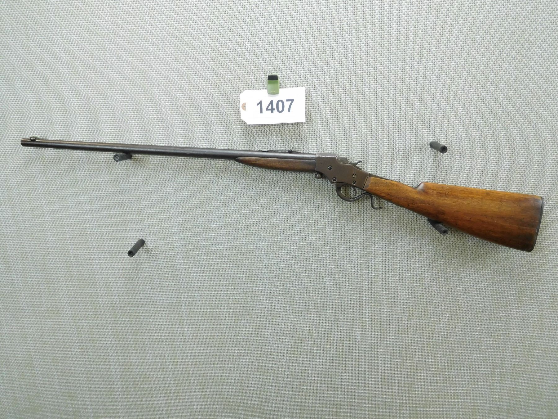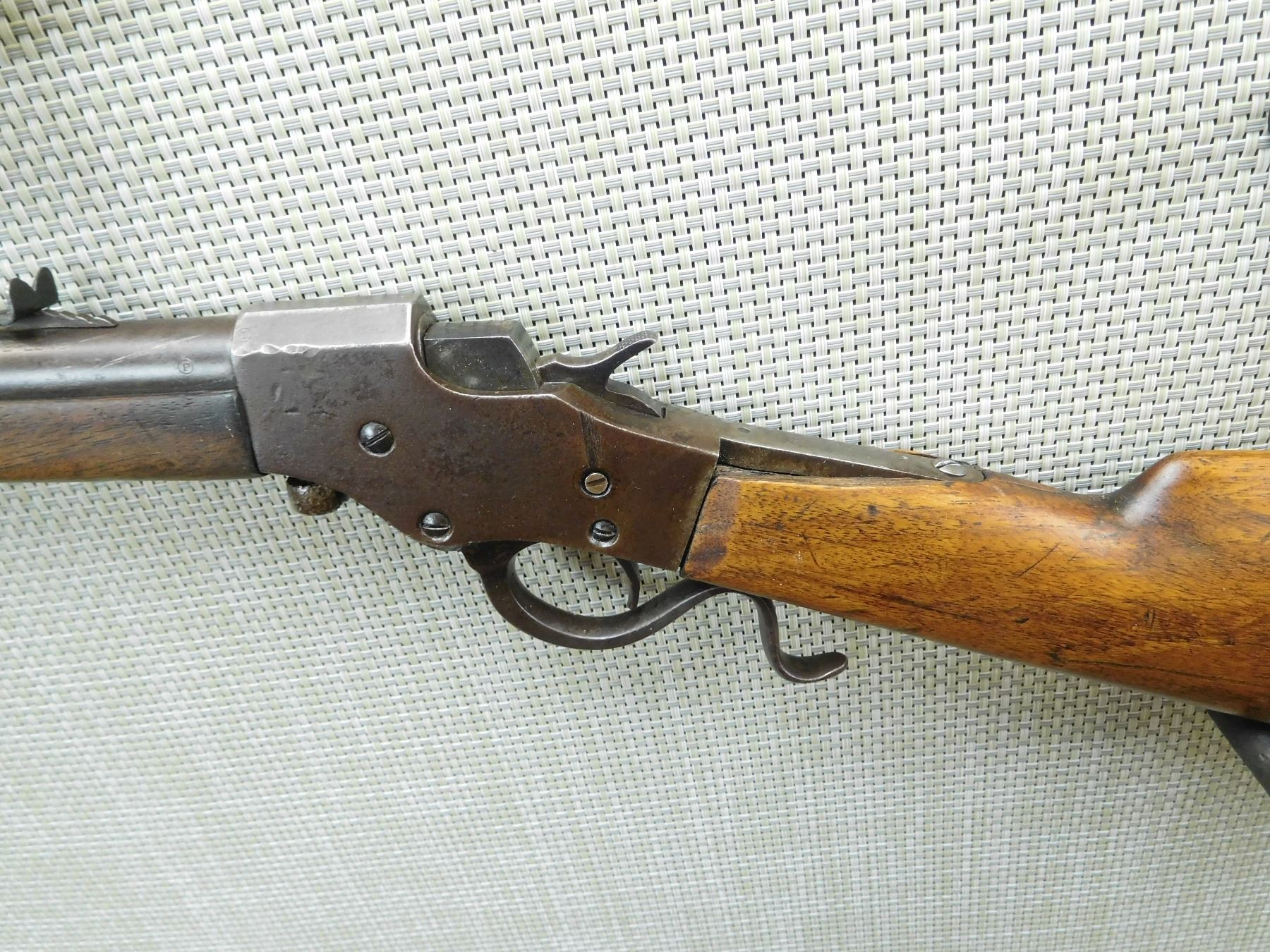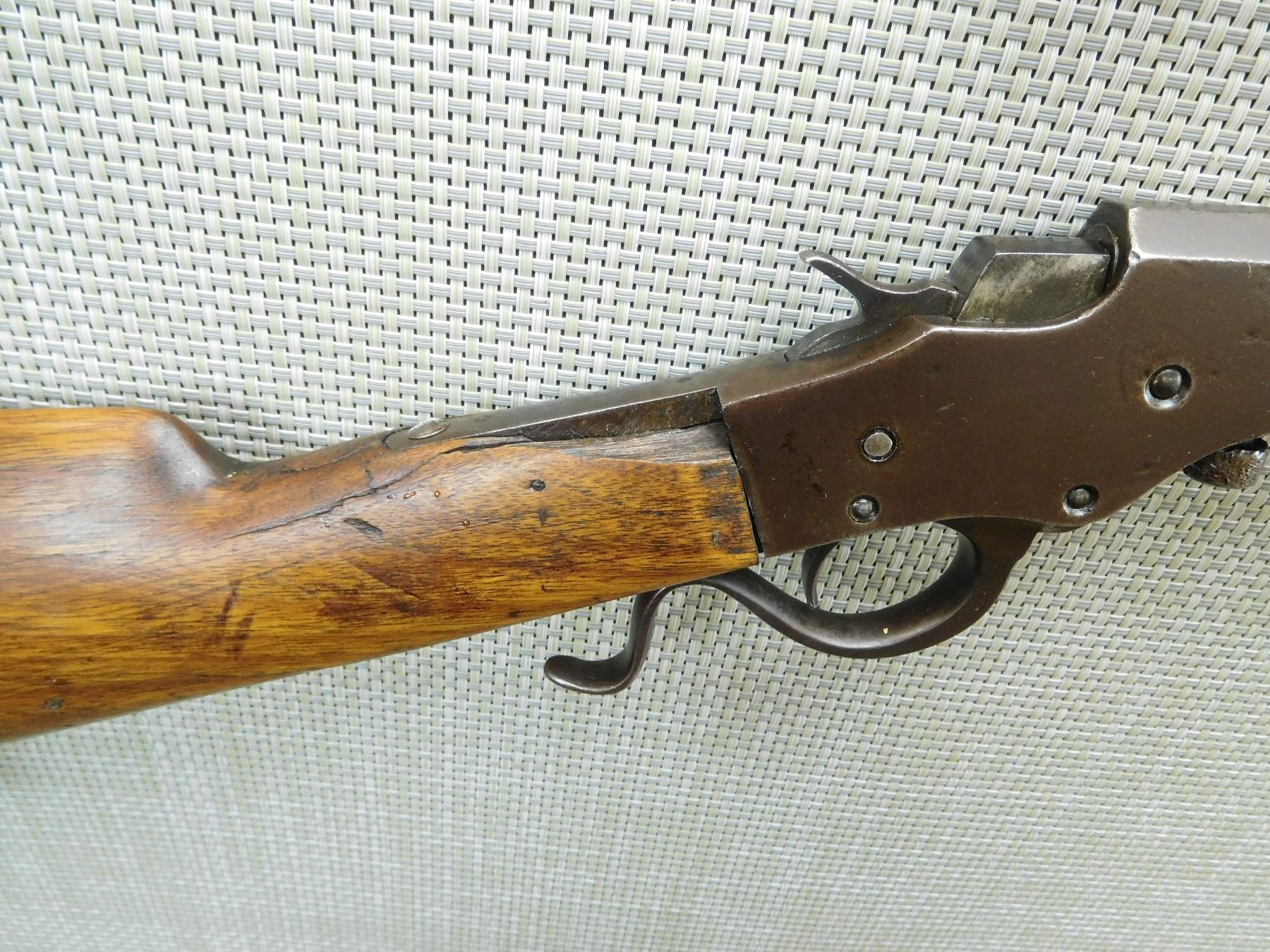 BORE IS DARK, BUTT STOCK IS LOOSE AND CHIPPED, BLADE FRONT AND ADJUSTABLE REAR SIGHT, REPLACED BUTT PLATE , SERIAL # N/A , ACTION: FALLING BLOCK ACTION , BARREL LENGTH: 24" , CONDITION: 3/10 , STOCK # 7763 , CLASS: CANADIAN NON RESTRICTED CLASS
