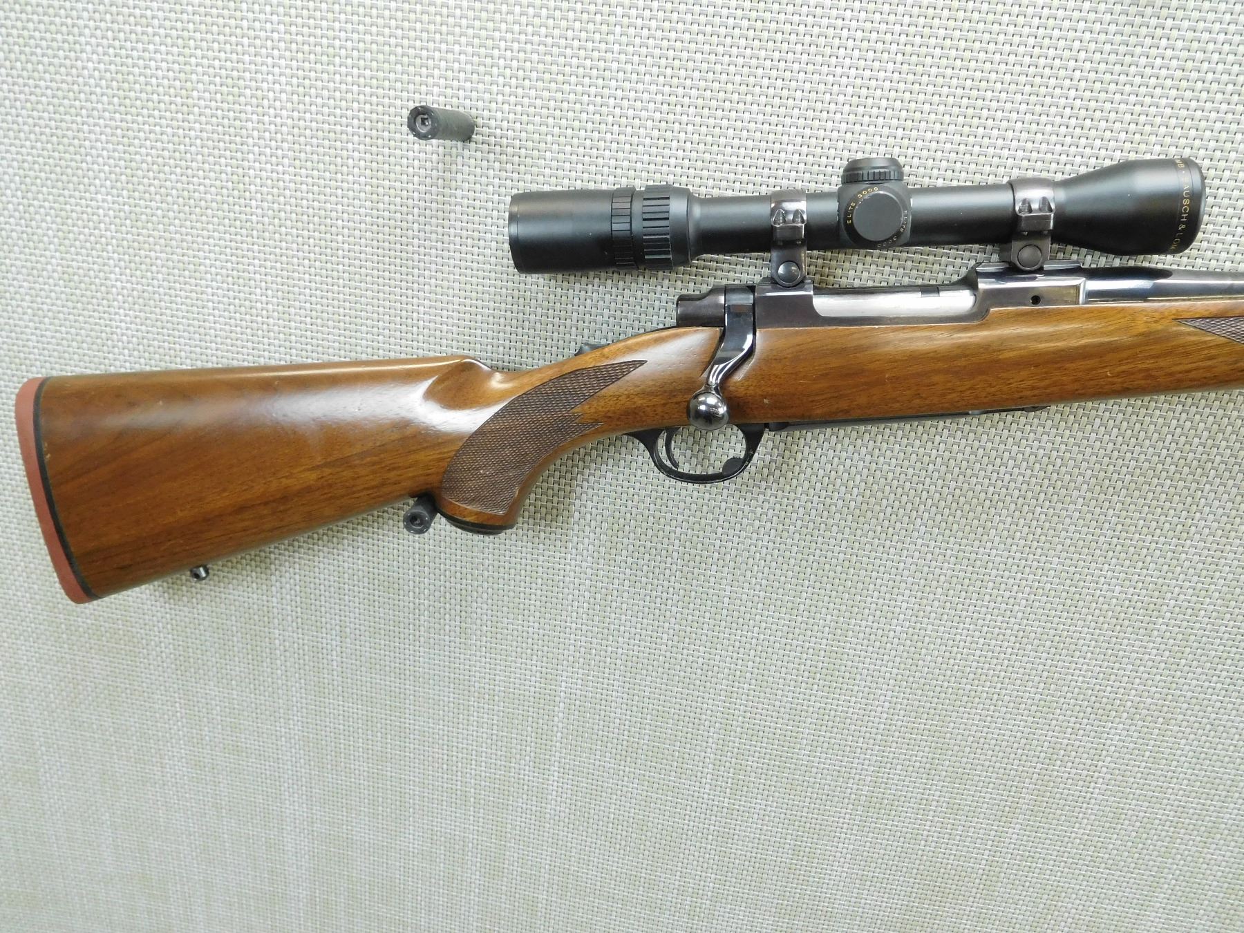 HINGED FLOOR PLATE, BORE IS VERY GOOD, NO SIGHTS BUT FEATURES A BAUSCH AND LOMB 2 - 7 POWER SCOPE, CHECKERED FOREND AND CAPPED PISTOL GRIP BUTT STOCK, RUBBER BUTT PAD, SLING SWIVEL LOOPS , SERIAL # 7863673 , ACTION: BOLT ACTION RIFLE , BARREL LENGTH: 20" , CONDITION: 7/10 , STOCK # 7774 , CLASS: CANADIAN NON RESTRICTED CLASS