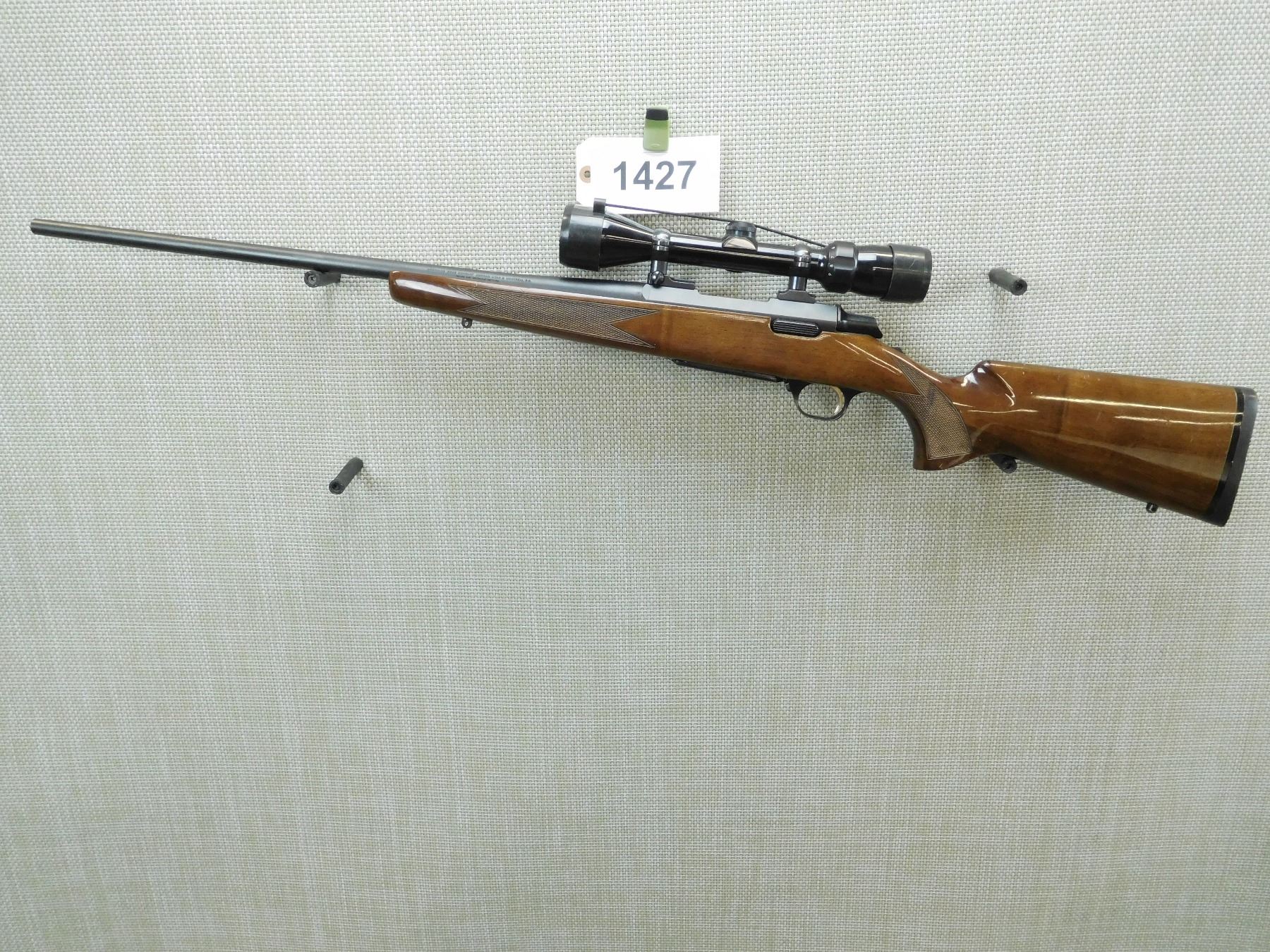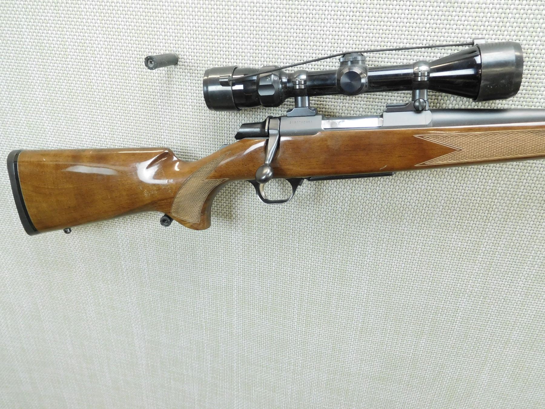 BORE IS EXCELLENT, NO SIGHTS BUT HAS A BUSHNELL 3 - 9 SCOPE, CHECKERED FOREND AND SEMI PISTOL GRIP BUTT STOCK WITH RUBBER RECOIL PAD, SLING SWIVEL STUDS , SERIAL # 21577MZ351 , ACTION: BOLT ACTION RIFLE , BARREL LENGTH: 22" , CONDITION: 8/10 , STOCK # 7783 , CLASS: CANADIAN NON RESTRICTED CLASS