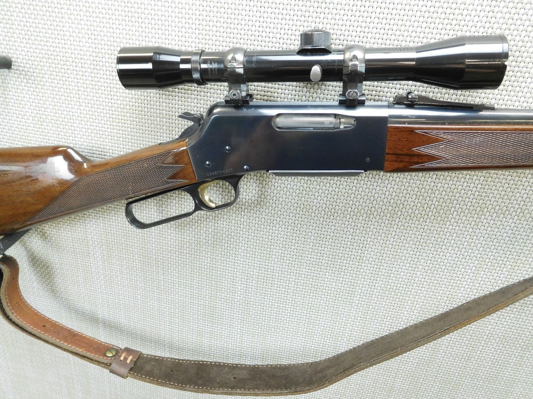 COMES WITH MAGAZINE, VERY GOOD BORE, RAMP FRONT AND ADJUSTABLE REAR SIGHT, ALSO INCLUDED IS A 4 X SCOPE, CHECKERED FOREND AND STRAIGHT GRIP BUTT STOCK, RUBBER RECOIL PAD, LEATHER SLING , SERIAL # 06887PN227 , ACTION: LEVER ACTION RIFLE , BARREL LENGTH: 20" , CONDITION: 8/10 , STOCK # 7806 , CLASS: CANADIAN NON RESTRICTED CLASS