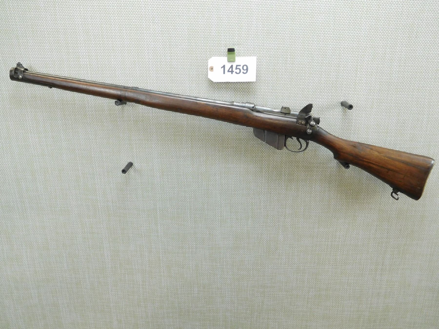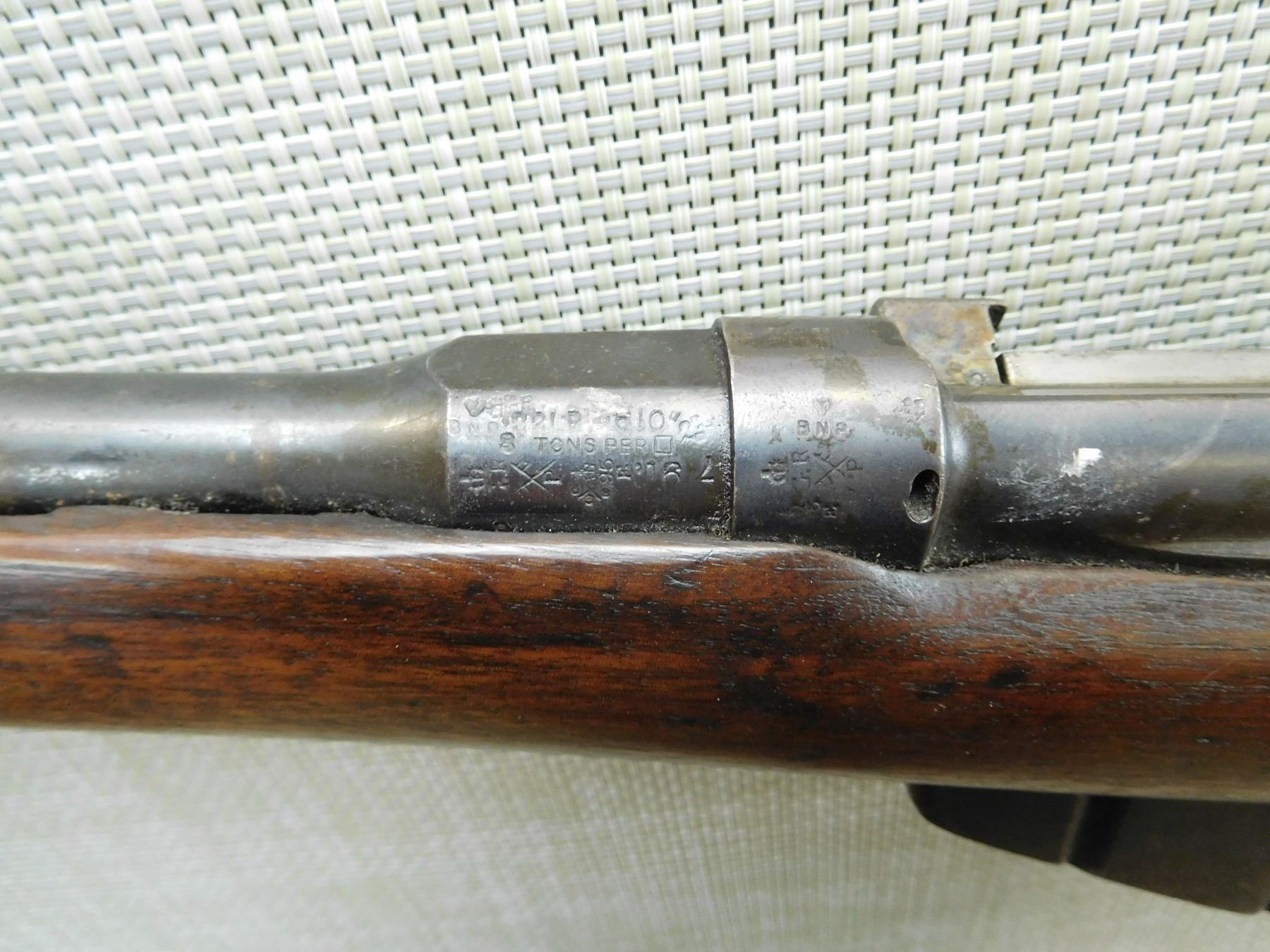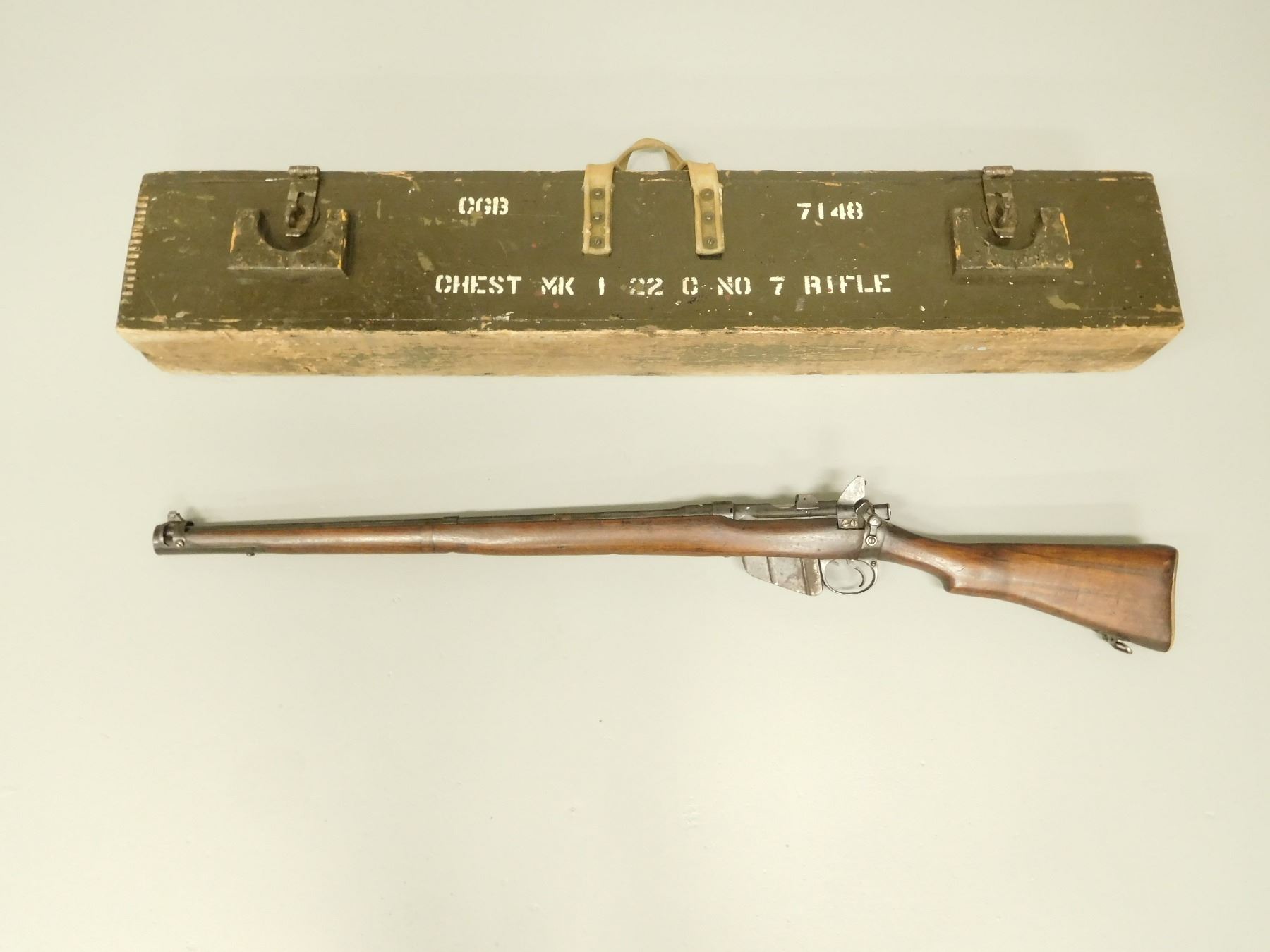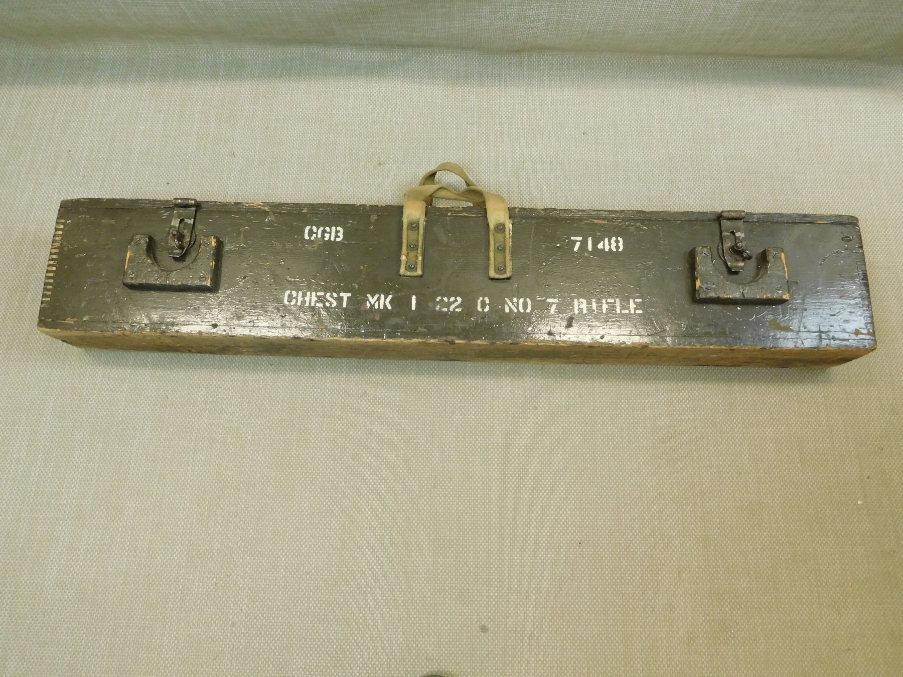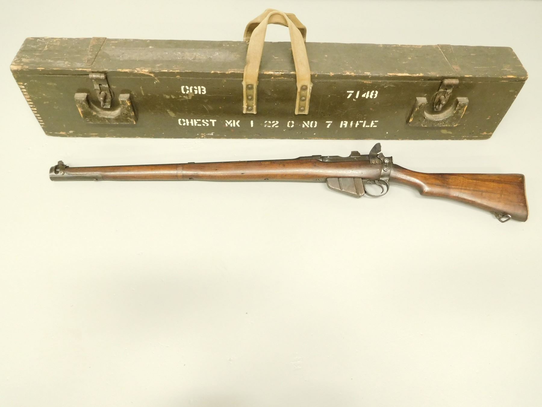 COMES WITH ORIGINAL MILITARY WOOD BOX CRATE AND MAGAZINE, A RARE FIND, BRD ARROW MARKED ON TRIGGER BAND, GOOD BORE, RAMP FRONT AND UNIQUE MILITARY PEEP SIGHT, SHOWS SOME HANDLING MARKS, ARMOURY STOCK MODIFICATIONS OR REPAIRS TO THE HEAL, TOE AND FORESTOCK, SERIAL # N8495 IS MATCHING ON RECEIVER, BARREL AND BRASS DISK, ACTION: BOLT ACTION RIFLE , BARREL LENGTH: 25" , CONDITION: 6/10 , STOCK # 7815 , CLASS: CANADIAN NON RESTRICTED CLASS