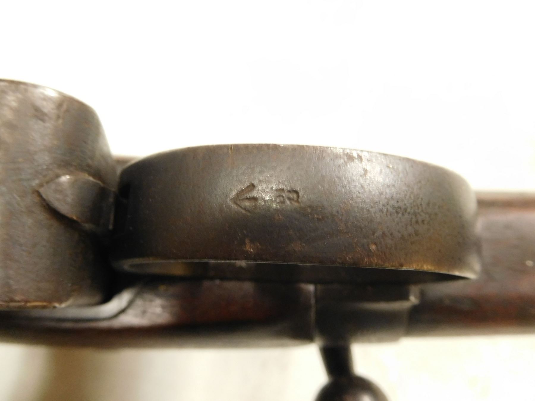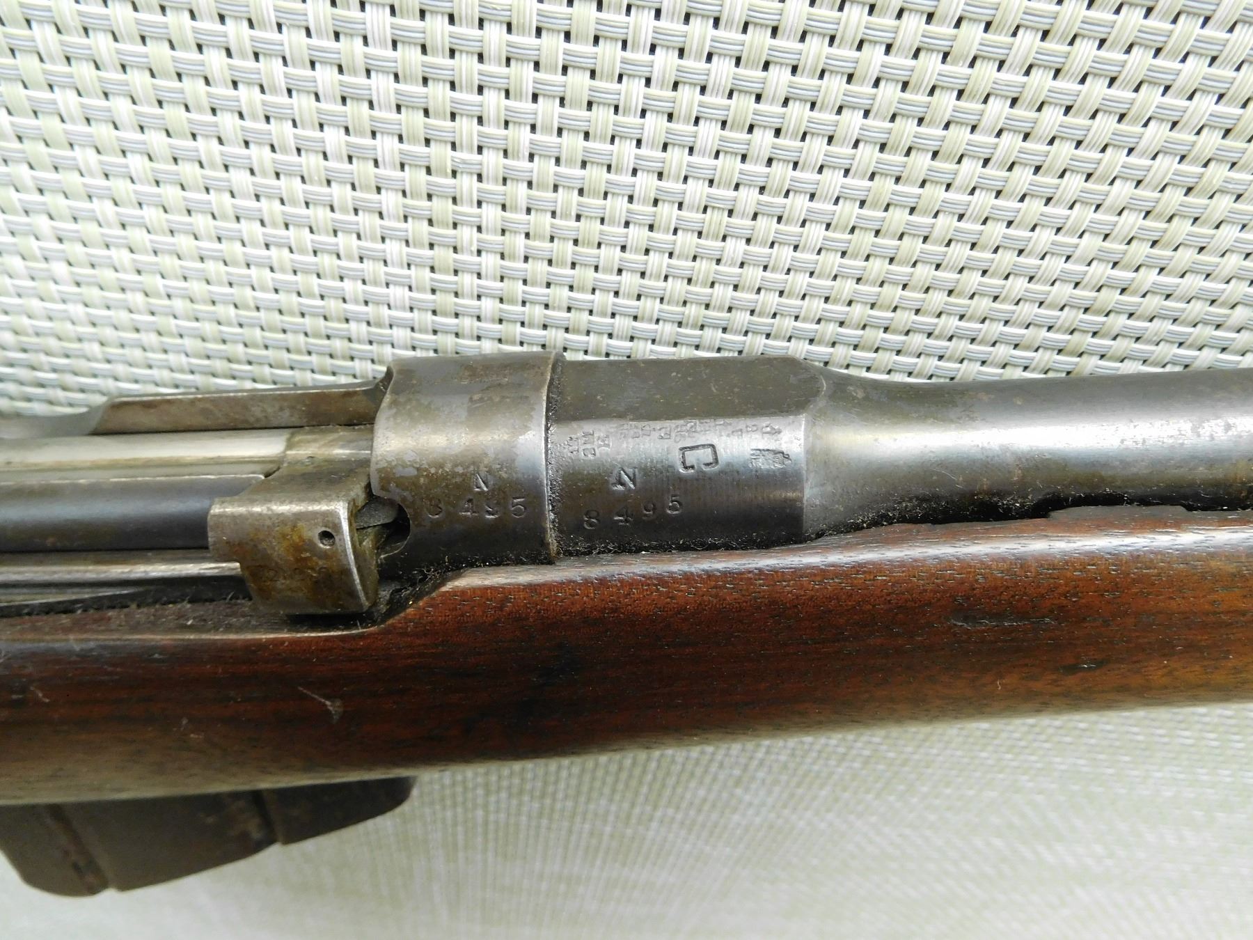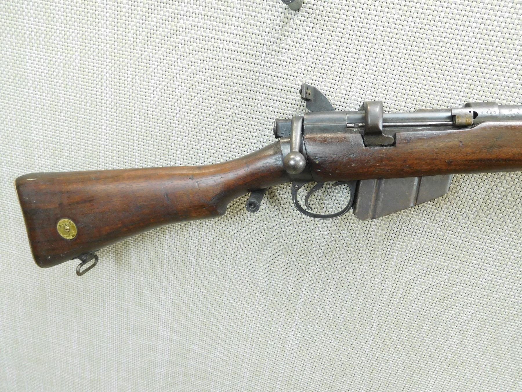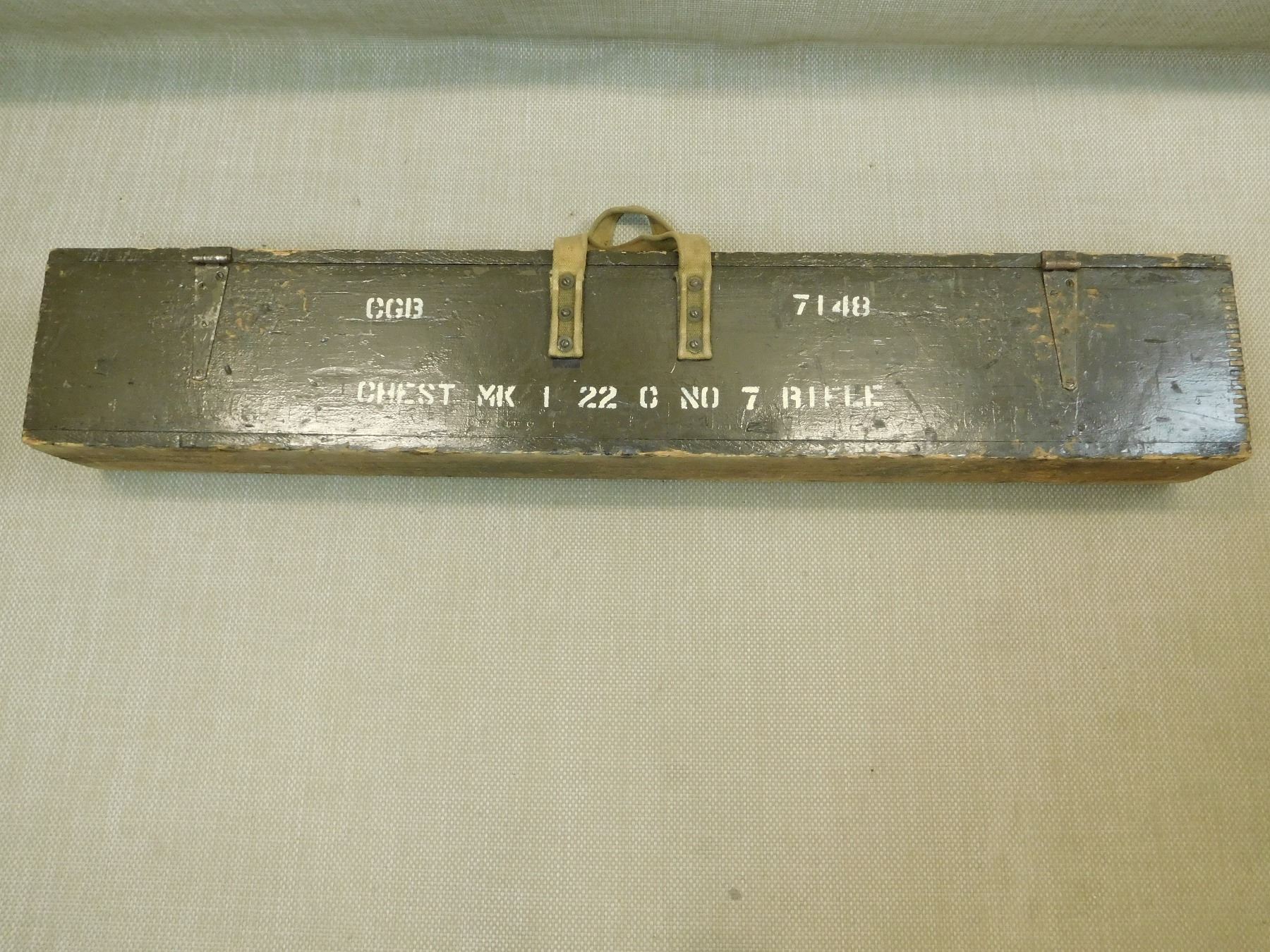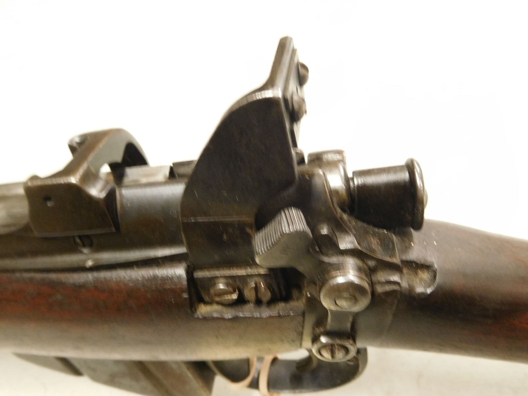 COMES WITH ORIGINAL MILITARY WOOD BOX CRATE AND MAGAZINE, A RARE FIND, BRD ARROW MARKED ON TRIGGER BAND, GOOD BORE, RAMP FRONT AND UNIQUE MILITARY PEEP SIGHT, SHOWS SOME HANDLING MARKS, ARMOURY STOCK MODIFICATIONS OR REPAIRS TO THE HEAL, TOE AND FORESTOCK, SERIAL # N8495 IS MATCHING ON RECEIVER, BARREL AND BRASS DISK, ACTION: BOLT ACTION RIFLE , BARREL LENGTH: 25" , CONDITION: 6/10 , STOCK # 7815 , CLASS: CANADIAN NON RESTRICTED CLASS