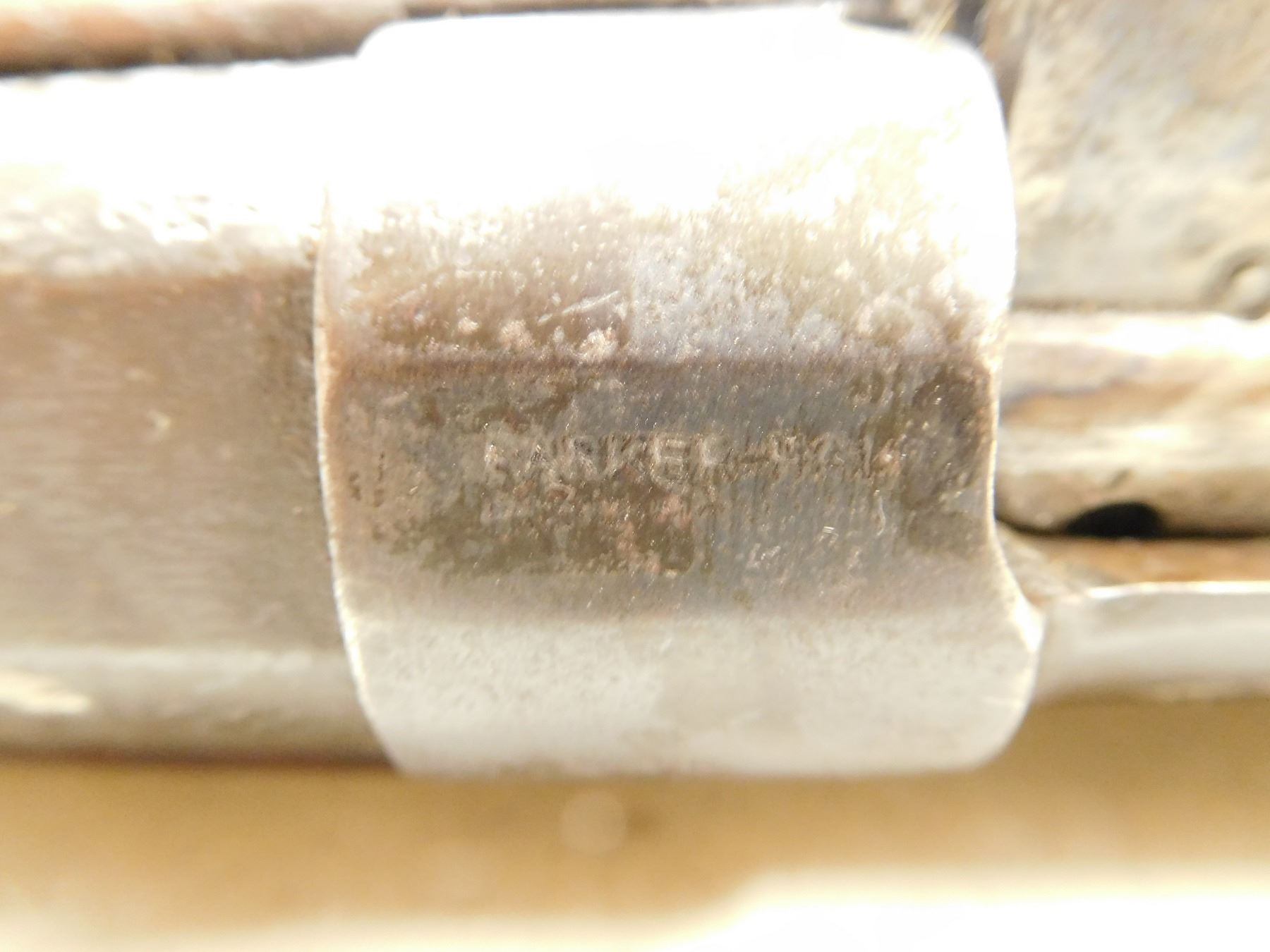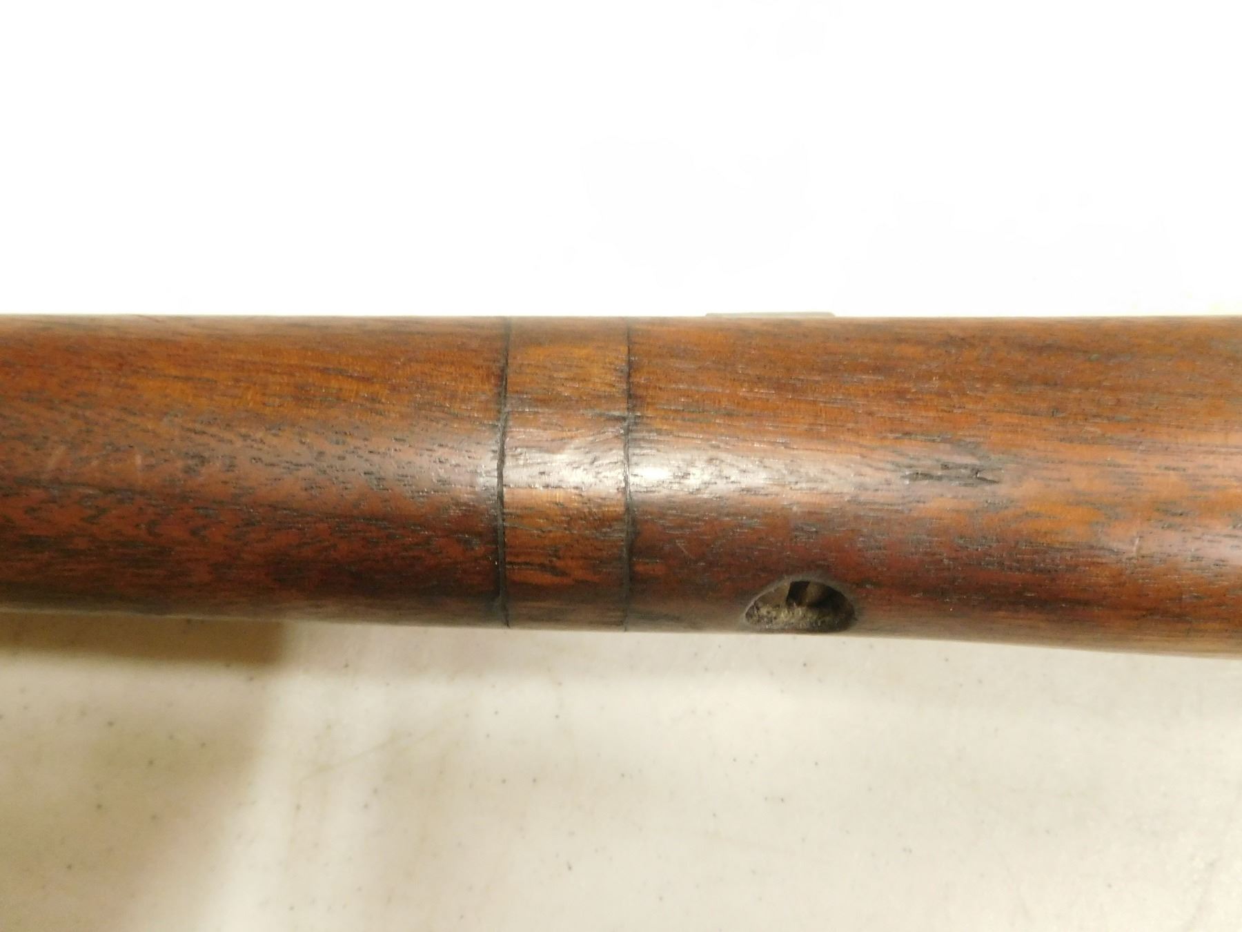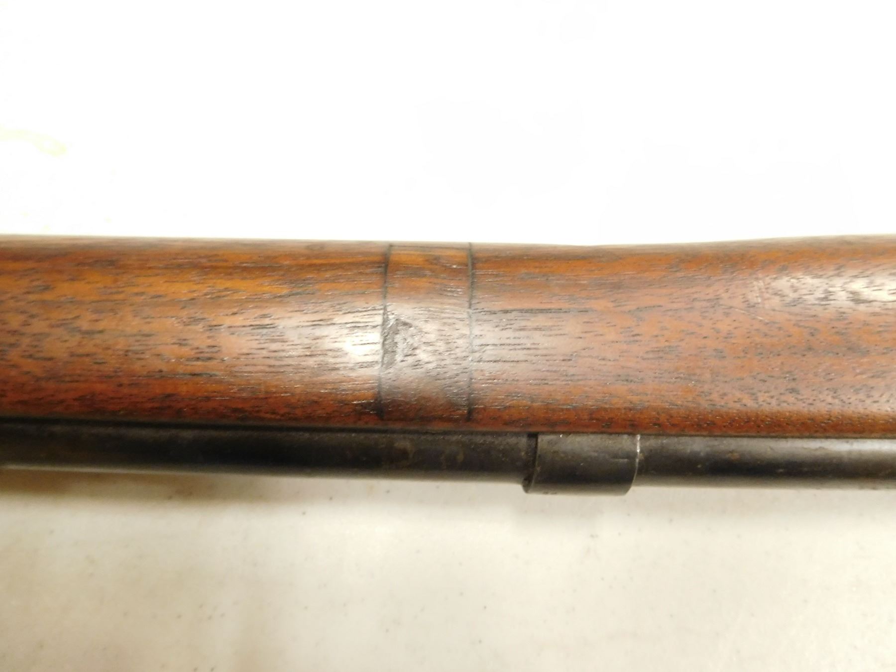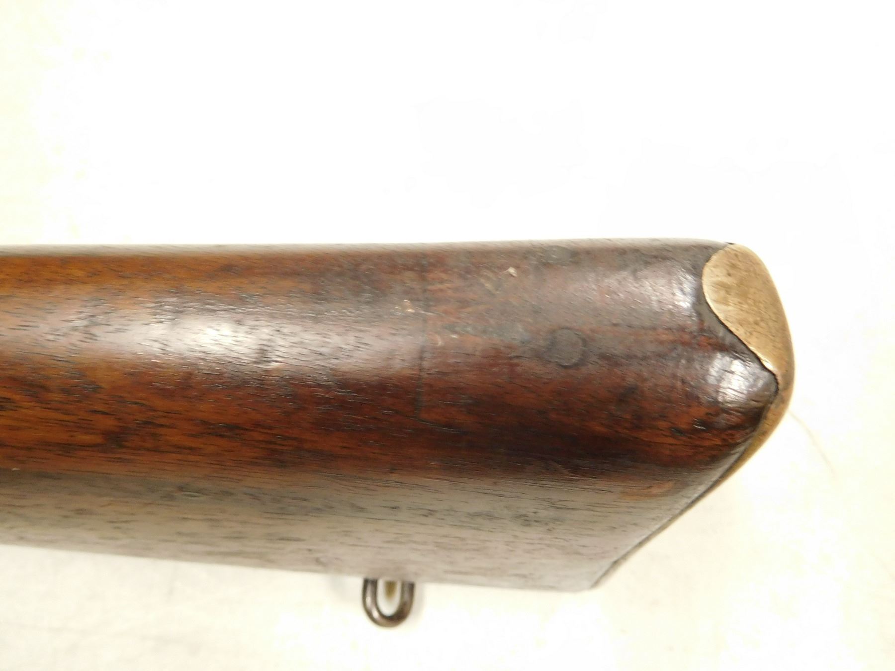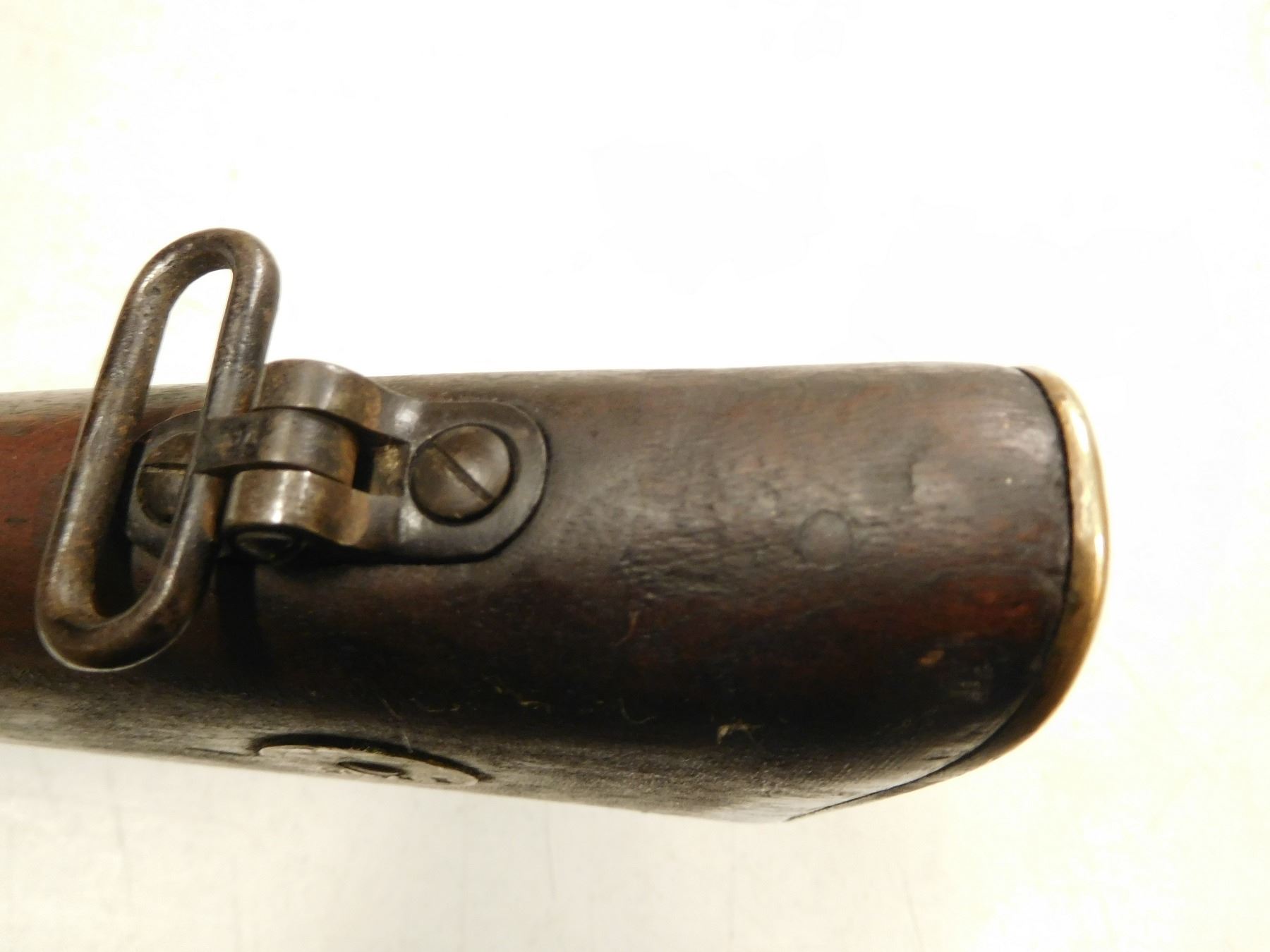 COMES WITH ORIGINAL MILITARY WOOD BOX CRATE AND MAGAZINE, A RARE FIND, BRD ARROW MARKED ON TRIGGER BAND, GOOD BORE, RAMP FRONT AND UNIQUE MILITARY PEEP SIGHT, SHOWS SOME HANDLING MARKS, ARMOURY STOCK MODIFICATIONS OR REPAIRS TO THE HEAL, TOE AND FORESTOCK, SERIAL # N8495 IS MATCHING ON RECEIVER, BARREL AND BRASS DISK, ACTION: BOLT ACTION RIFLE , BARREL LENGTH: 25" , CONDITION: 6/10 , STOCK # 7815 , CLASS: CANADIAN NON RESTRICTED CLASS