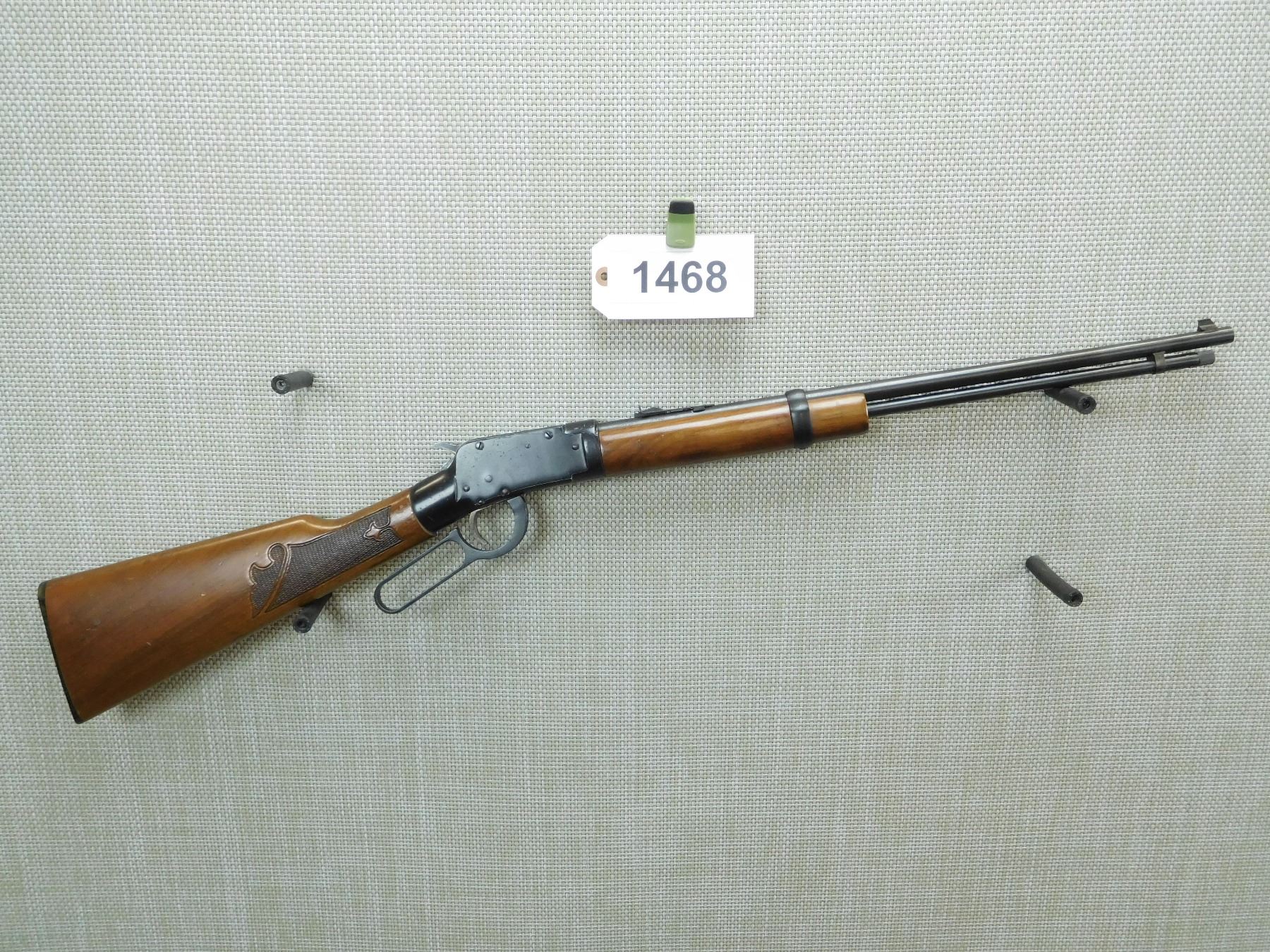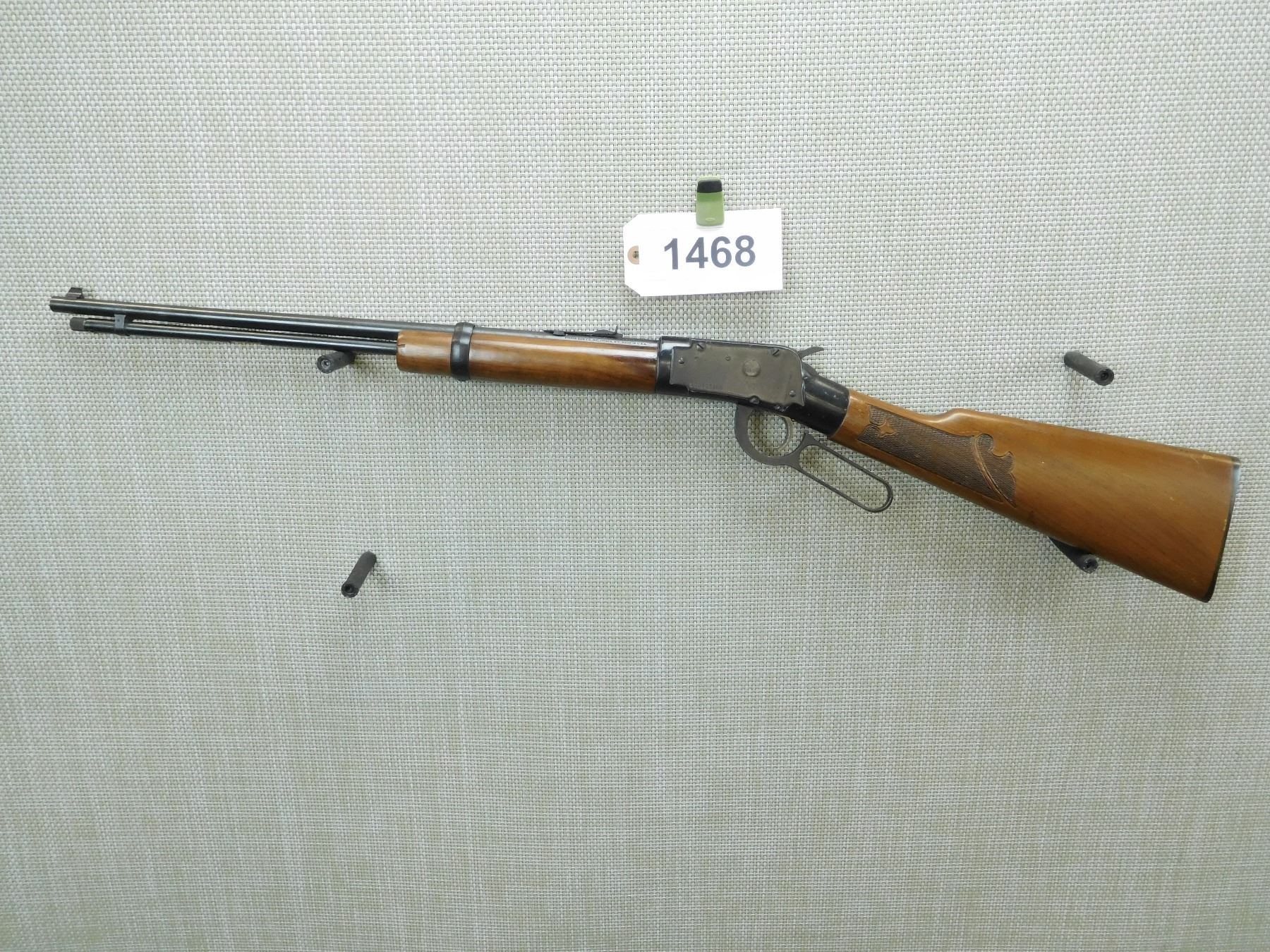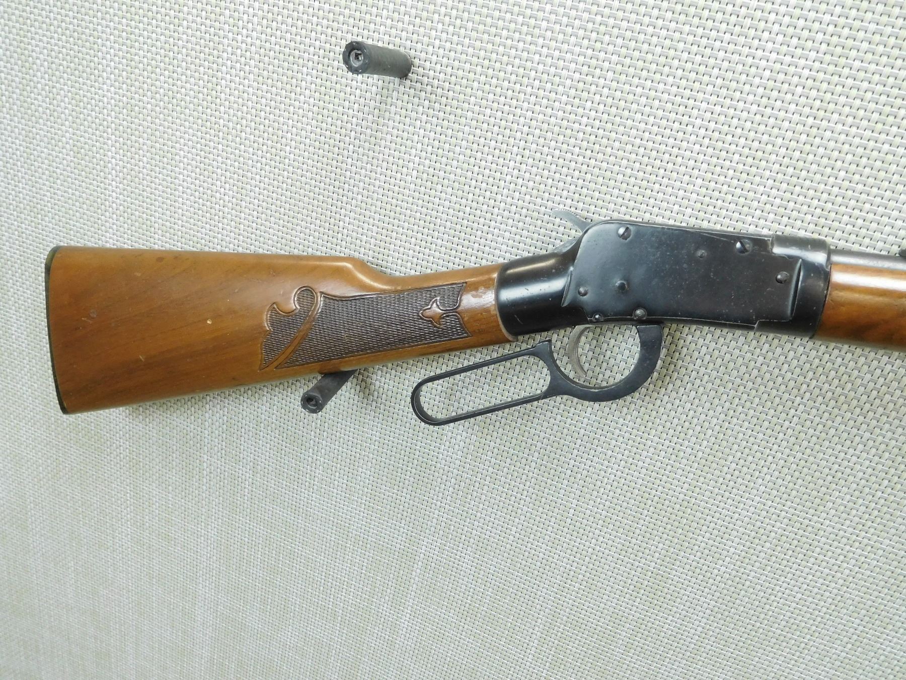 BORE IS GOOD, CHECKERED STRAIGHT GRIP STOCK WITH PLASTIC BUTT PLATE, SMALL CHIP OUT OF THE FOREND, BLADE FRONT AND ADJUSTABLE REAR SIGHTS , SHOWS SOME HANDLING MARKS , SERIAL # 500144473 , ACTION: LEVER ACTION RIFLE , BARREL LENGTH: 20" , CONDITION: 6/10 , STOCK # 7824 , CLASS: CANADIAN NON RESTRICTED CLASS
