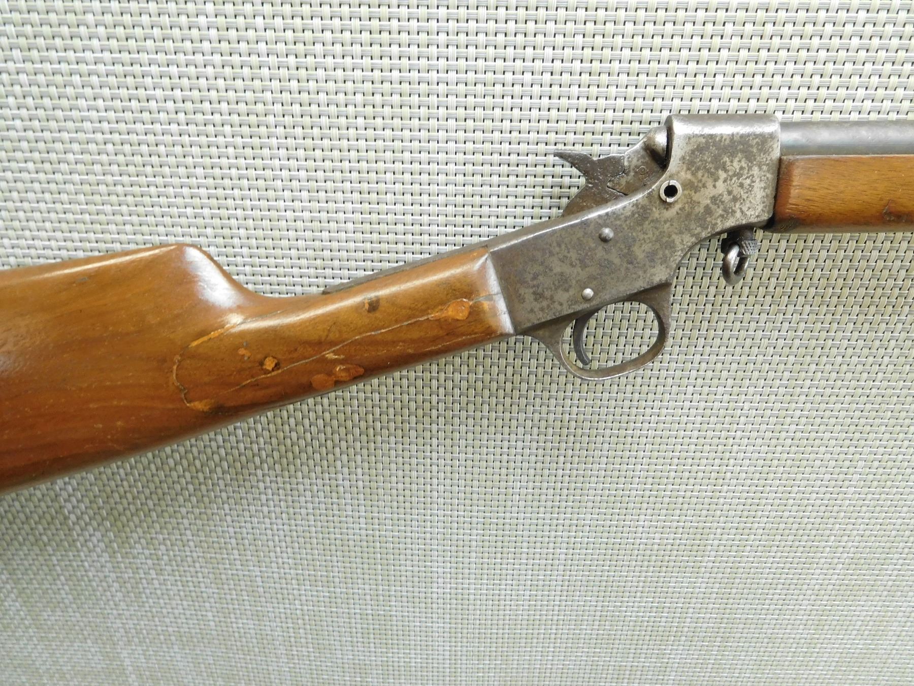 MISSING THE FALLING BLOCK ACTION KNOB, BUTT STOCK IS CRACKED AND REPAIRED, CHIPPED BUTT PLATE, ALL METAL SURFACES ARE PITTED, BLADE FRONT AND SOLID REAR SIGHT, DARK BORE, SHOWS EXTENSIVE HANDLING MARKS , SERIAL # N/A , ACTION: FALLING BLOCK ACTION , BARREL LENGTH: 20" , CONDITION: 3/10 , STOCK # 7850 , CLASS: CANADIAN NON RESTRICTED CLASS