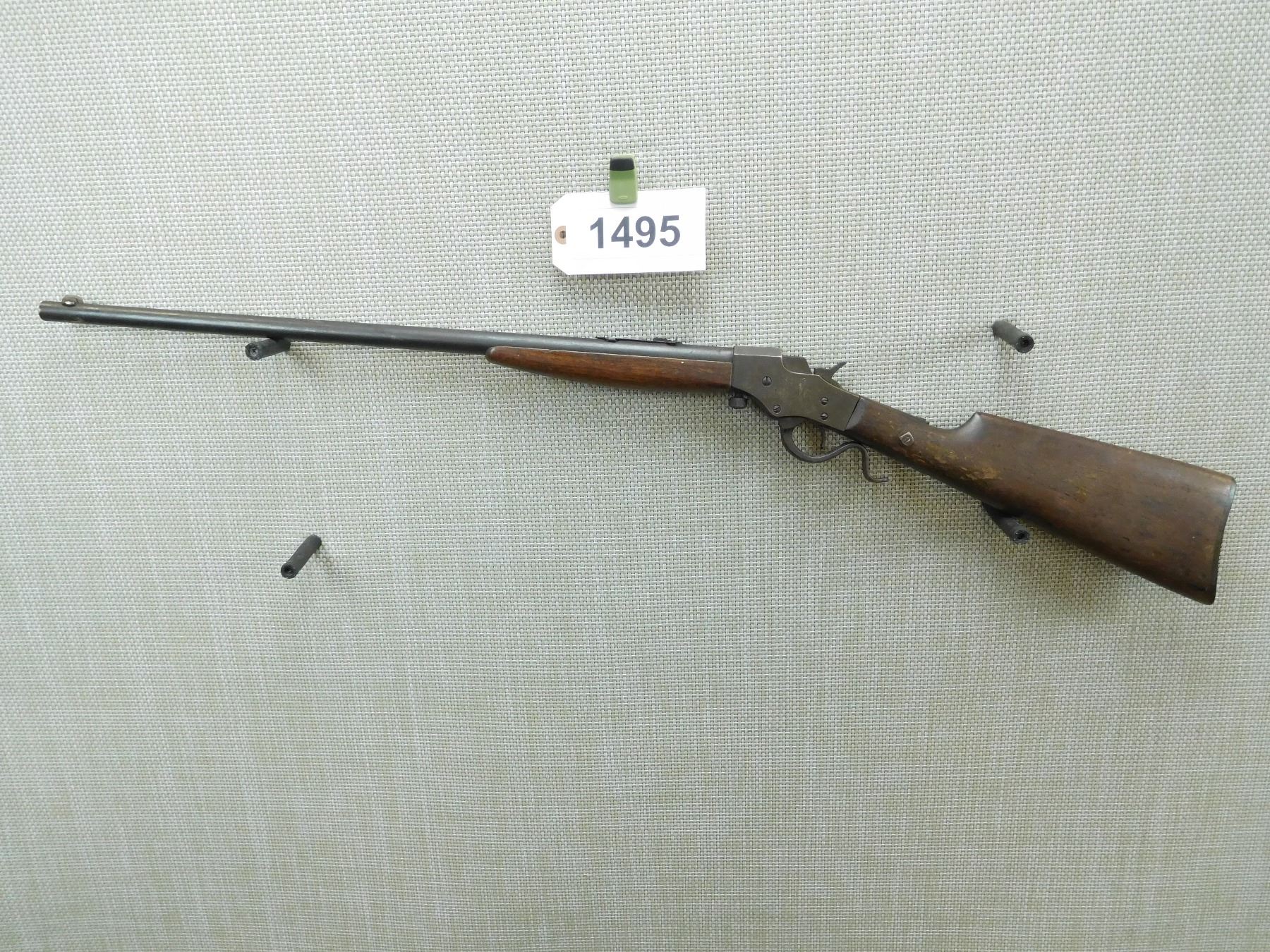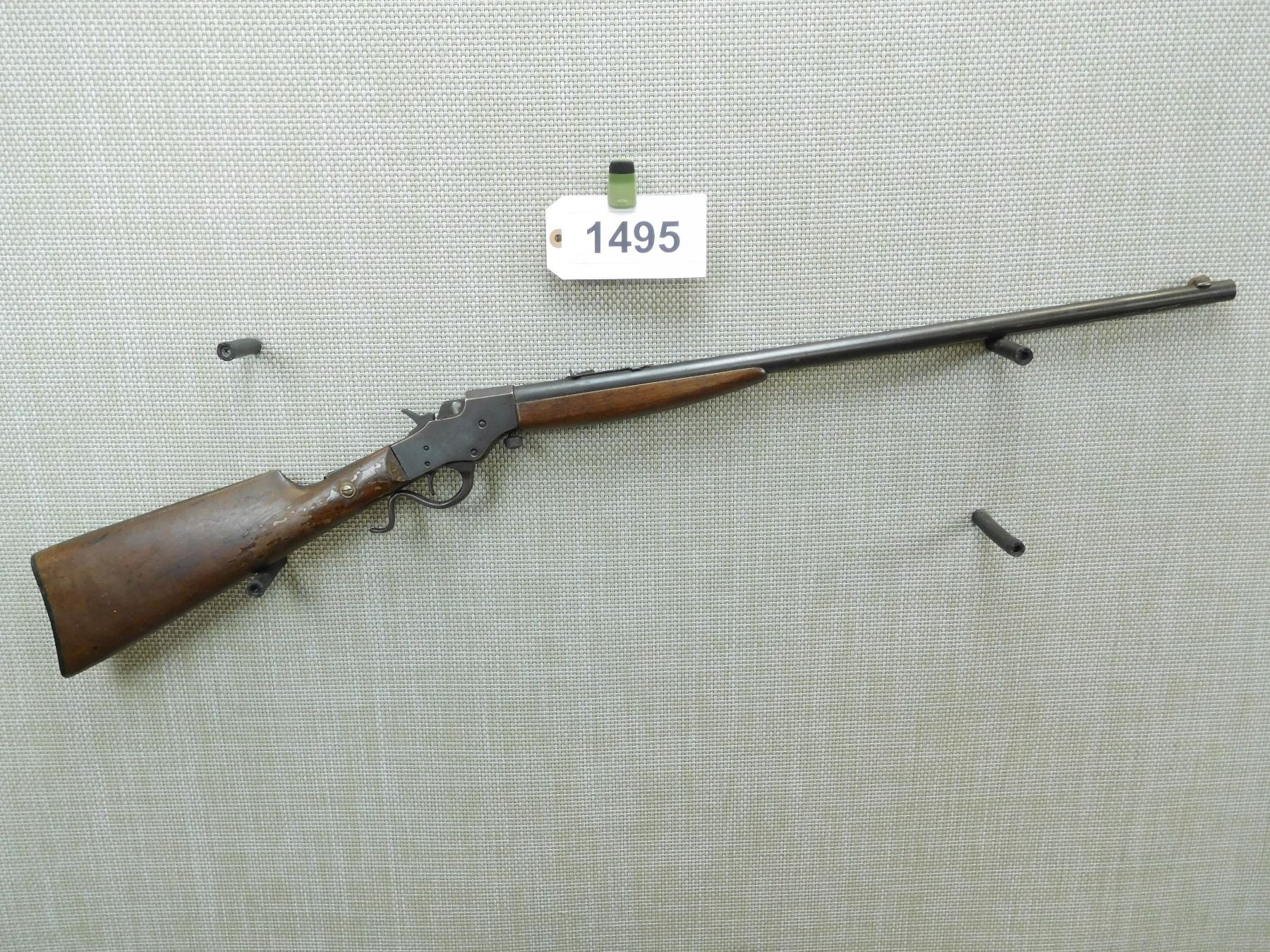GOOD BORE, BLADE FRONT AND ADJUSTABLE REAR SIGHTS, BUTT STOCK HAS BEEN REPAIRED AT THE WRIST, REPLACED TANG SCREW, PLASTIC BUTT PLATE IS INTACT, SHOWS EXTENSIVE HANDLING MARKS , SERIAL # A542 , ACTION: FALLING BLOCK ACTION , BARREL LENGTH: 24" , CONDITION: 3/10 , STOCK # 7851 , CLASS: CANADIAN NON RESTRICTED CLASS
